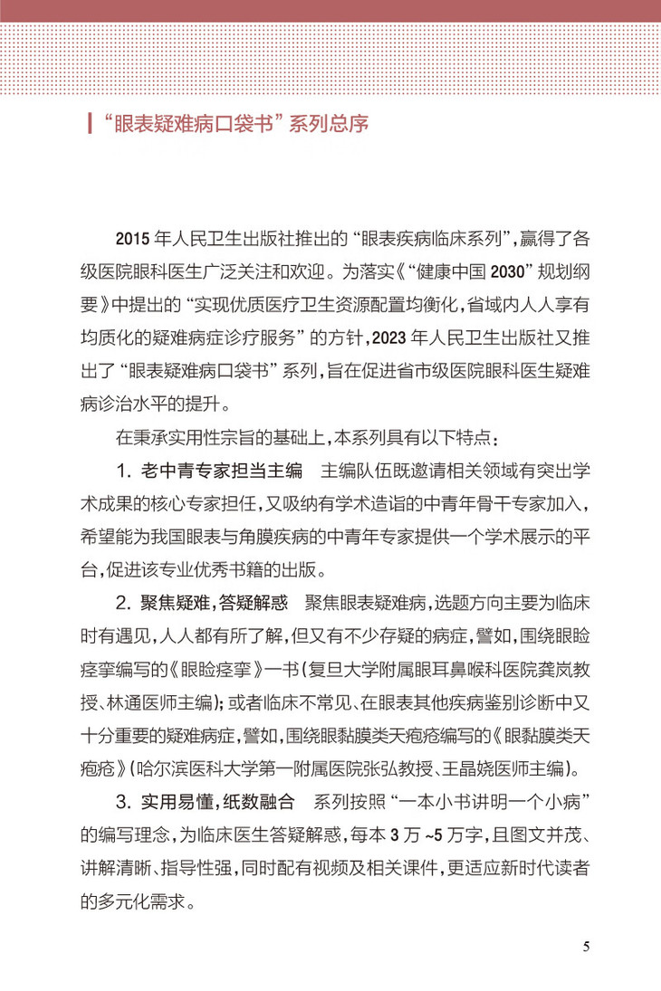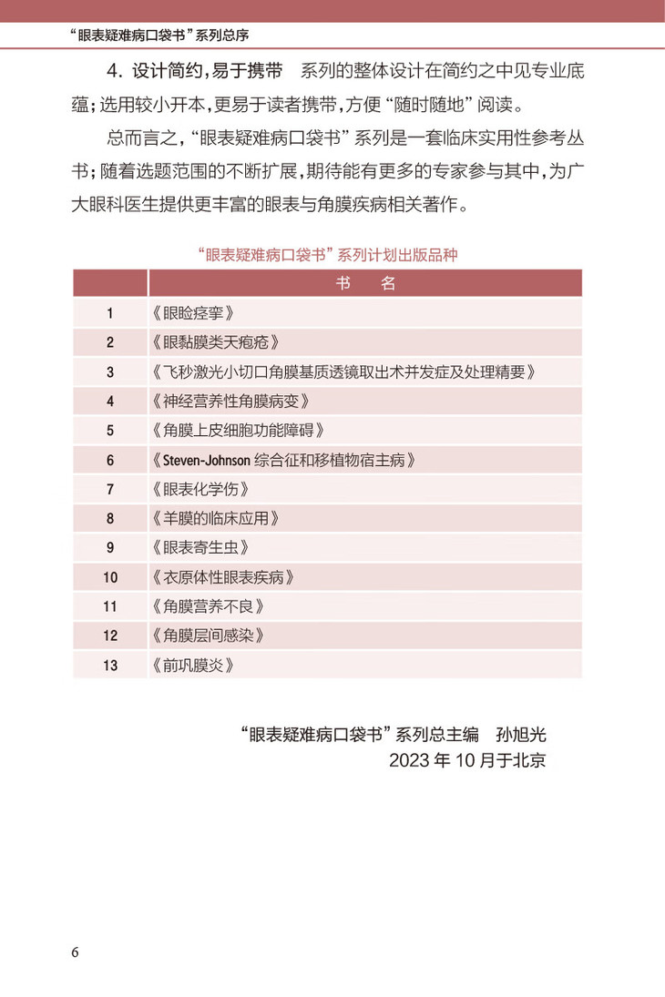 2.本书为“眼表疑难病口袋书系列”第一本成稿著作,本系列总主编为原北京同仁医院孙旭光教授,各本内容集中一类或两类眼表相对少见病、疑难病,计划作为系列口袋书发行(整体策划,统一安排编写时间,保证尽量同时交稿,单本定价,可单本或整套购买)。各本篇幅:2~5万字。目前策划品种(共11本):1 眼睑痉挛-龚岚(上海五官),2 神经营养性角膜病变- 田磊 (同仁),3 角膜营养不良- 刘畅(爱尔) , 4 类天疱疮-张红(哈尔滨医大),5 SJS和GVSHD- 李明武(北医),6 眼表寄生虫-余曼 孙旭光(四川医大),7 衣原体性眼表疾病-邓世靖(同仁)8 角膜上皮细胞功能障碍-曲景灏 (北医),9 角膜层间感染- 孙旭光 张阳(同仁),10前巩膜炎-方严 孙旭光,11眼表化学伤的处理-王丽强(解放军总医院)。