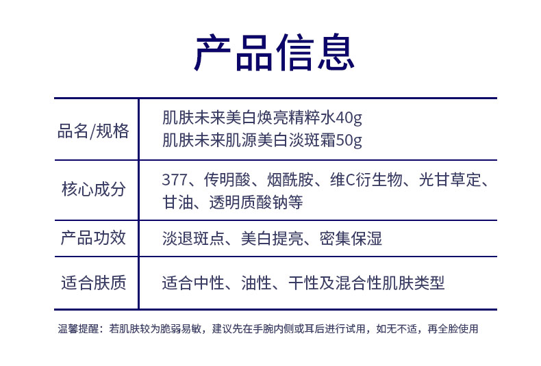 【品名】 肌源美白祛斑护肤礼盒 【品牌】肌肤未来 【规格】美白焕亮精粹水40g+肌源美白淡斑霜50g 【效期至】2026.11月 【温馨提示】因显示器,拍摄光线,角度不同存在些许色差,请以收到的实物为准,色差情况属正常情况。 【发货地】浙江 【发货时间】3个工作日内发货,周六日及节假日顺延 【不发货地区】新疆,西藏、港澳台不发货 【加收地区】内蒙古,青海、甘肃、海南、宁夏加收10元 【售后问题】不影响二次销售支持7天无理由退换,签收后质量问题24小时联系客服哦