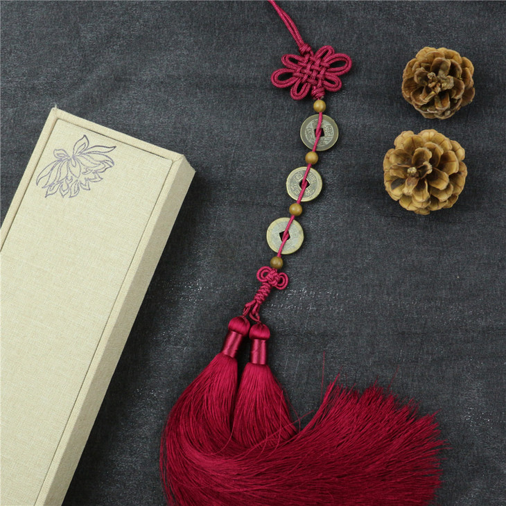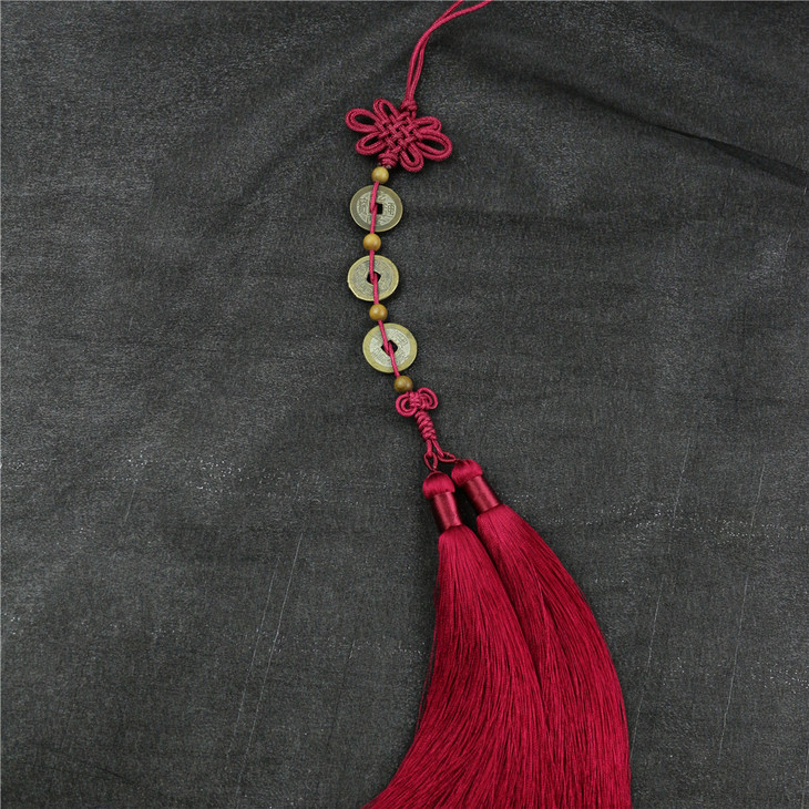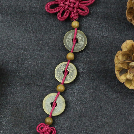 九方禾谷精心挑选品相良好的“乾隆”、“道光”、“嘉庆”三种铜钱精心编制而成迎春吉祥挂饰,
