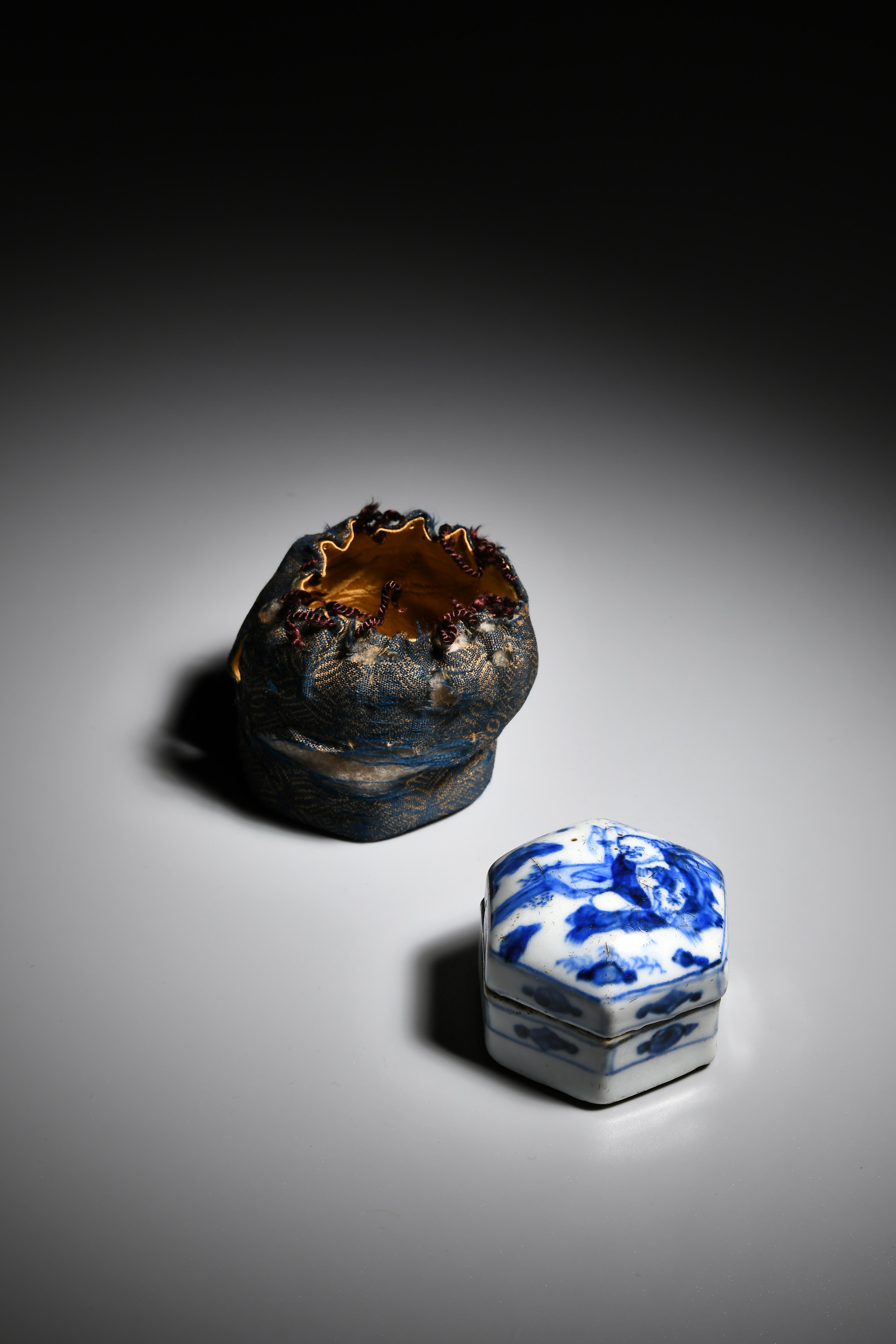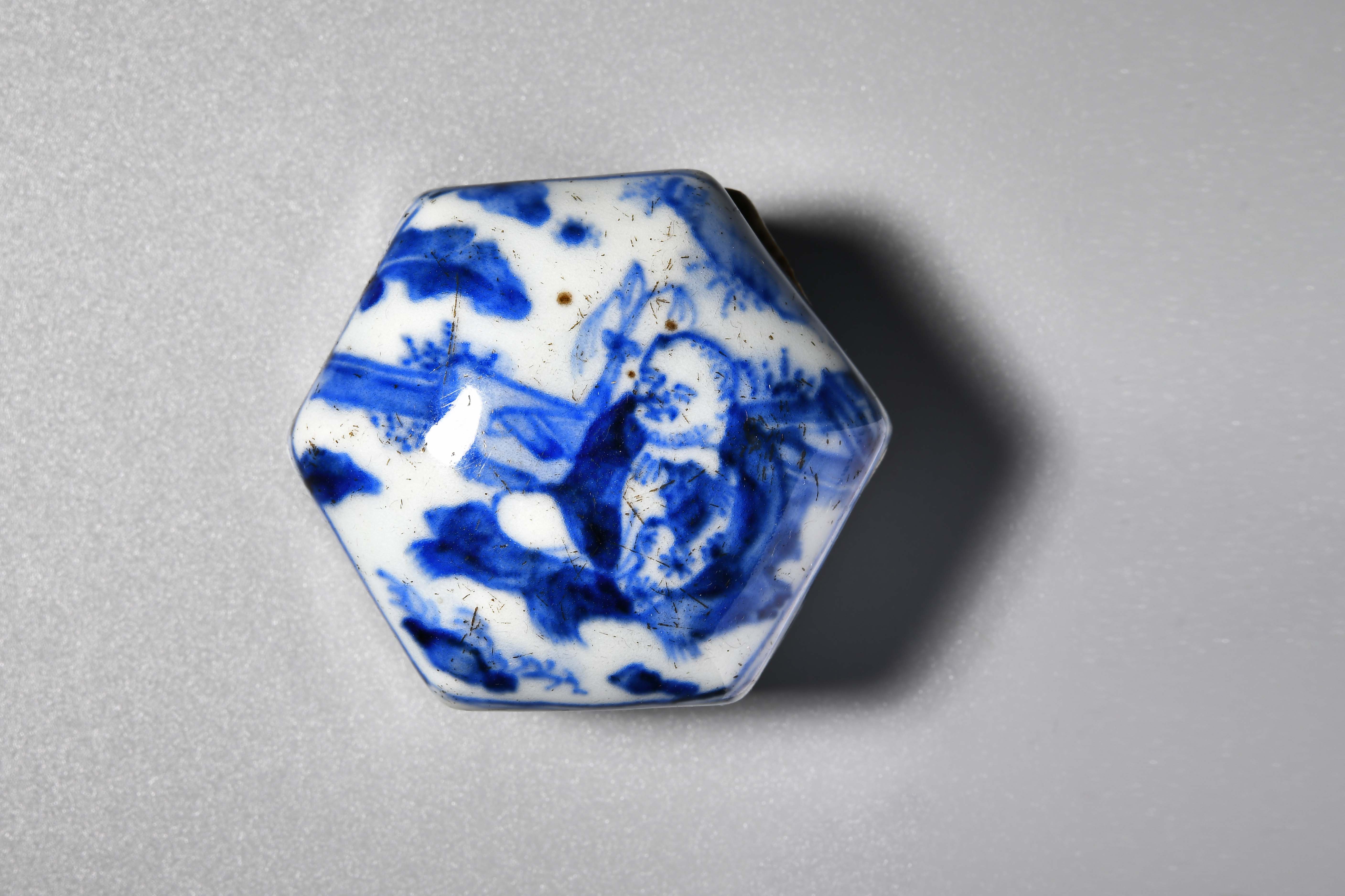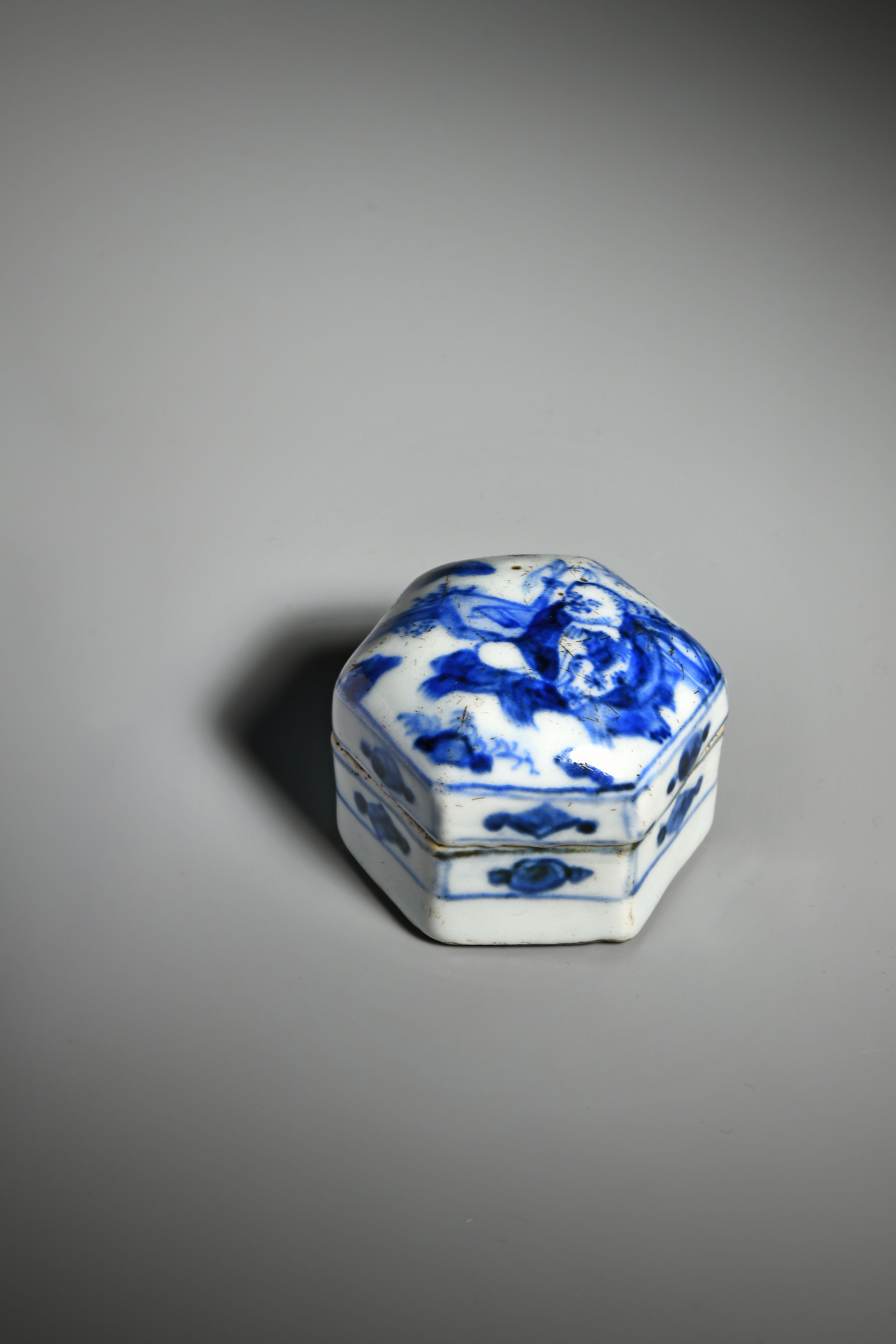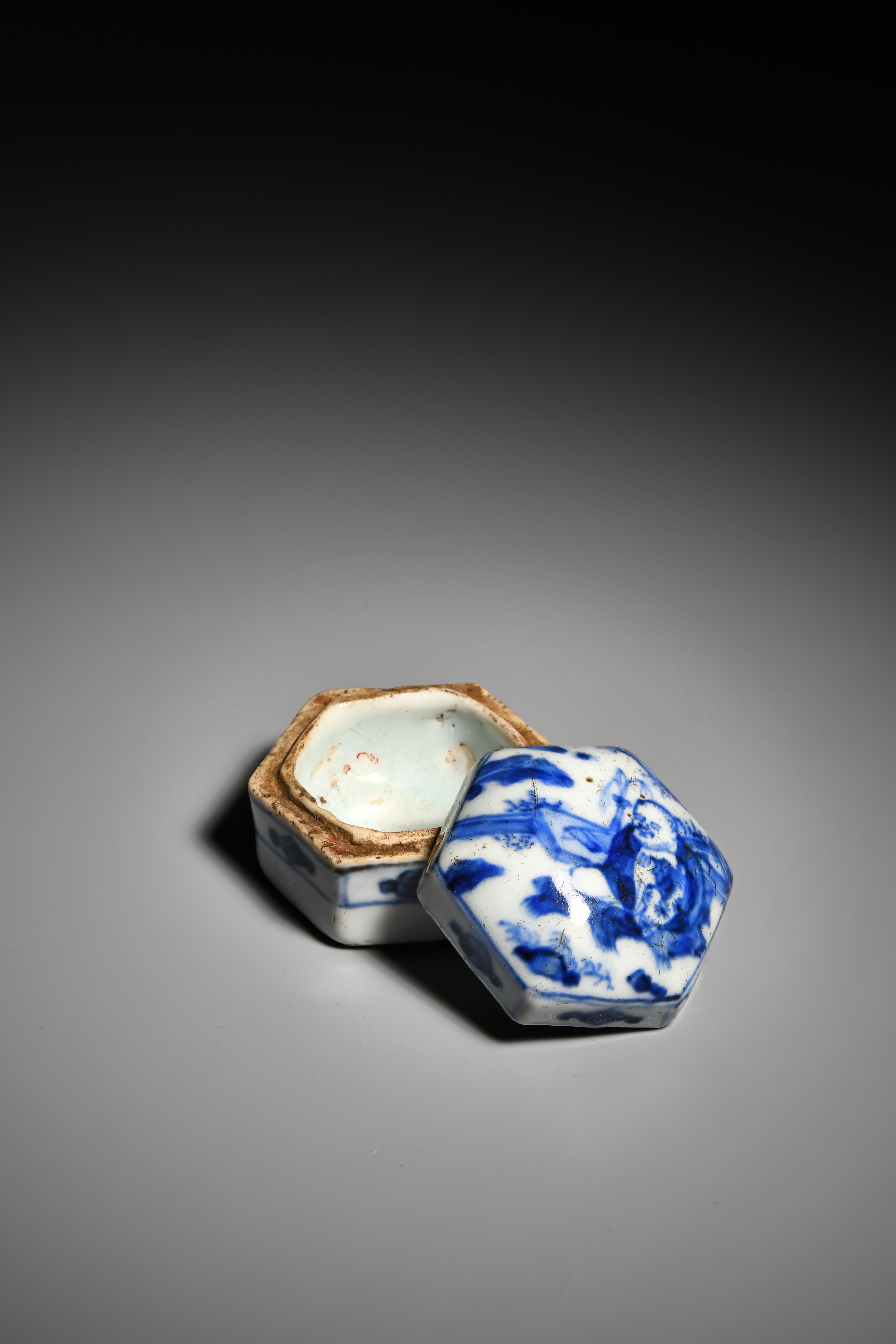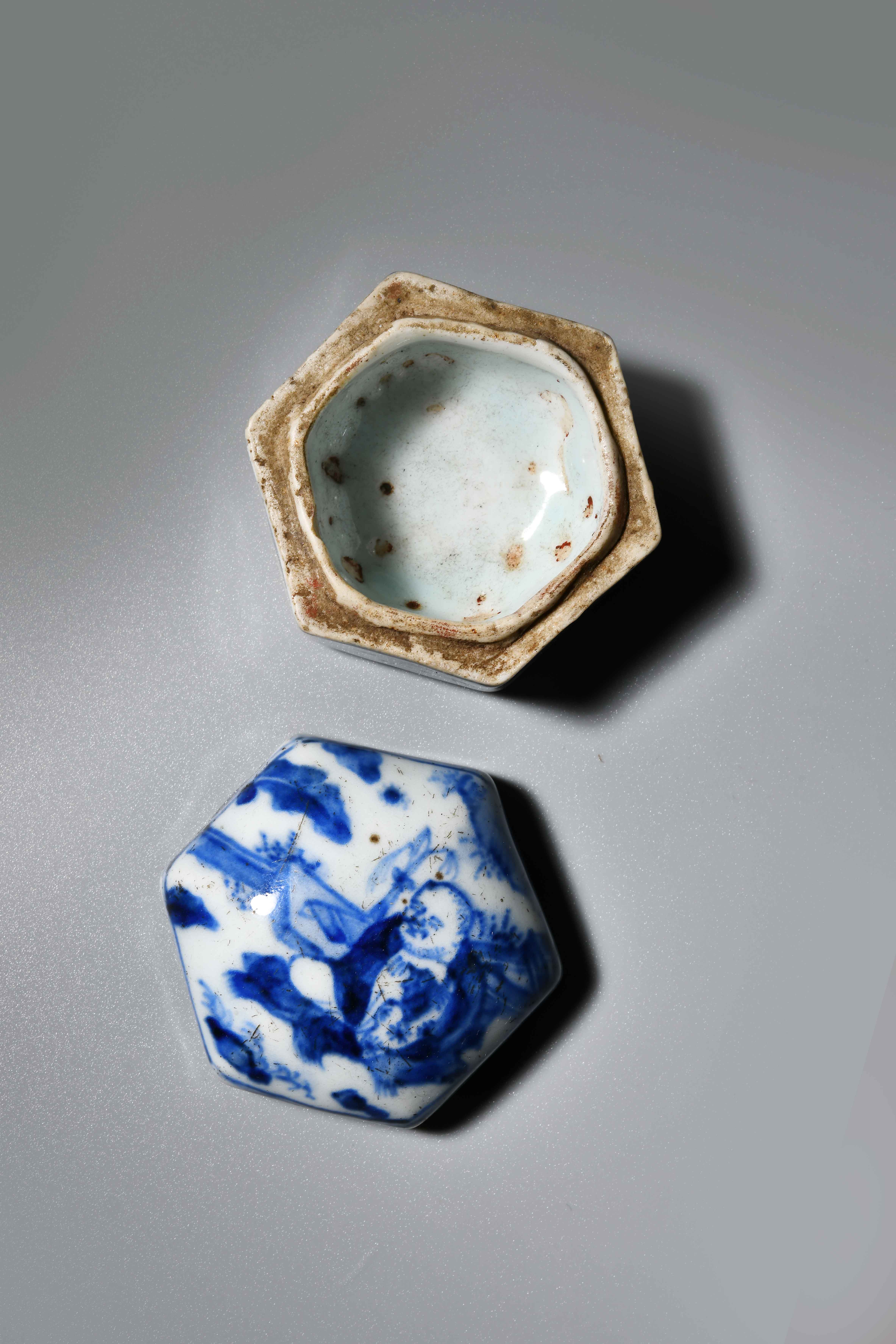 此青花香盒為六角柱形,盒蓋為飽滿之弧形,繪有一老翁於林中席地而坐,香盒側邊飾有花紋,盒蓋接觸面無上釉,盒底平面無釉。