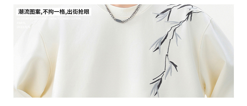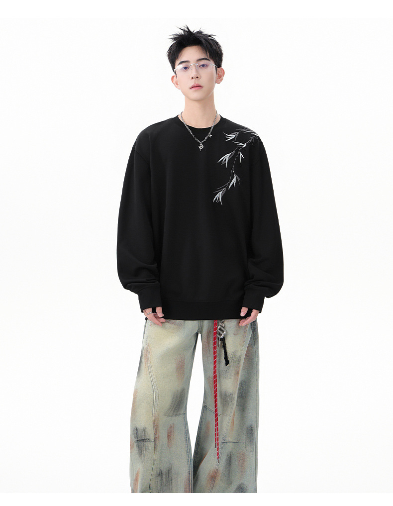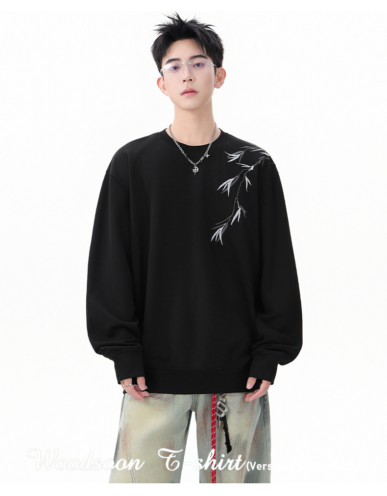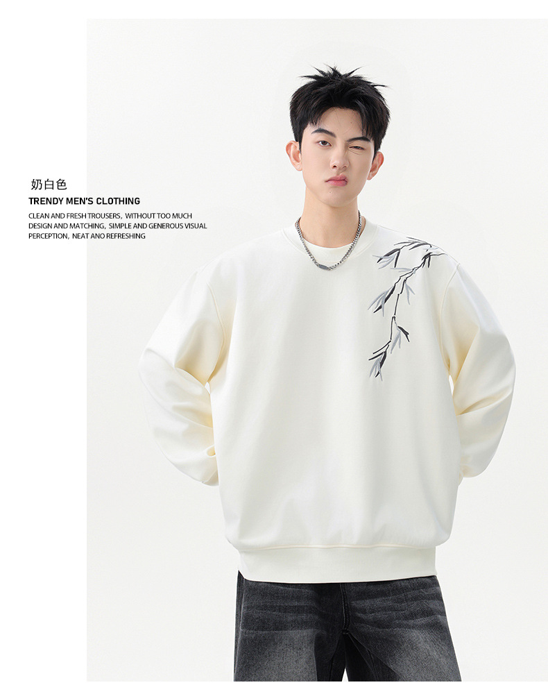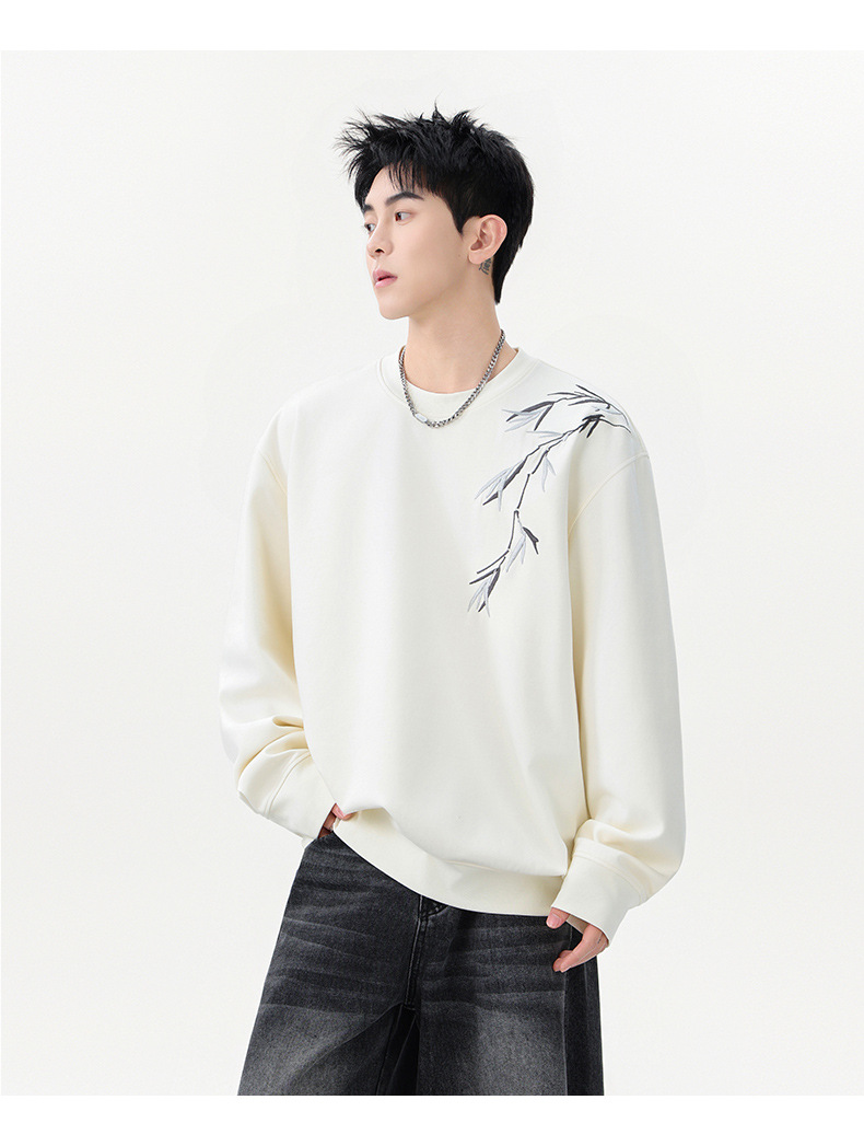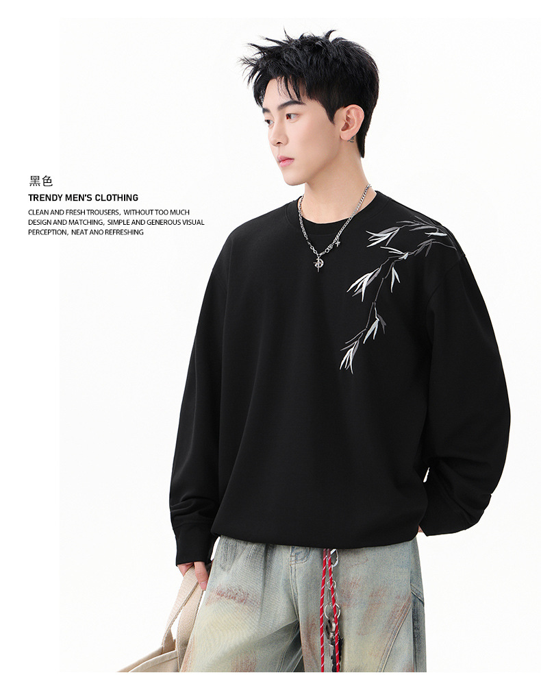 国潮新中式竹子刺绣卫衣男款春季落肩袖宽松圆领长袖春秋男士上衣