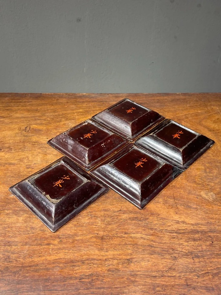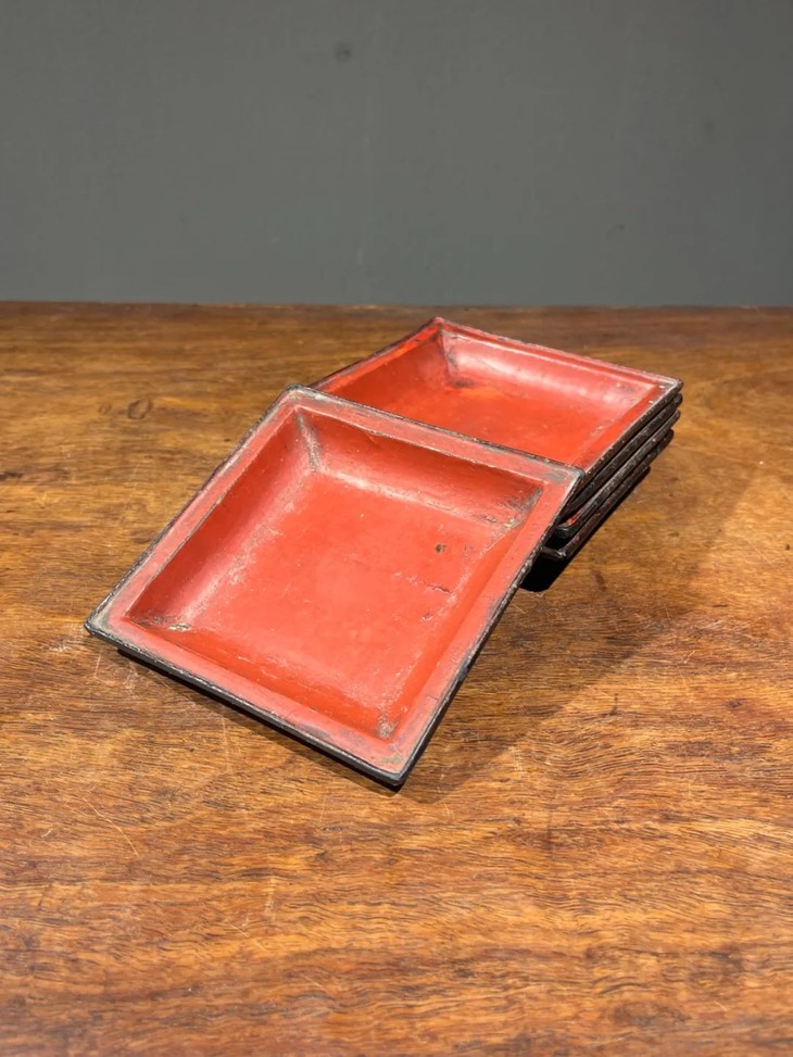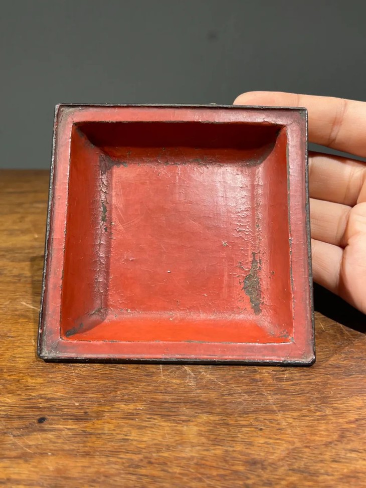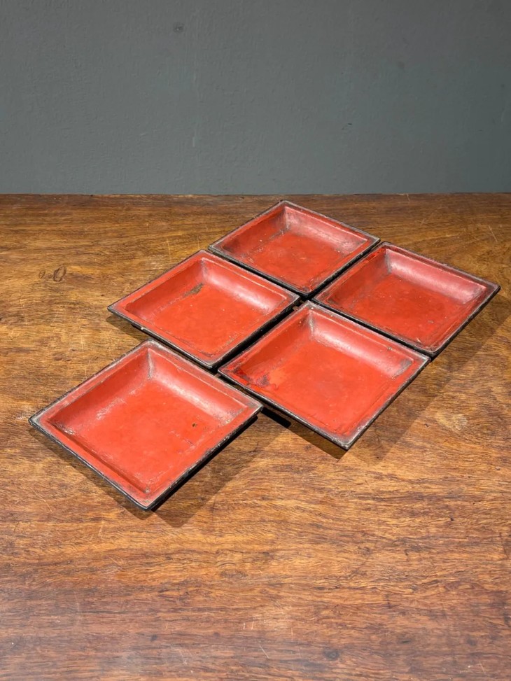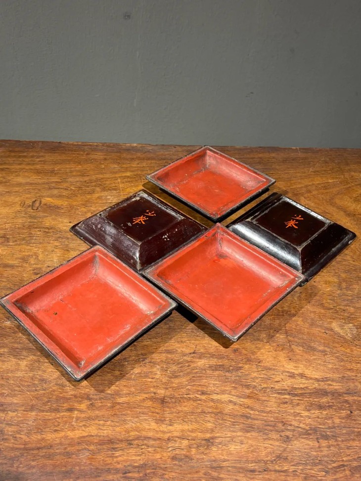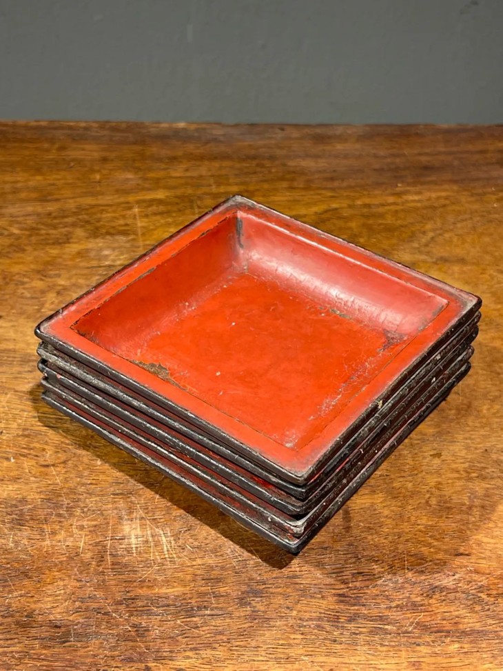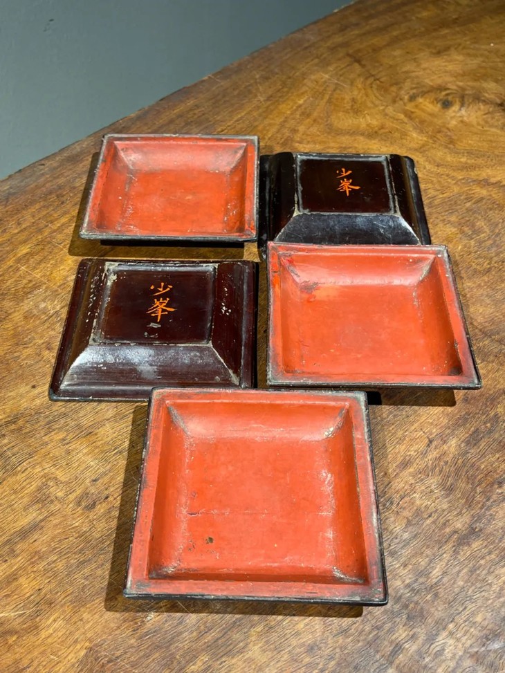 这是一套以硬木为胎髹红褐大漆而成的正方型折沿碟五件套组,是早期文人品味风格的茶席盛茶点的小碟,底部制作工坊款:”少峯”。