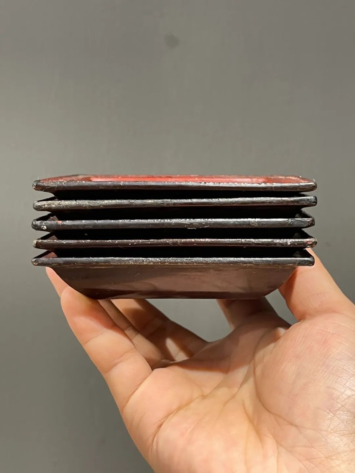 此套木胎红褐大漆方碟五件套组,如图所示,除边沿漆皮有些脱落与细微磕碰外,此五件套组方碟保存完好。