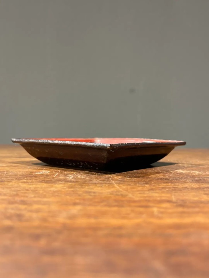 此套木胎红褐大漆方碟五件套组制作精美,造型简约典雅,髹红色与褐色大漆明亮柔美,历年使用痕迹清晰可见,日本茶道界俗称“果子 器”的盛茶点小碟,是茶席的重要器具。此盘组方碟简约大气的造型,整体设计比例和谐精緻,实用器具却如此讲究,令人耳目一新,”少峯”工坊款识书法刚劲挺拔。