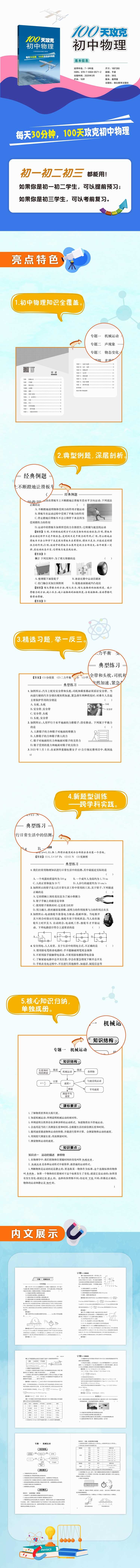 本书深度聚焦初中物理学科本质,讲练结合,以练为主。同时,还配有高频考点速记手册,方便学生记忆背诵。本书主要目标是让学生短时间内高效攻克学科核心问题,拒绝盲目刷题,只需每天30分钟,即可实现100天从知识重构到思维跃迁的蜕变飞跃!