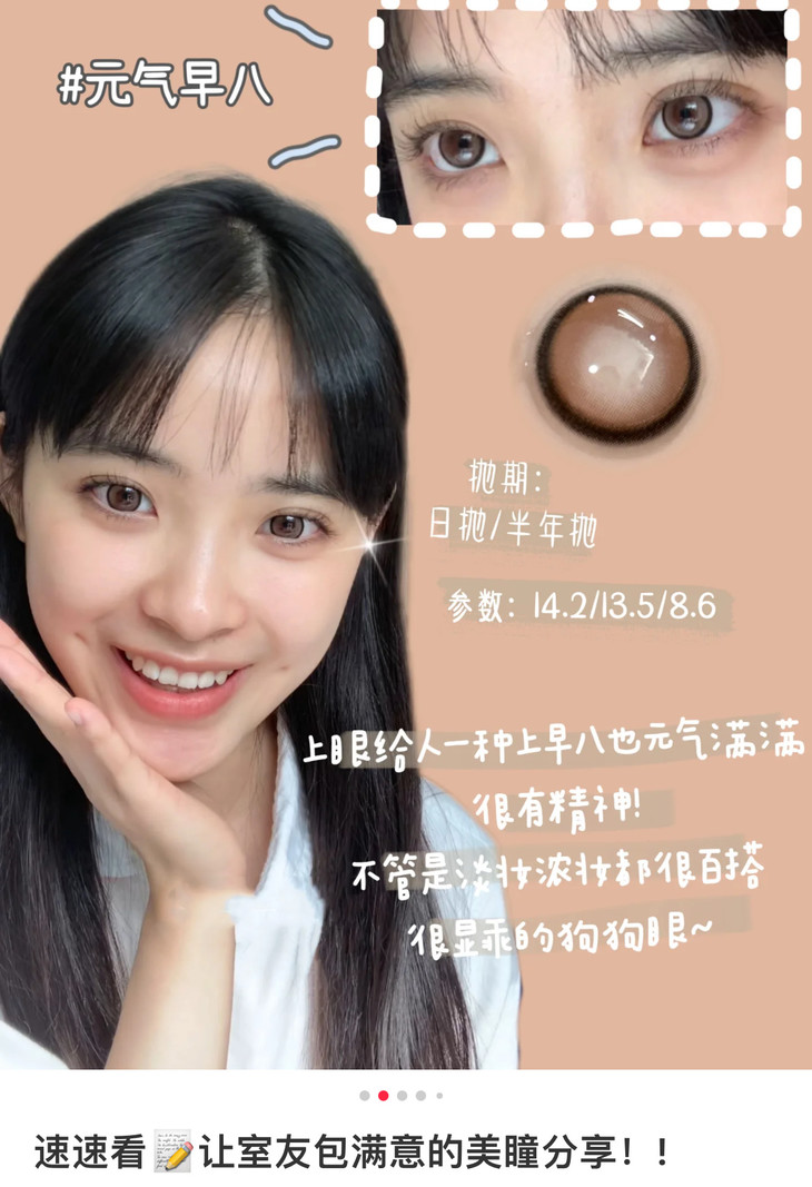 美瞳有五色可选,元气早八褐、课后落日黄、桃学乌龙棕、怦然心动紫、校园蓝衫蓝,每一种都超美,直径14.2,着色是13.5,刚刚好,不会大到像鬼,是很自然的眼珠子!元气早八褐,日常色,超温柔的,而且各种妆容发色都能搭;课后落日黄,会更柔和些,就像夕阳下的眼眸,非常有氛围感;桃学乌龙棕,这个颜色真的喜欢,浅浅的,但又不会失真,会让眼睛显得更大,气质拿捏;怦然心动紫,神秘又浪漫,搭上千禧风,绝对的焦点哦;还有校园蓝衫蓝,清新又减龄,是非常安全的颜色,不会出错!我有留桃气乌龙和校园蓝衫蓝,都很爱!而且镜片超薄的,中心厚度只有0.06mm,柔软又轻薄,舒服!