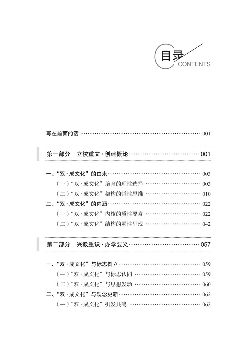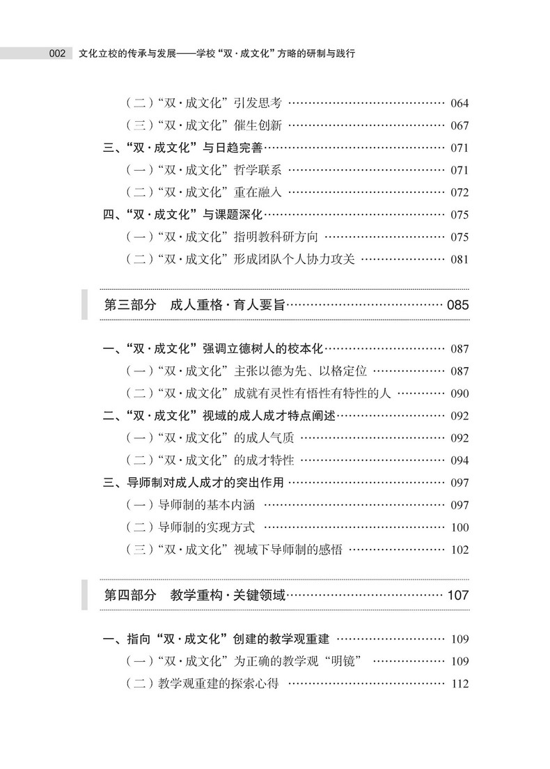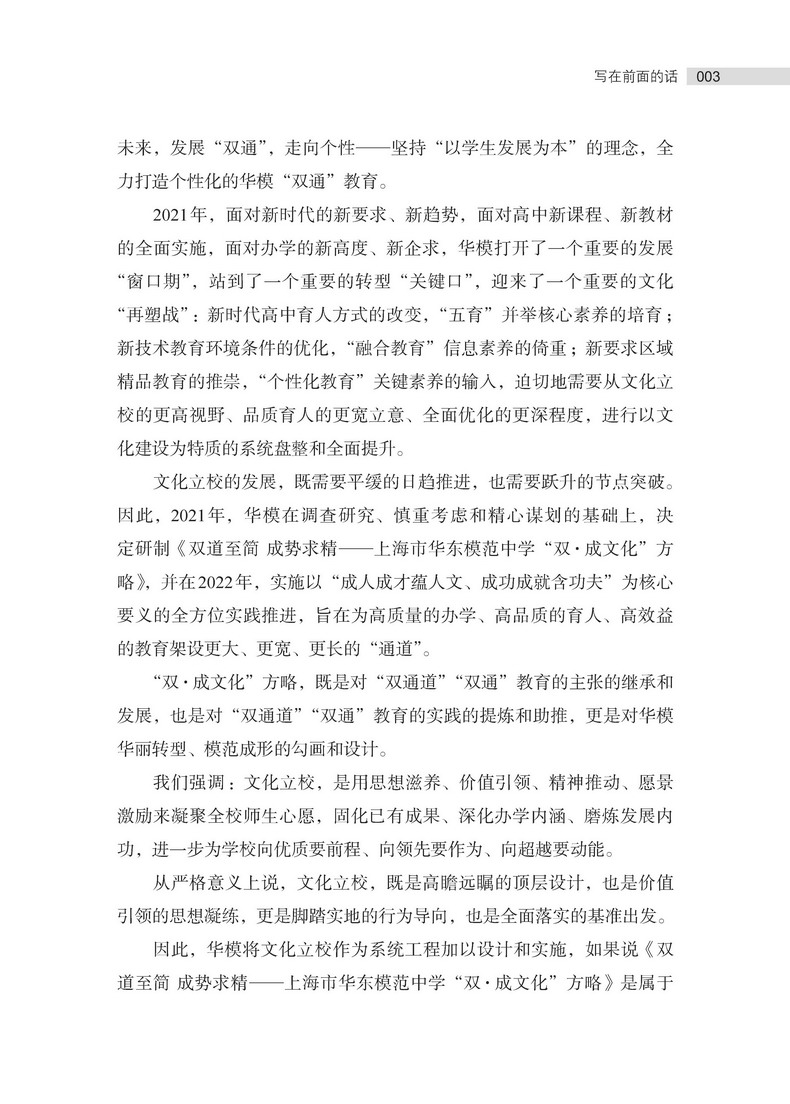 本书是上海市华东模范中学徐怡敏校长积十余年办学经验的智慧结晶。全书分为;立校重文创建概论;兴教重识办学要义;成人重格育人要旨;教学重构关键领域;评价重质全面发展;办学重品前瞻未来六个部分,详细阐述了上海市华东模范中学在办学历程中,如何以文化立校为引领,通过研制并践行;双成文化方略,推动学校教育质量与育人水平的全面提升。