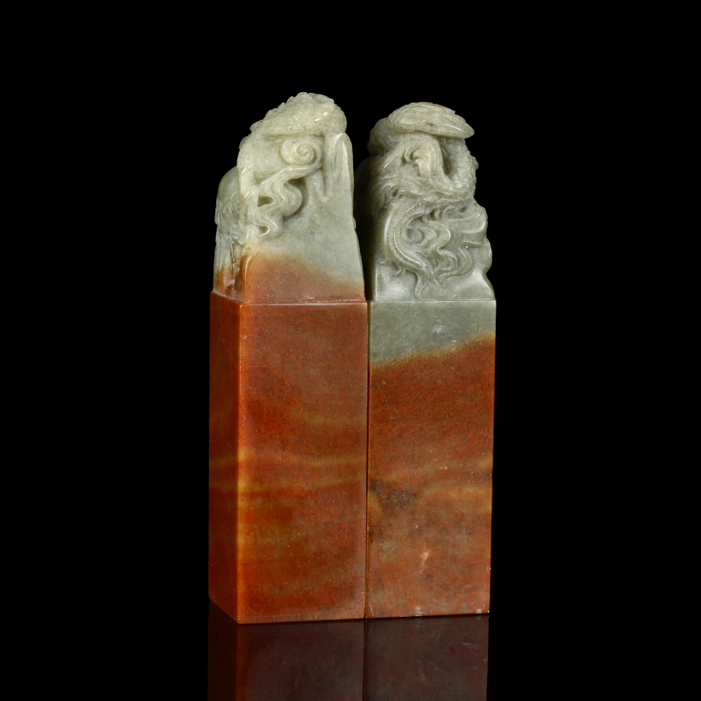 孤品016941-印度石俏色龙凤钮对章-2.5*2.5*9.8cm