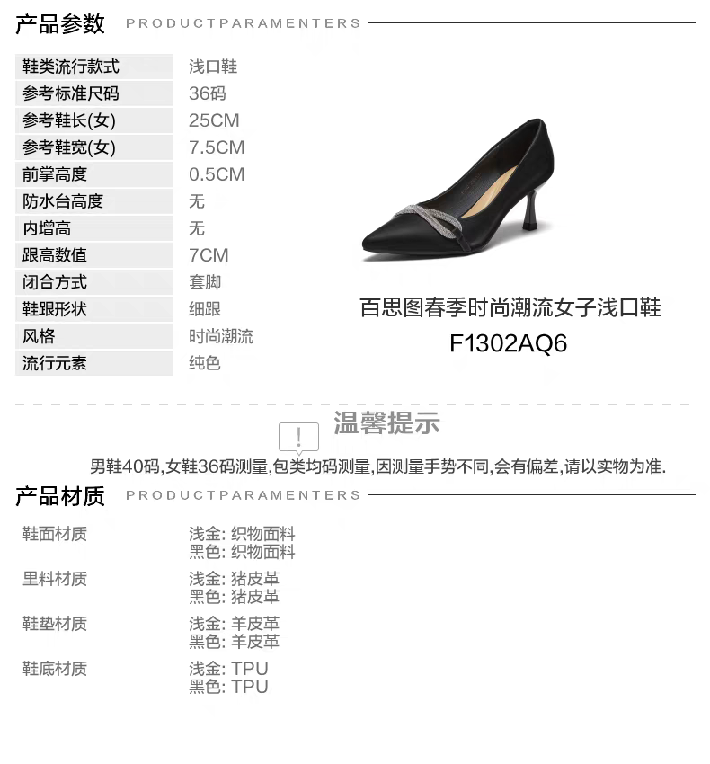 【百思图】BF楼百思图2026春新款气质黑色细跟高跟鞋尖头女浅口单鞋F1302AQ6吊牌价699.现价339