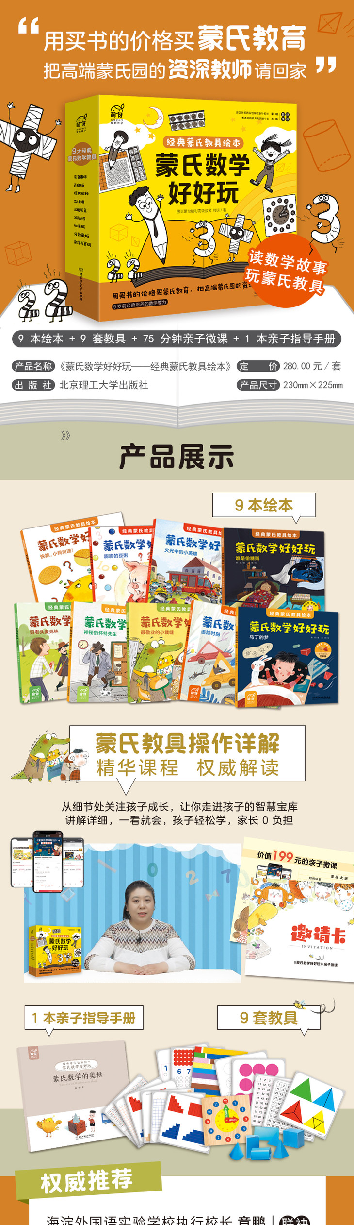 经典蒙氏教具绘本《蒙氏数学好好玩》9本绘本+9套教具+75分钟亲子微课+1本亲子指导手册