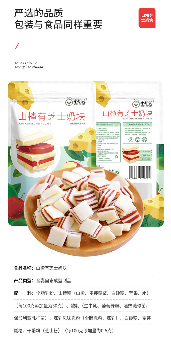 小奶花山楂芝士片,将传统的草原奶酪和山楂融合,是在蒙古族的传统吃法上的小升级。精选中国乳都优质鲜奶源,再加上东北新鲜红果做浆压缩成片,酸而不苦,甜而不涩,口感丝滑,能很好的降低奶酪带来的甜腻感。制作过程中,不添加植脂、色素、香精、防腐剂及额外的白砂糖,简单完美地保留了奶酪的醇厚香甜,以及山楂的酸甜可口,好吃又健康!