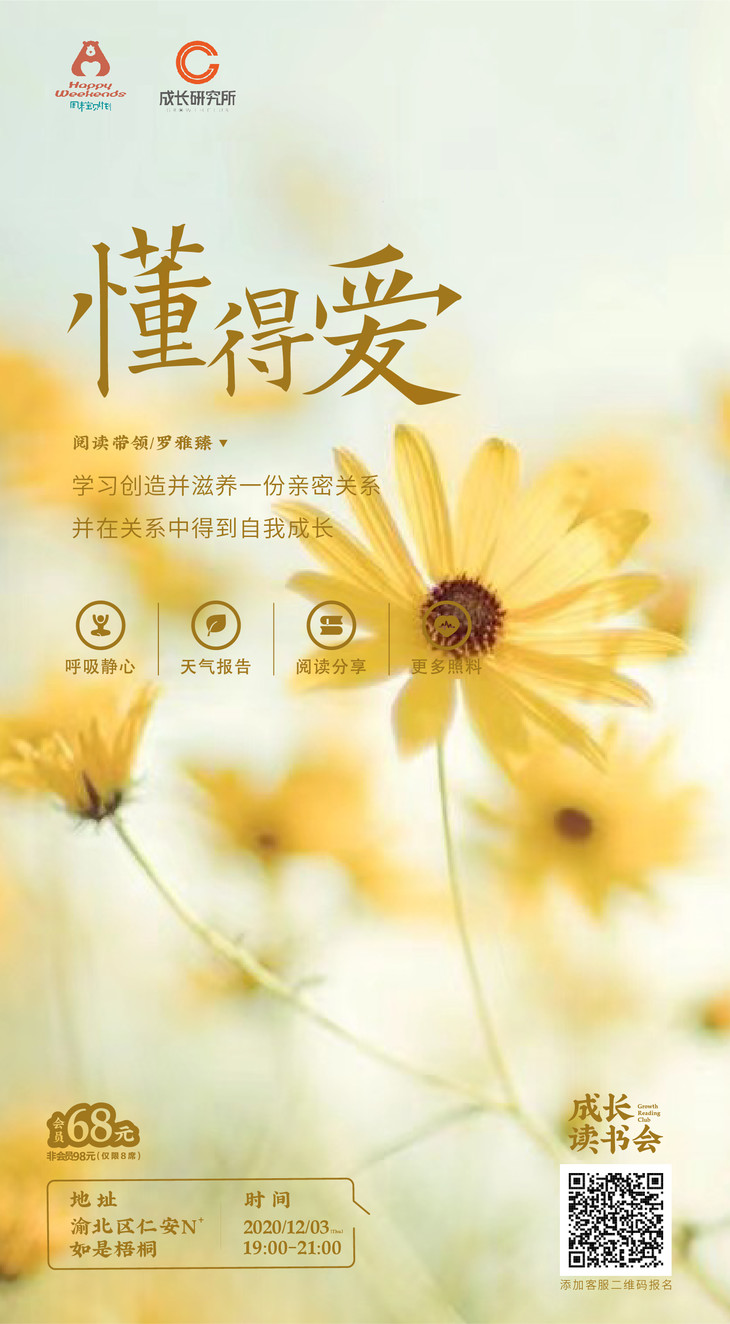 本次读书会,我们可以在罗雅臻老师的领读下,去审视在关系里的我们,将看到内心最深层的渴望、过去未了的创伤和长期发展的模式,这同时也是我们突破自我和深度发展最好的试练场。