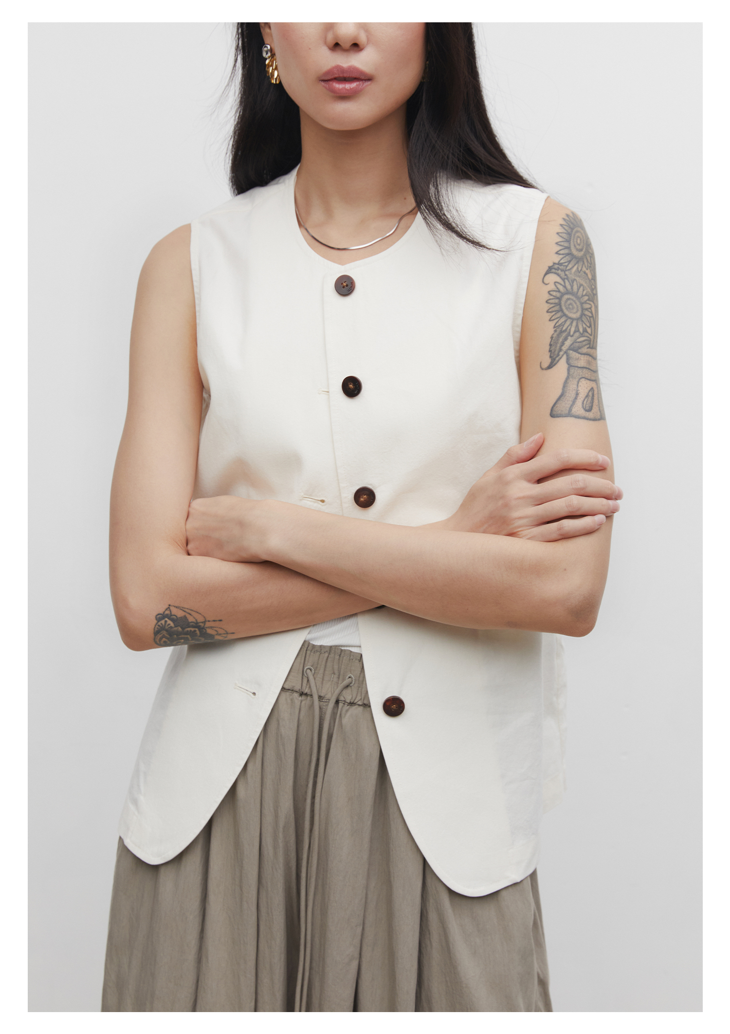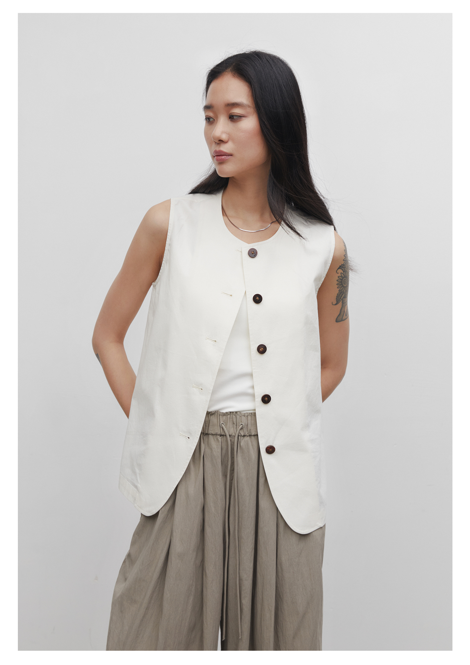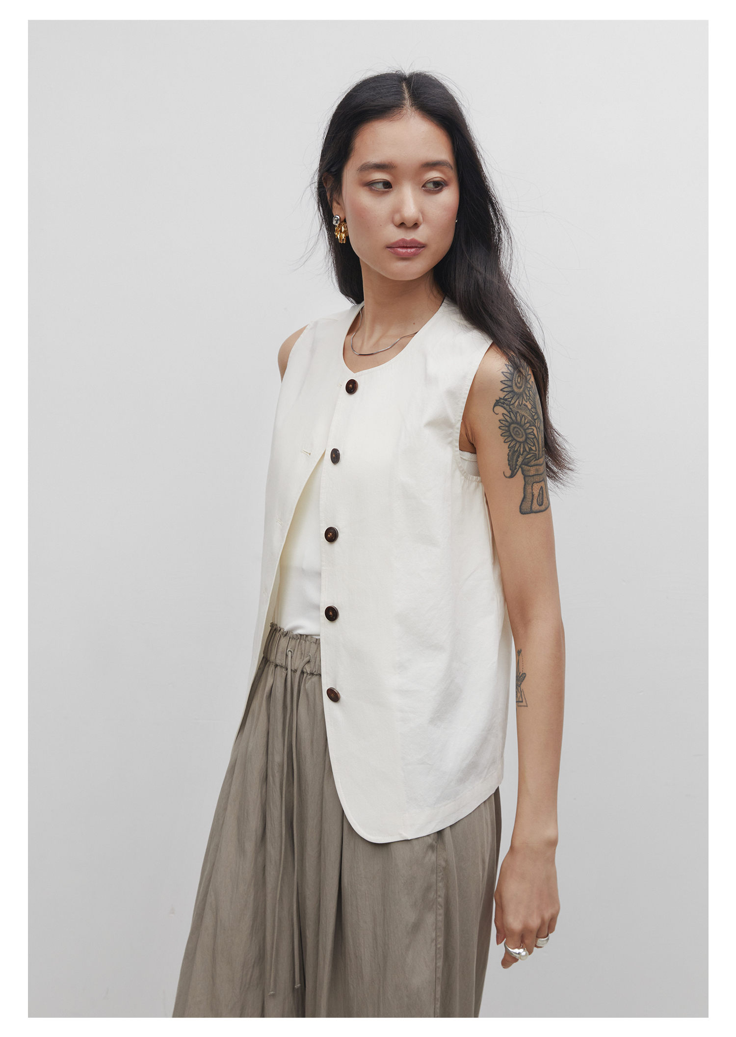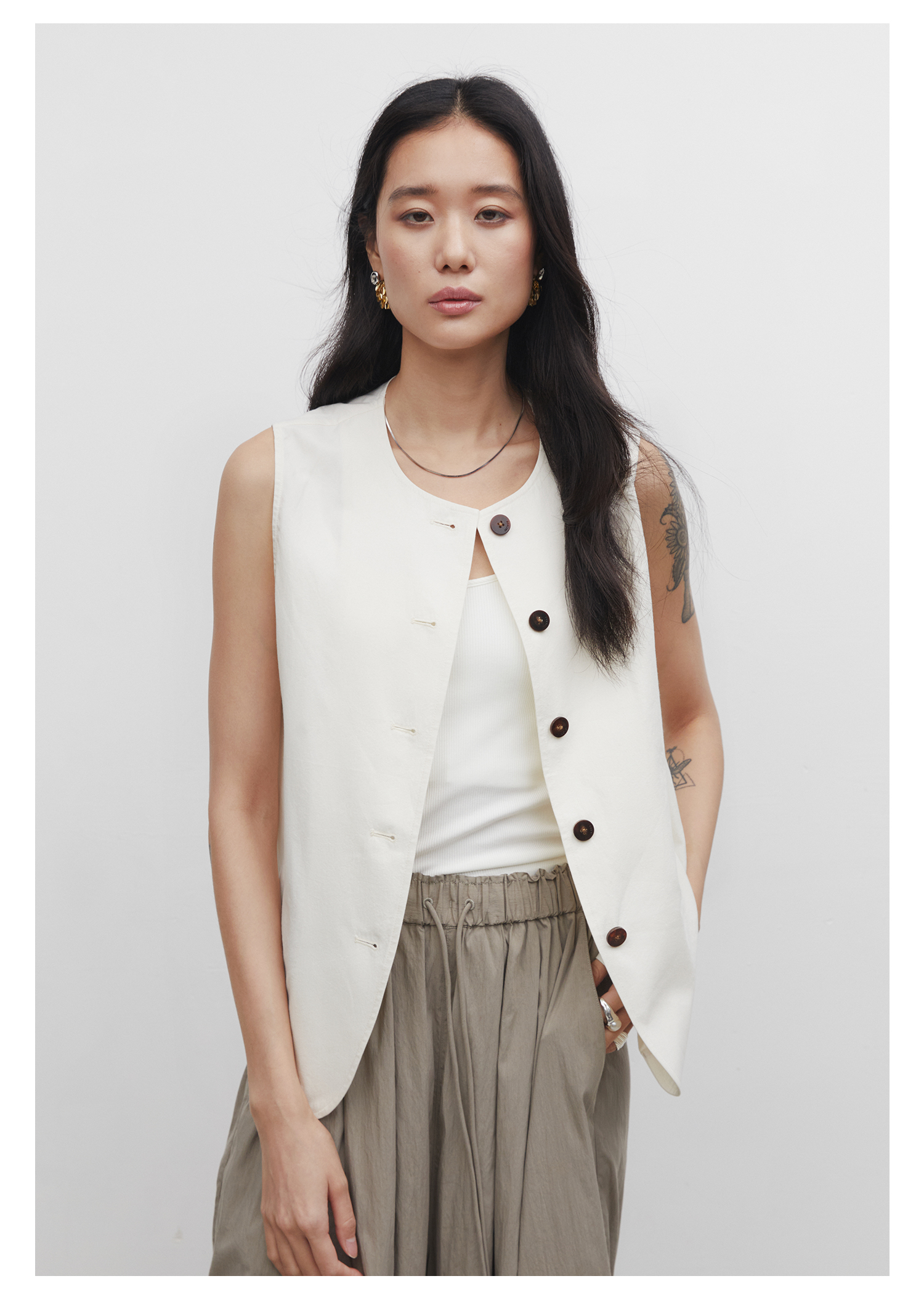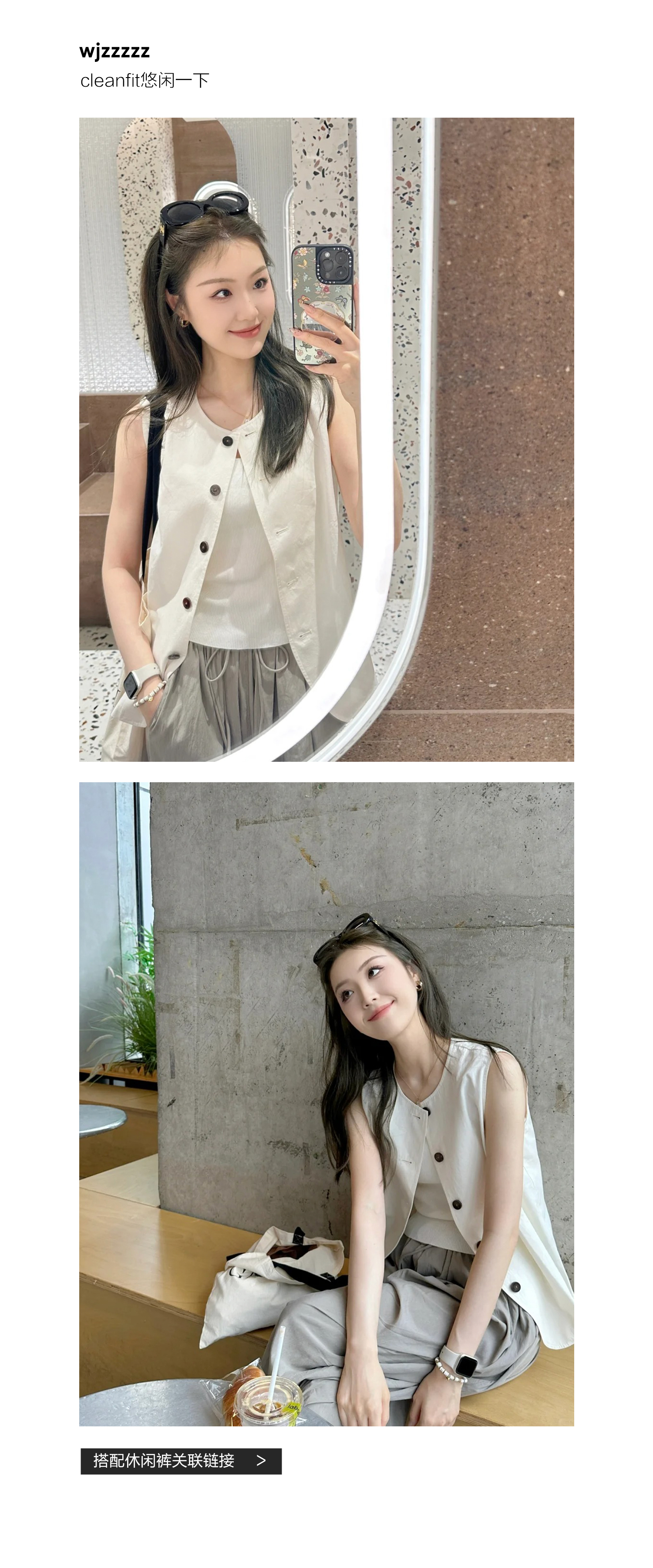 棉仓3521599004- 夏季静奢风灵地思羊毛单排扣圆领马甲小外套