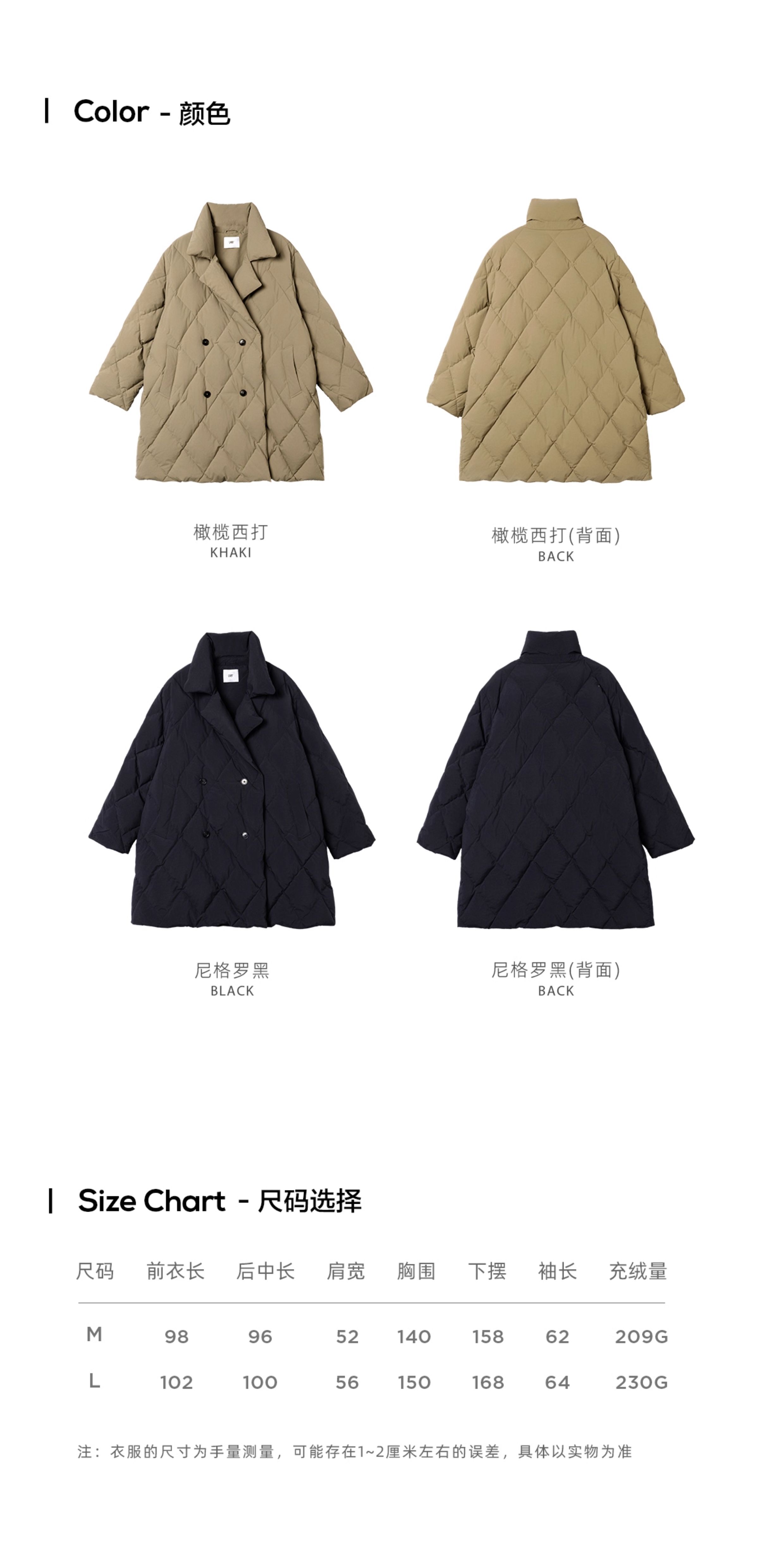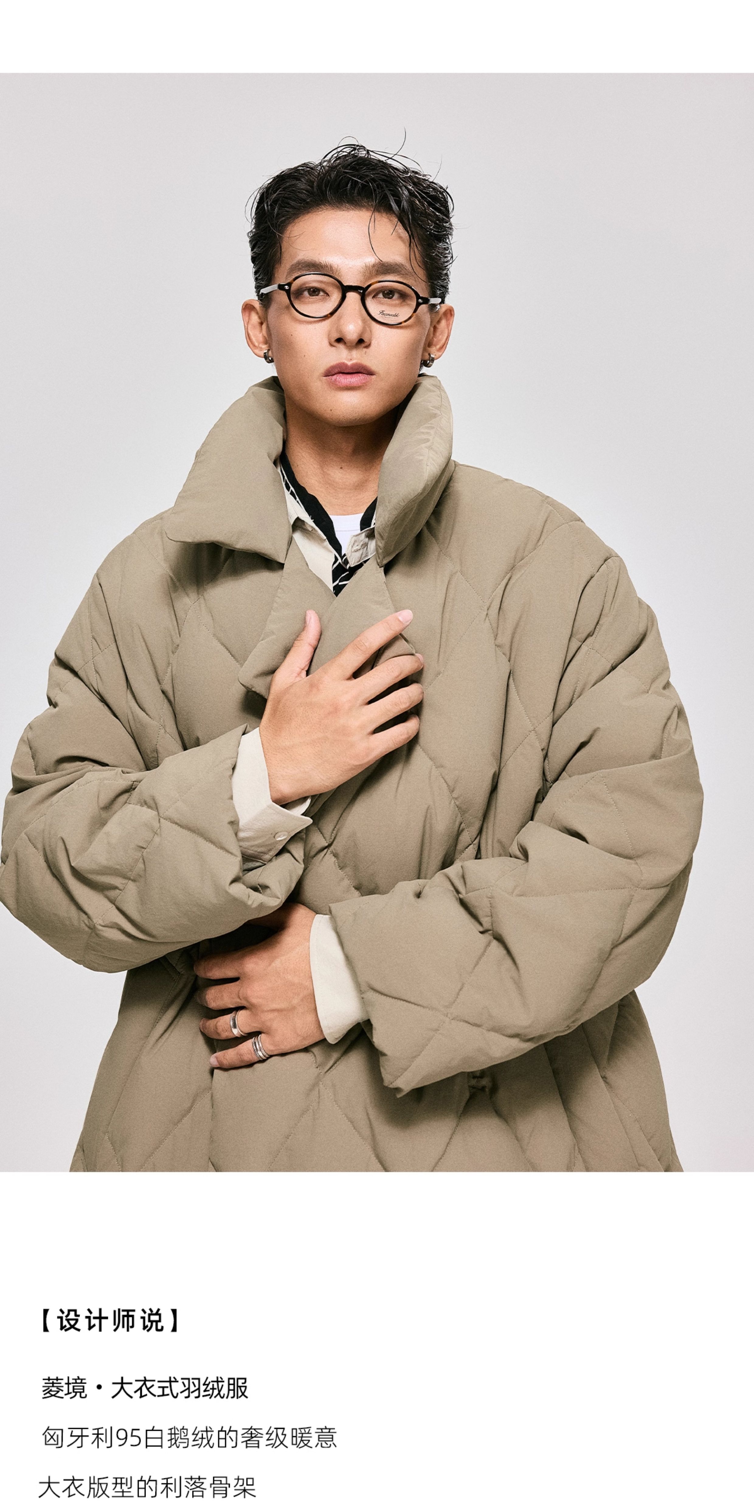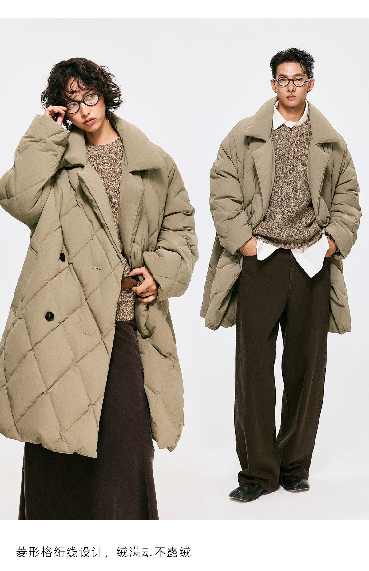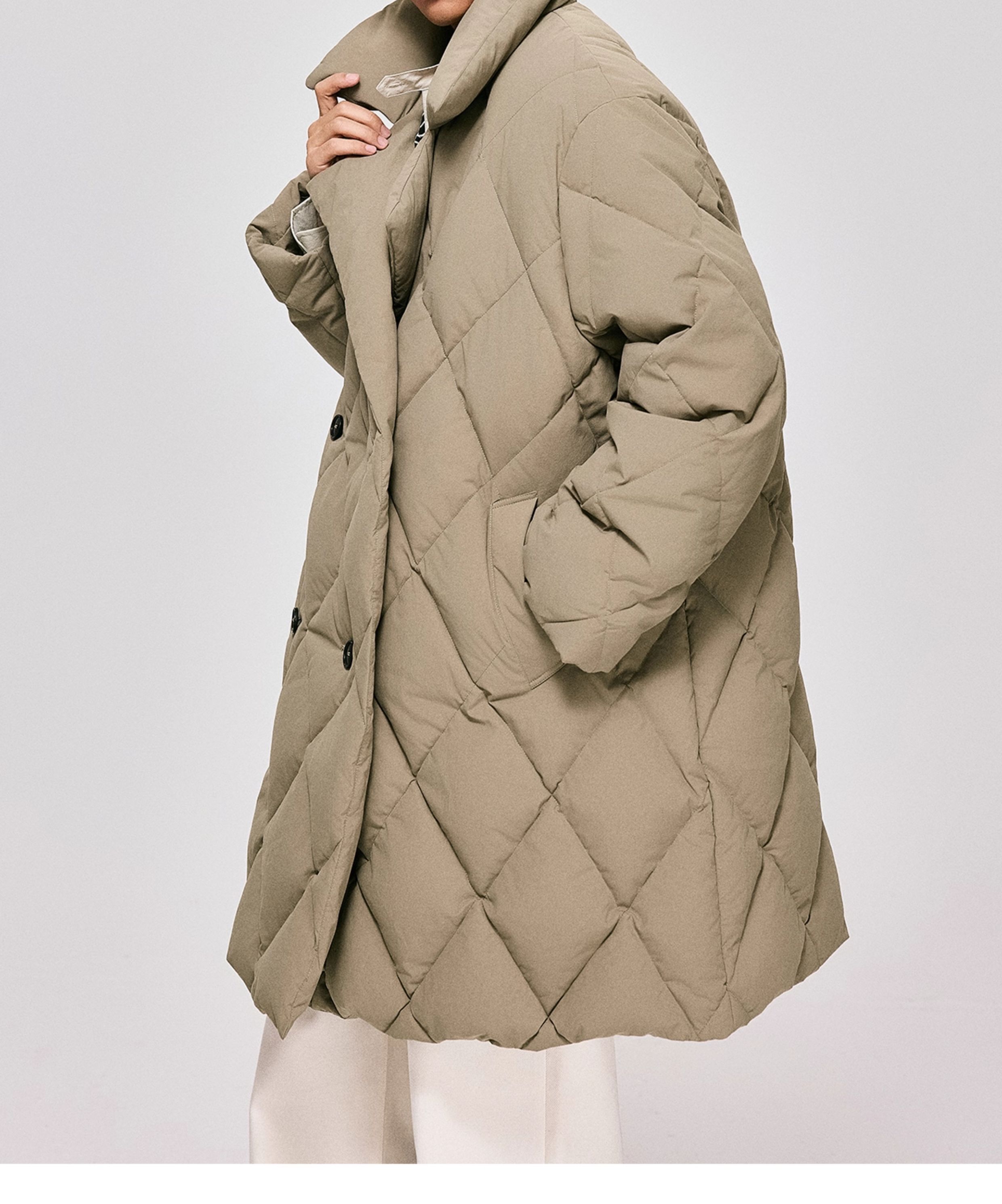 棉仓3671015002-菱形格宽松大衣款羽绒服中长款西装领匈牙利95白鹅绒