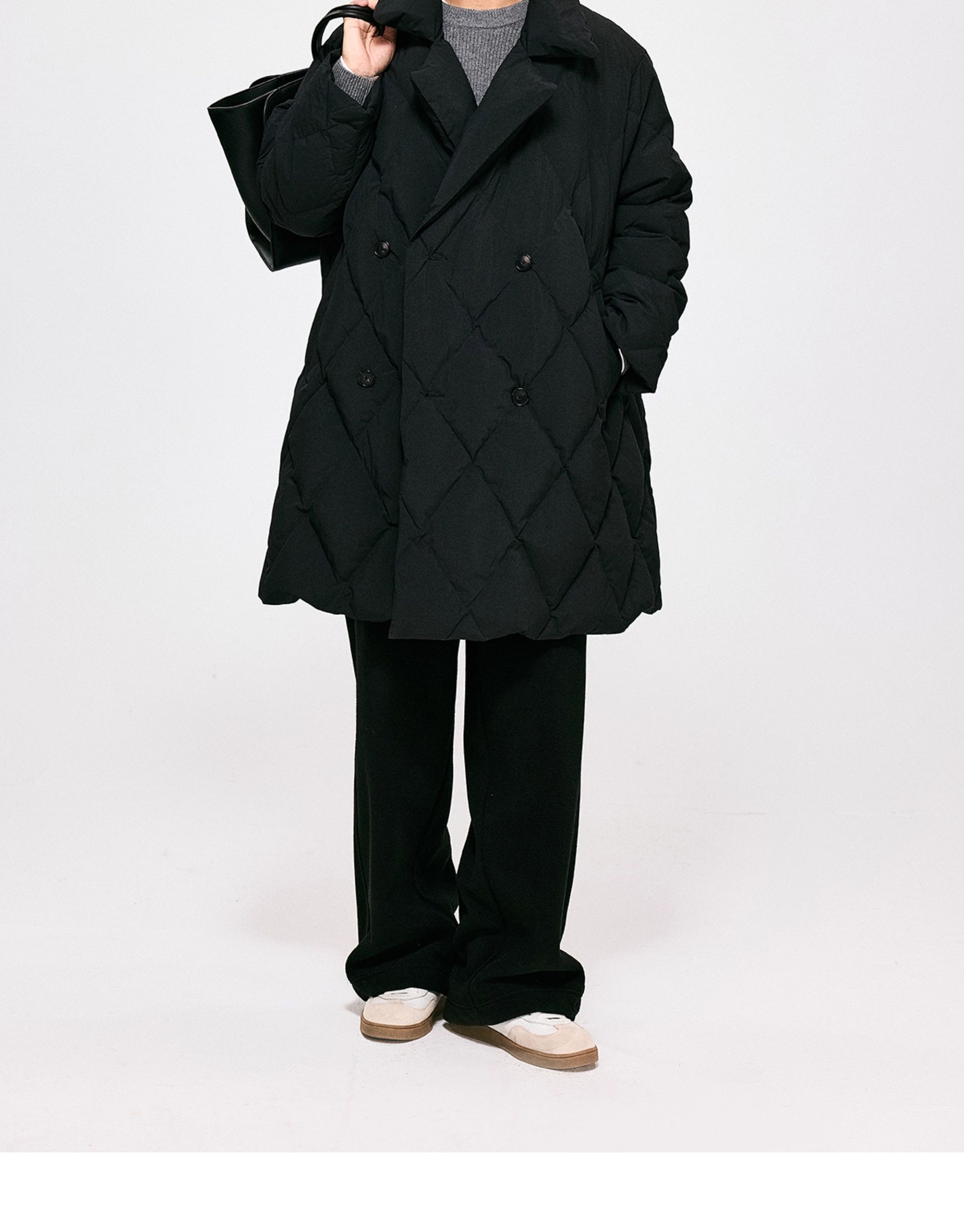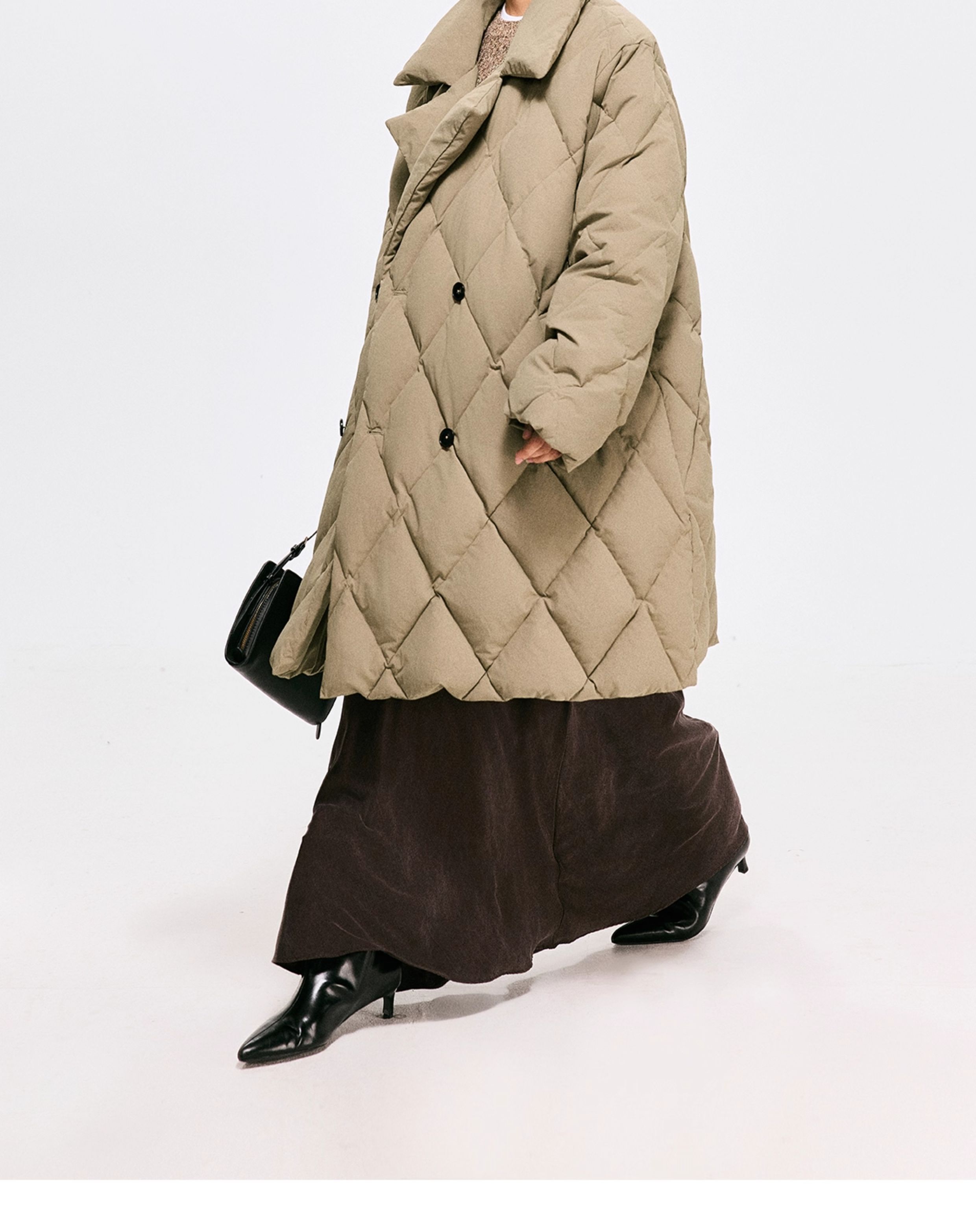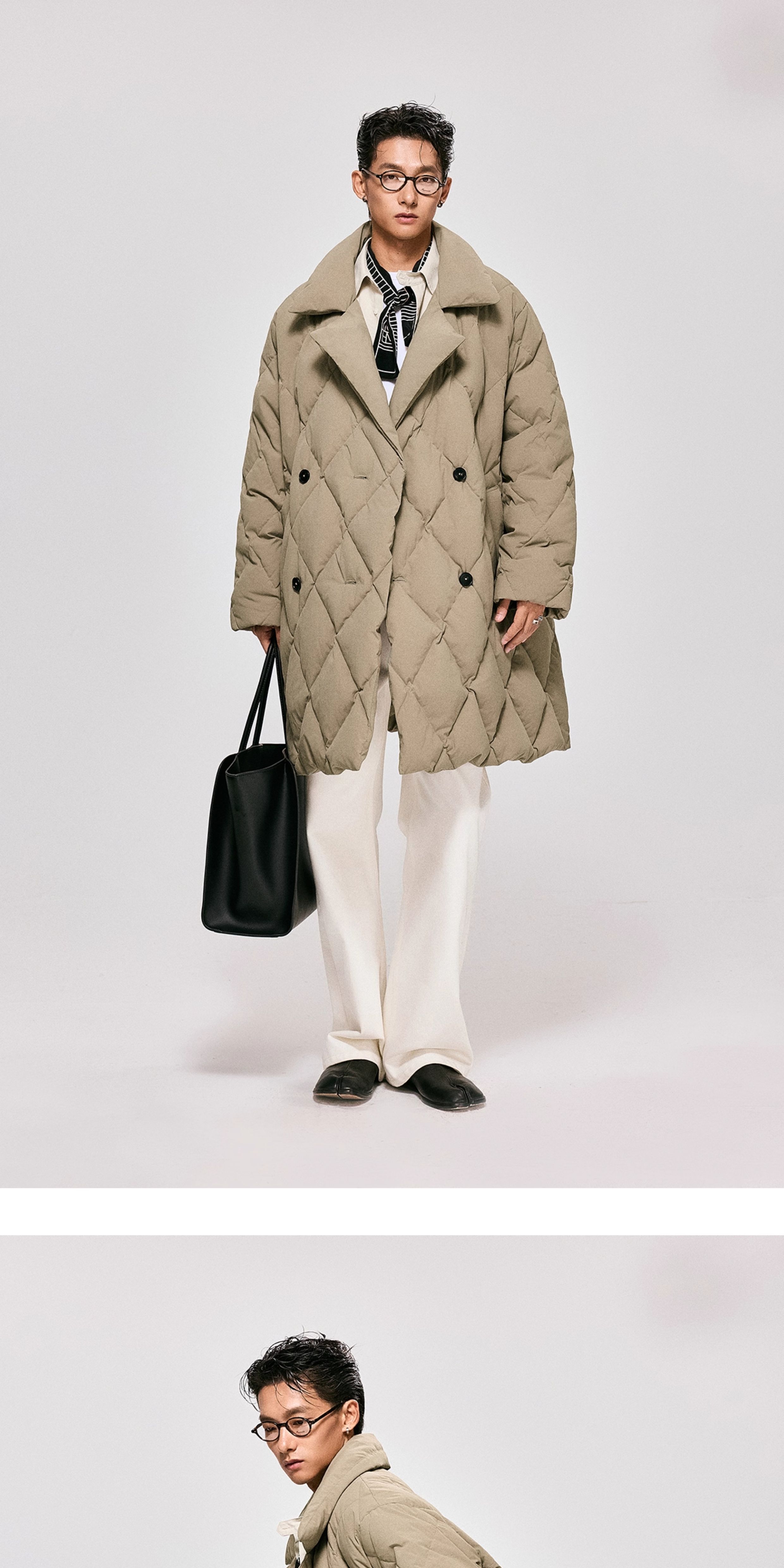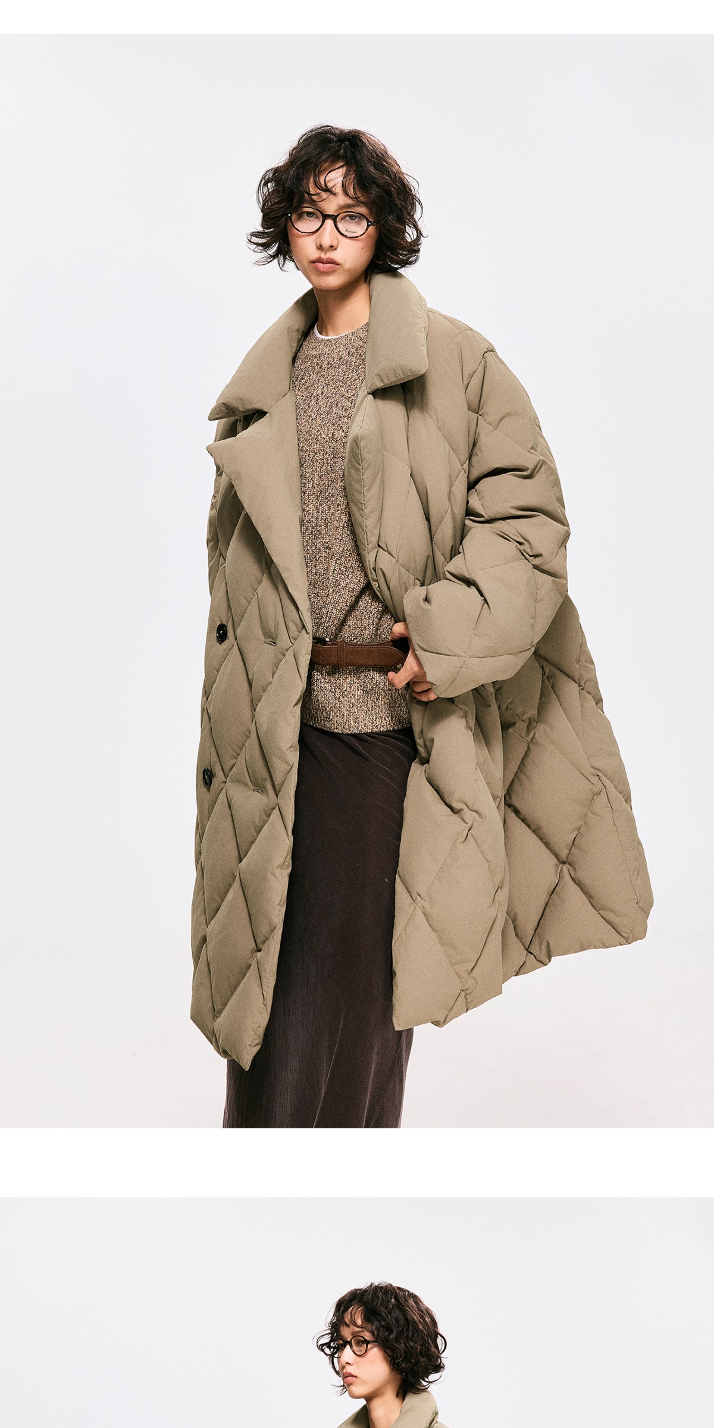 棉仓3671015002-菱形格宽松大衣款羽绒服中长款西装领匈牙利95白鹅绒