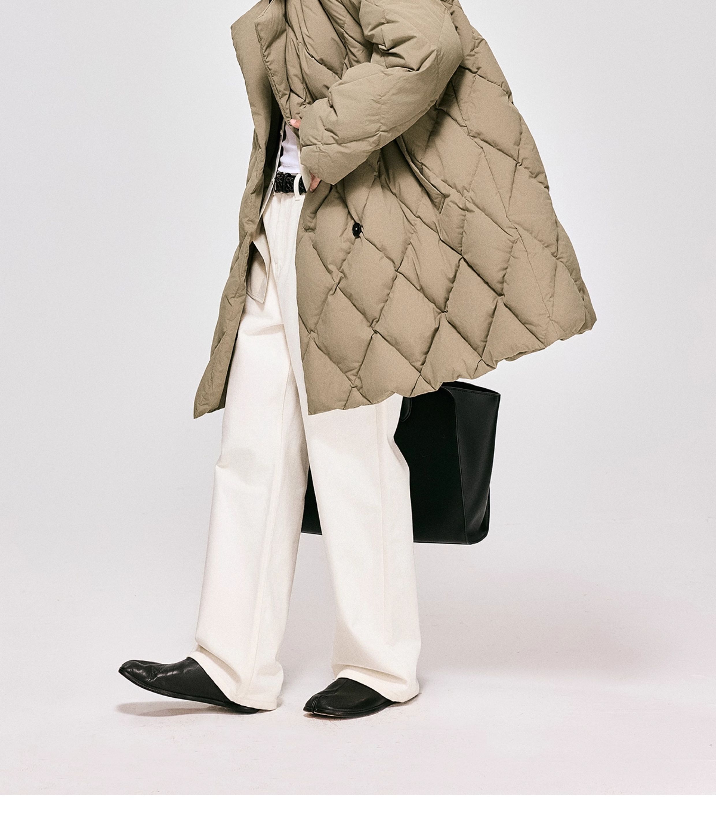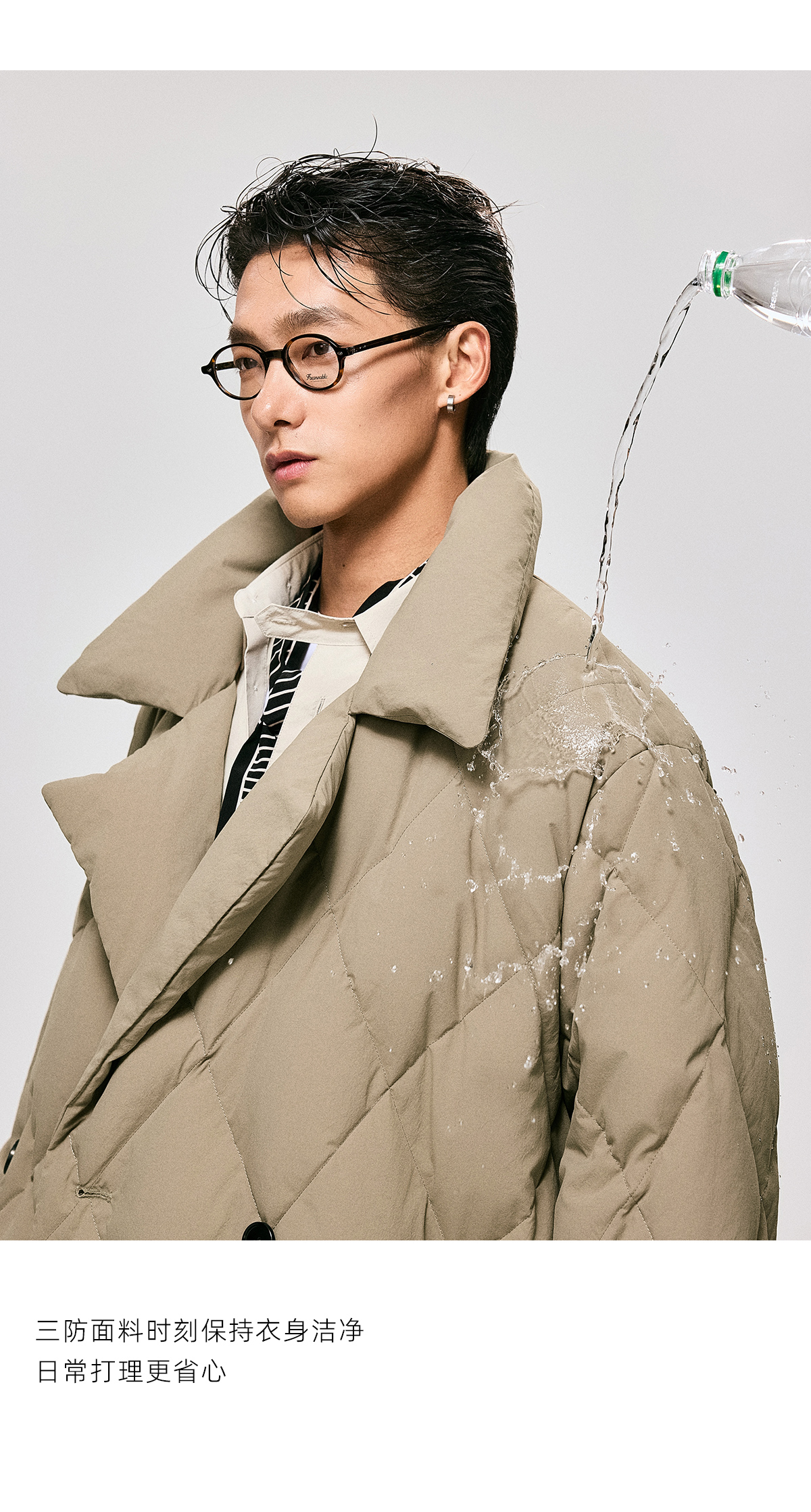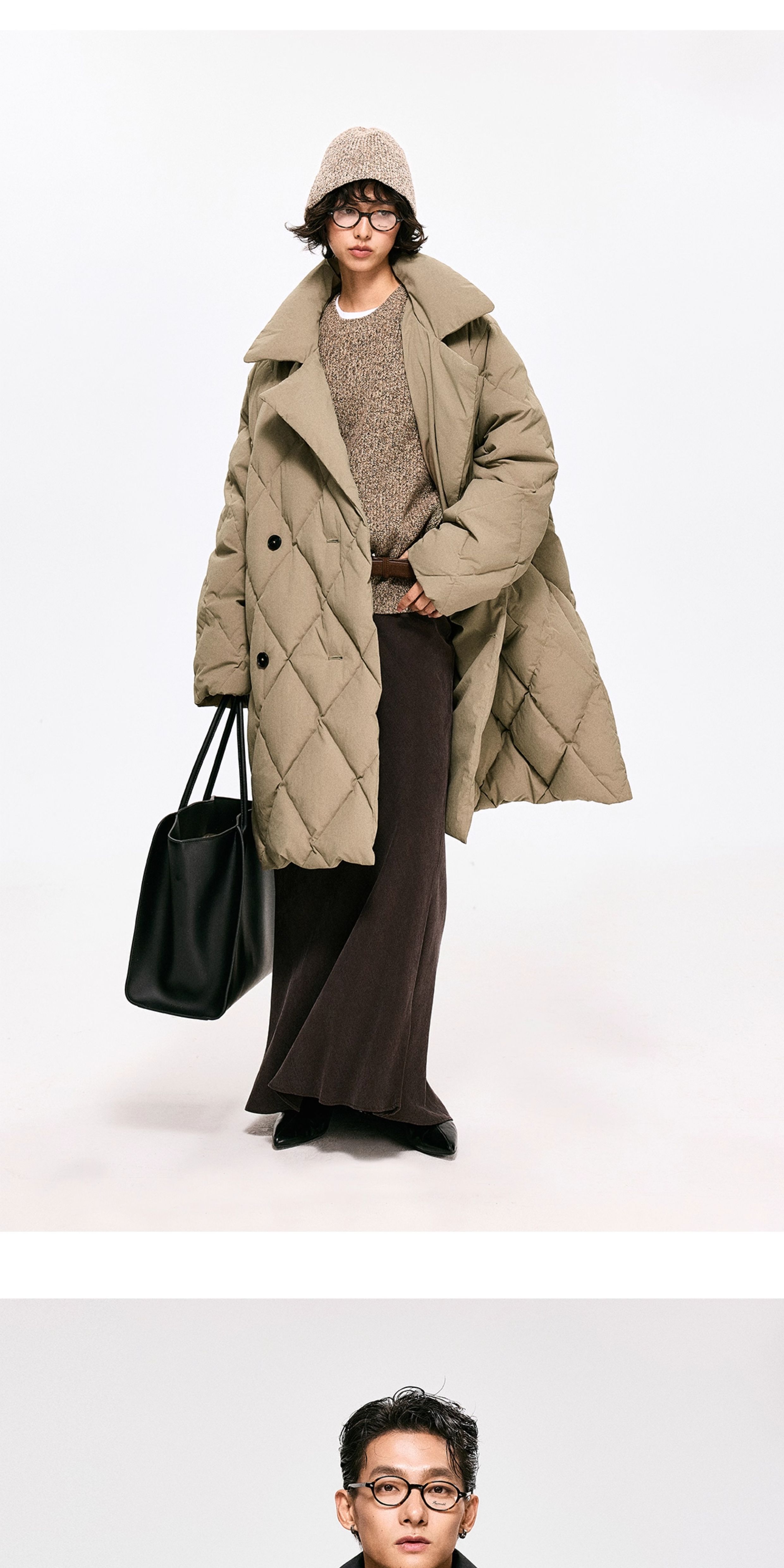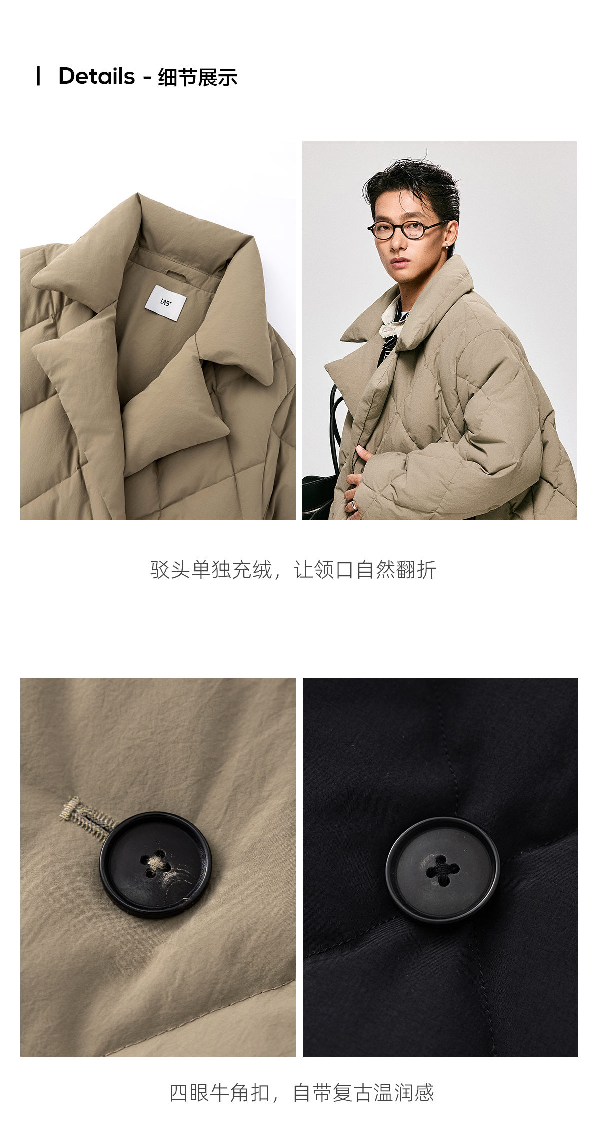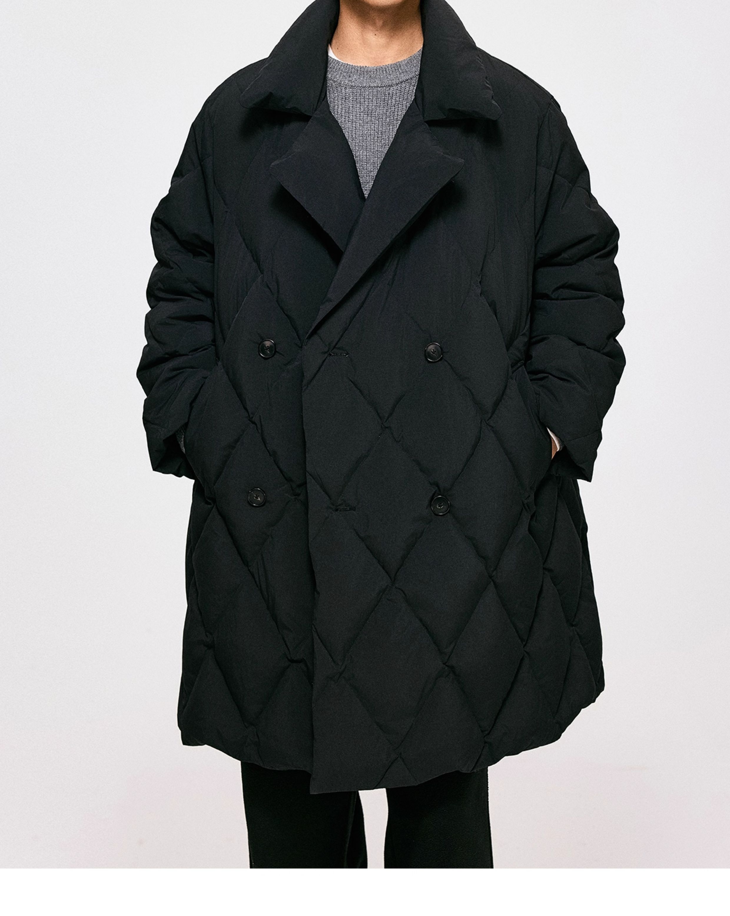 棉仓3671015002-菱形格宽松大衣款羽绒服中长款西装领匈牙利95白鹅绒