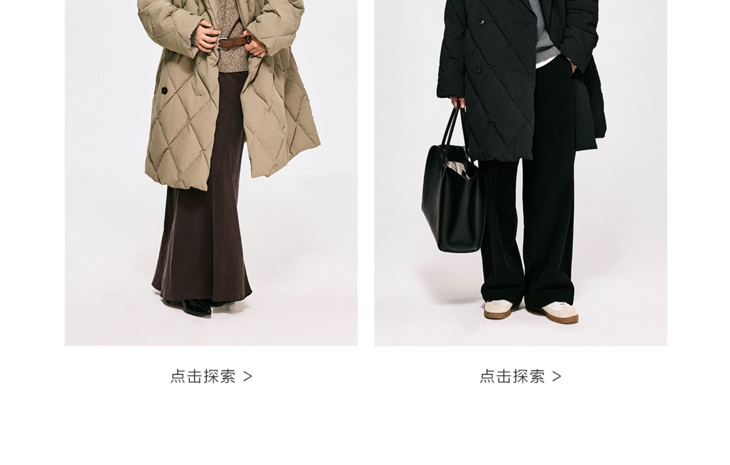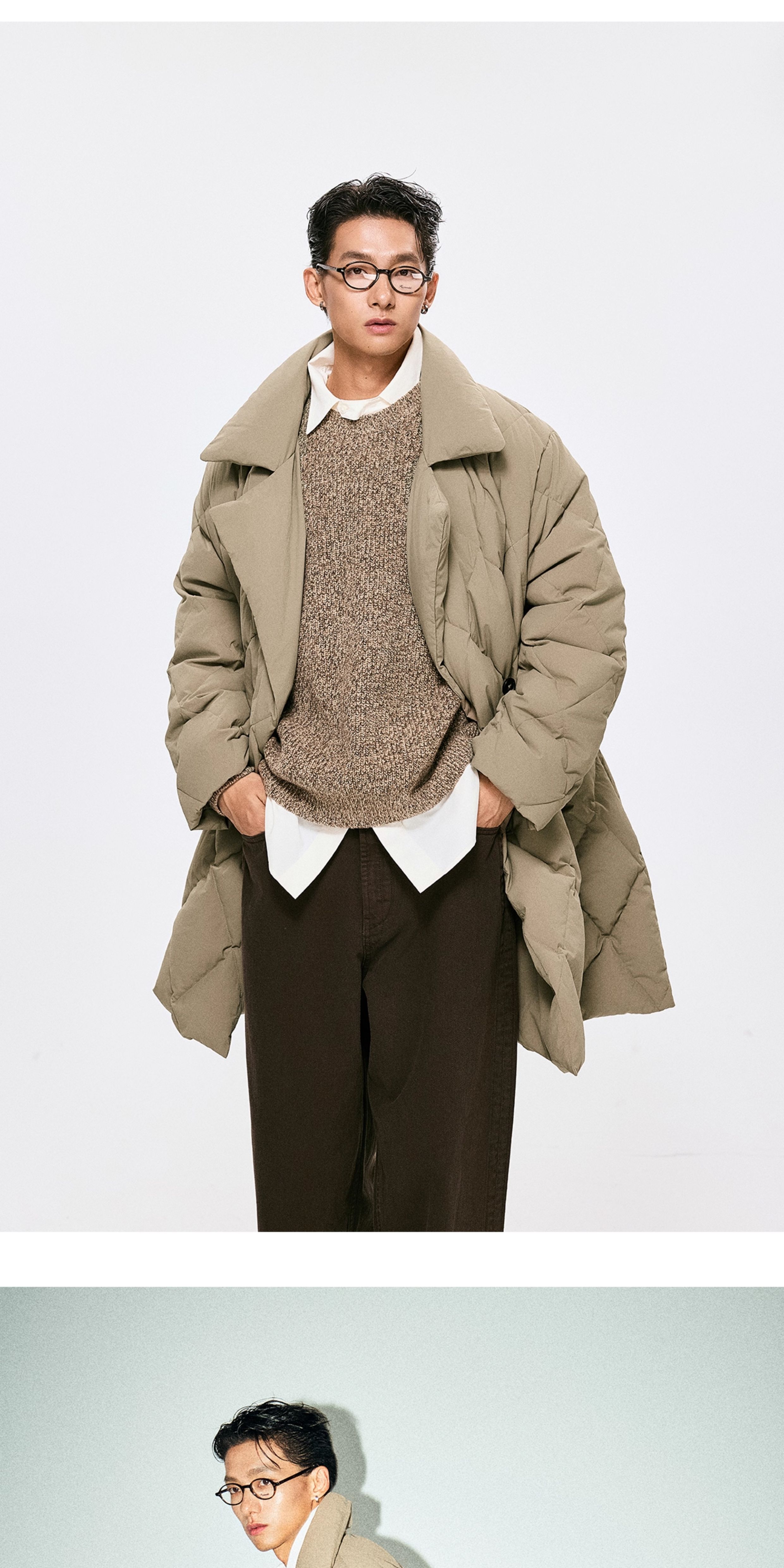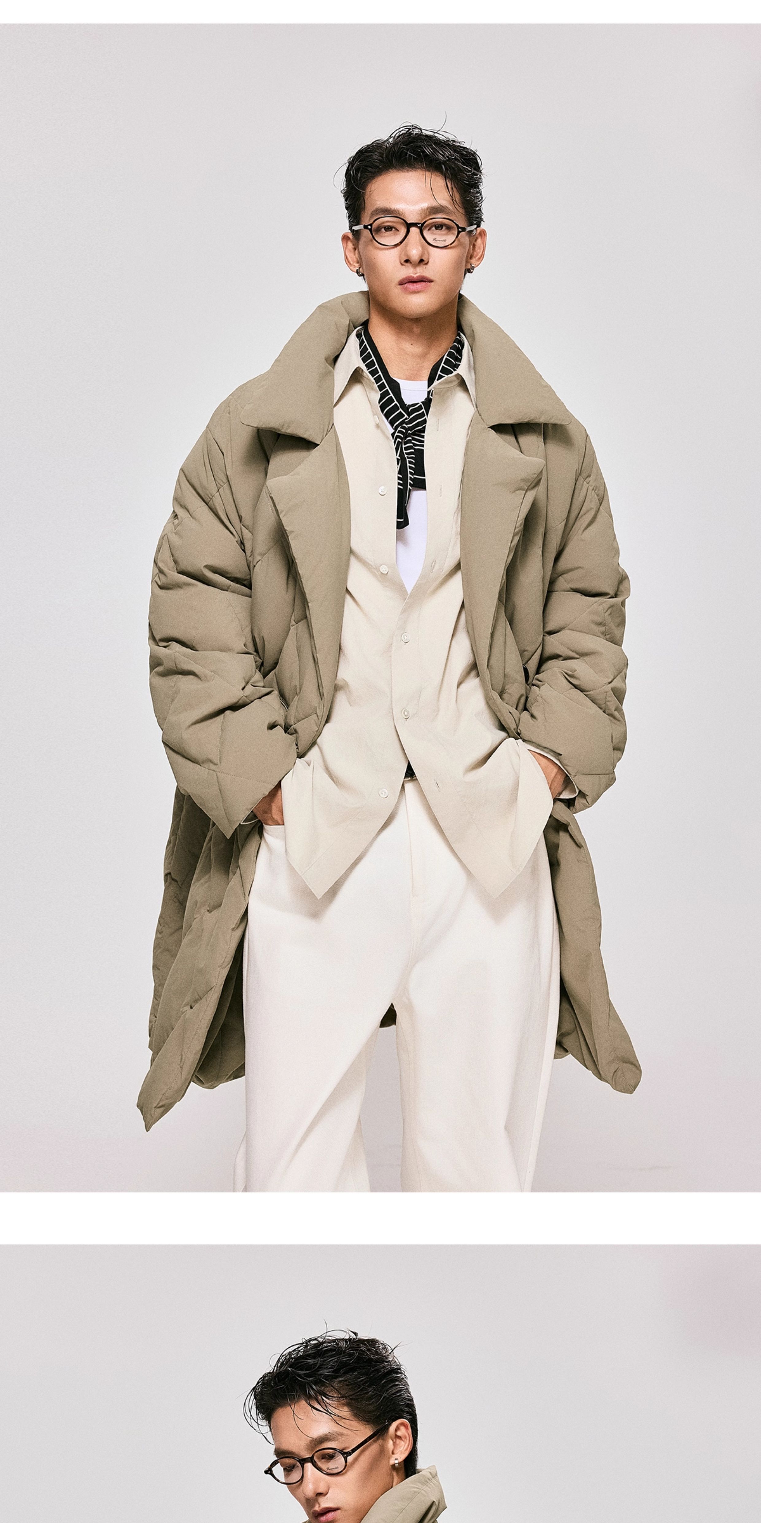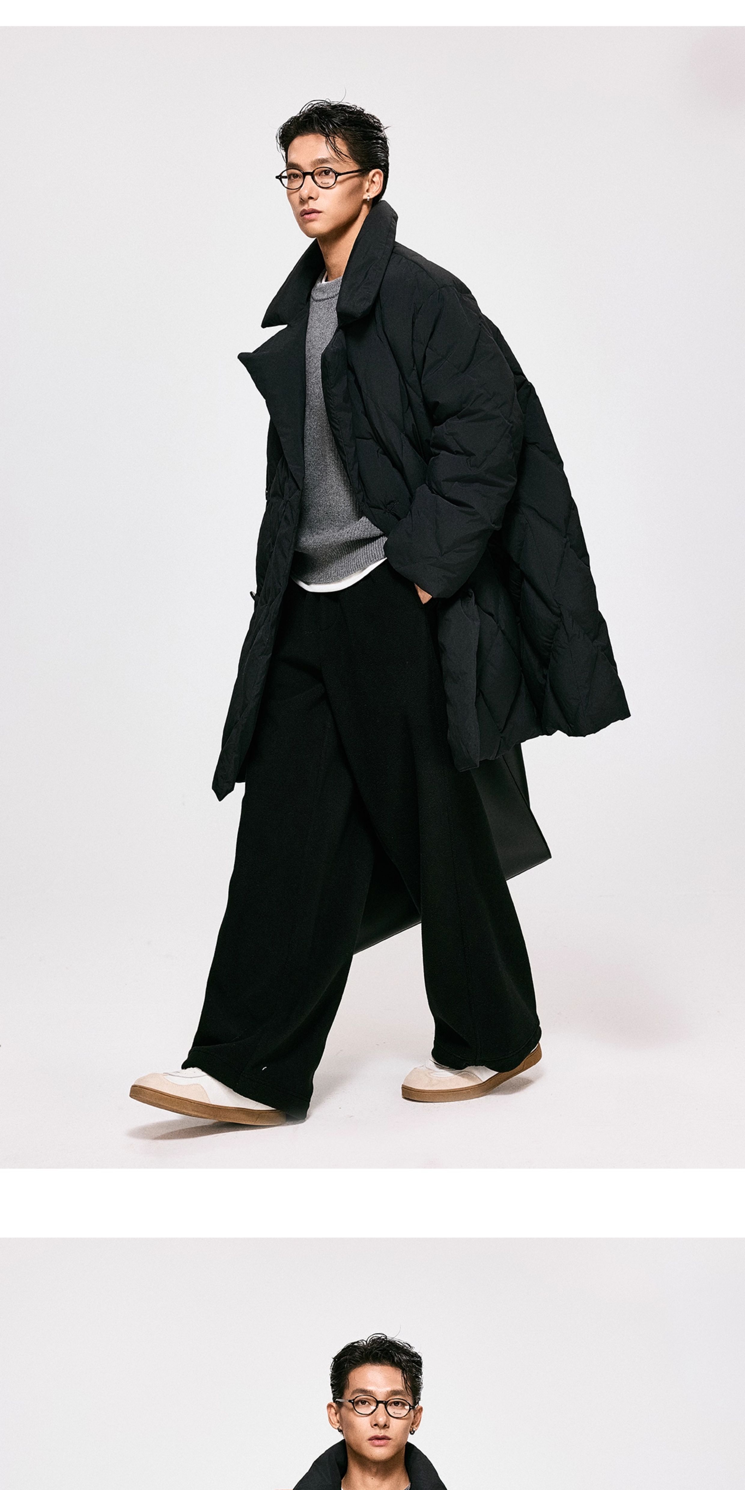 棉仓3671015002-菱形格宽松大衣款羽绒服中长款西装领匈牙利95白鹅绒