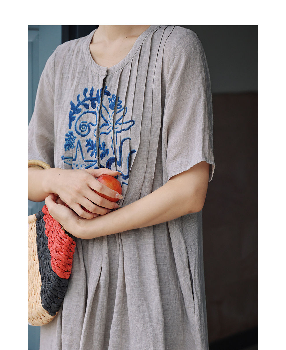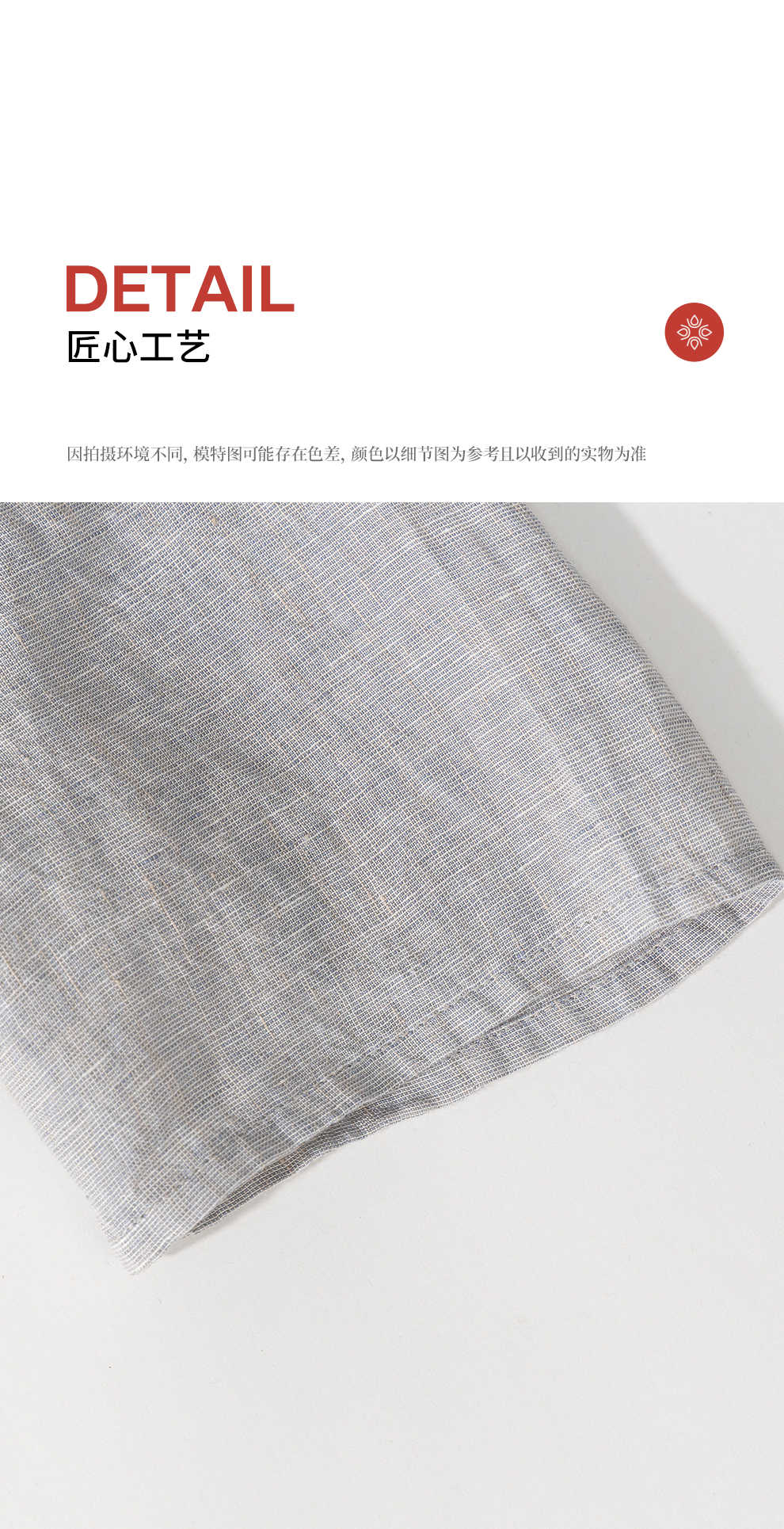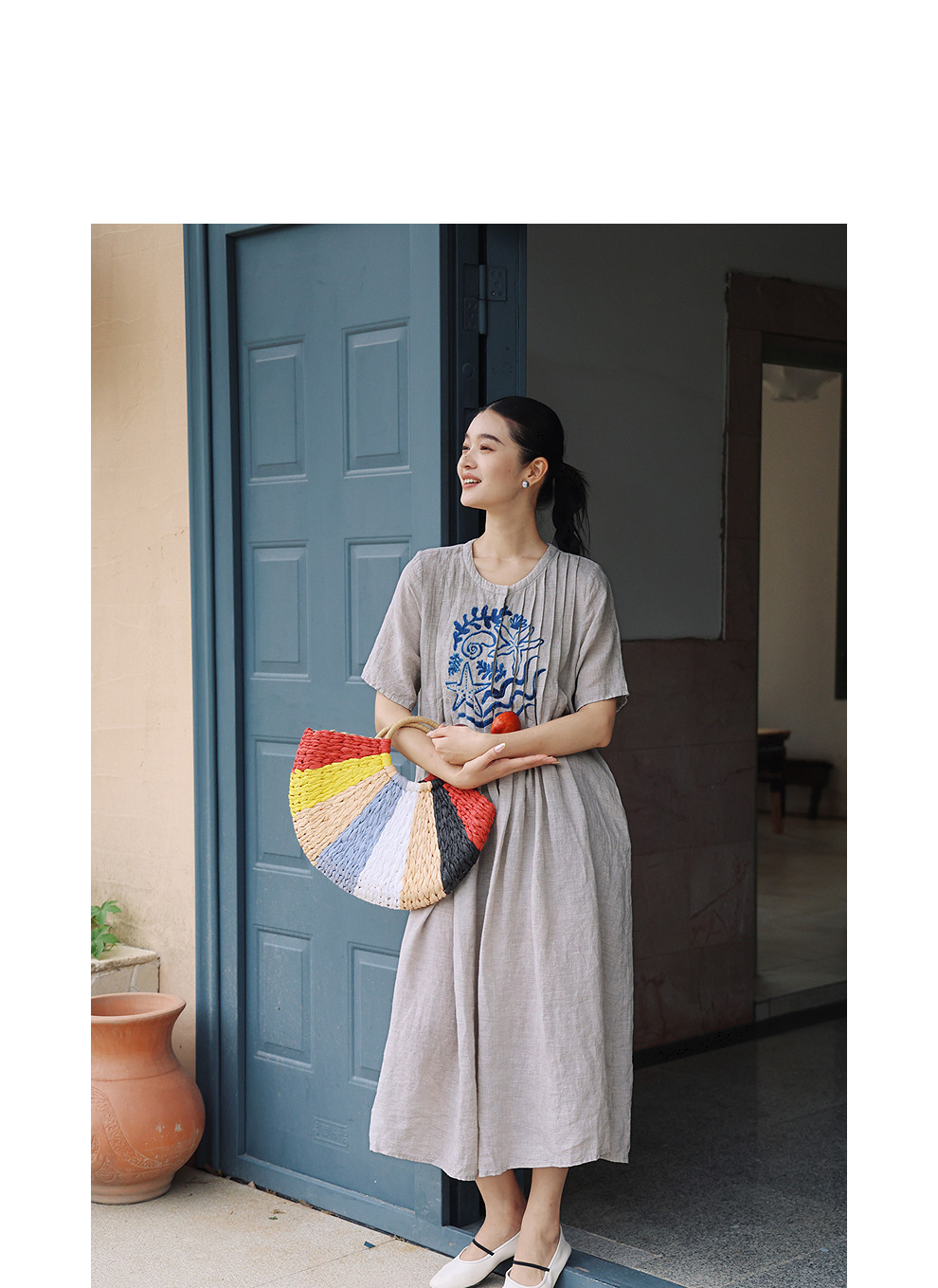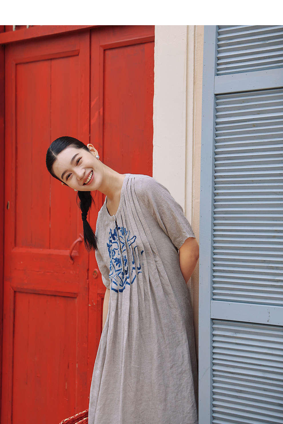 绽放女装378朵/【多巴胺系列】色织亚麻塔克蓝印花短袖连衣裙女夏