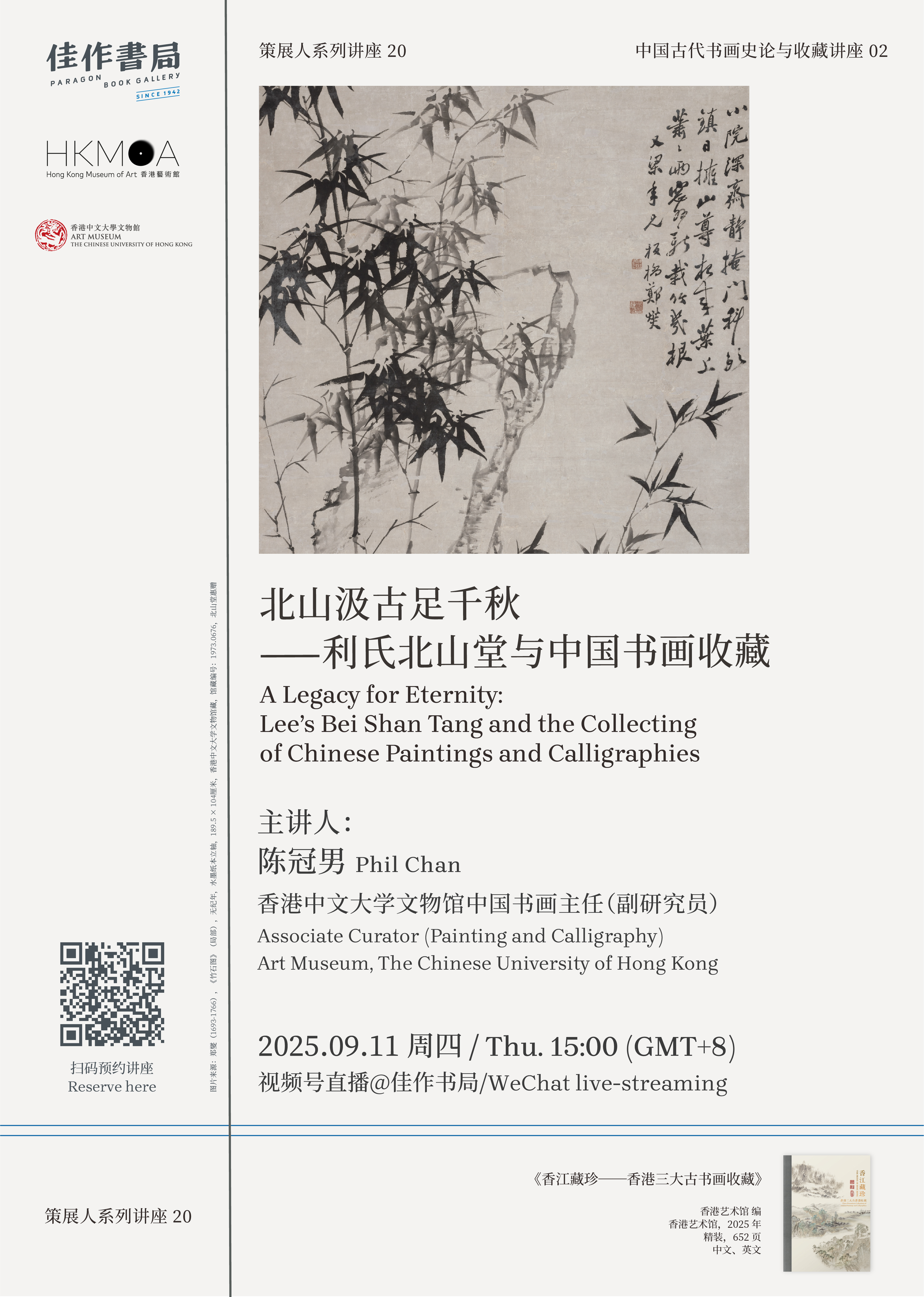二十世纪中叶是香港书画文物收藏的黄金时代。由于地缘关系和历史因素,因缘际会下,香港成为书画文物汇集之地。此时大批中国书画及文物因政局动荡而流入香港,成为本地收藏家、从内地南移到港以至来自海外的各方人士千载难逢的收藏契机。其中刘作筹(1911 – 1993)的虚白斋、何耀光(1907 – 2006)的至乐楼以及利荣森(1915 – 2007)的北山堂素被誉为香港三大古书画收藏,他们或因热爱书画珍品,或视保存和弘扬国粹为己任,不约而同地在此时建立起各具特色的收藏,最后更化私为公,他们及其家族先后将其个人收藏捐赠予香港艺术馆和香港中文大学文物馆。