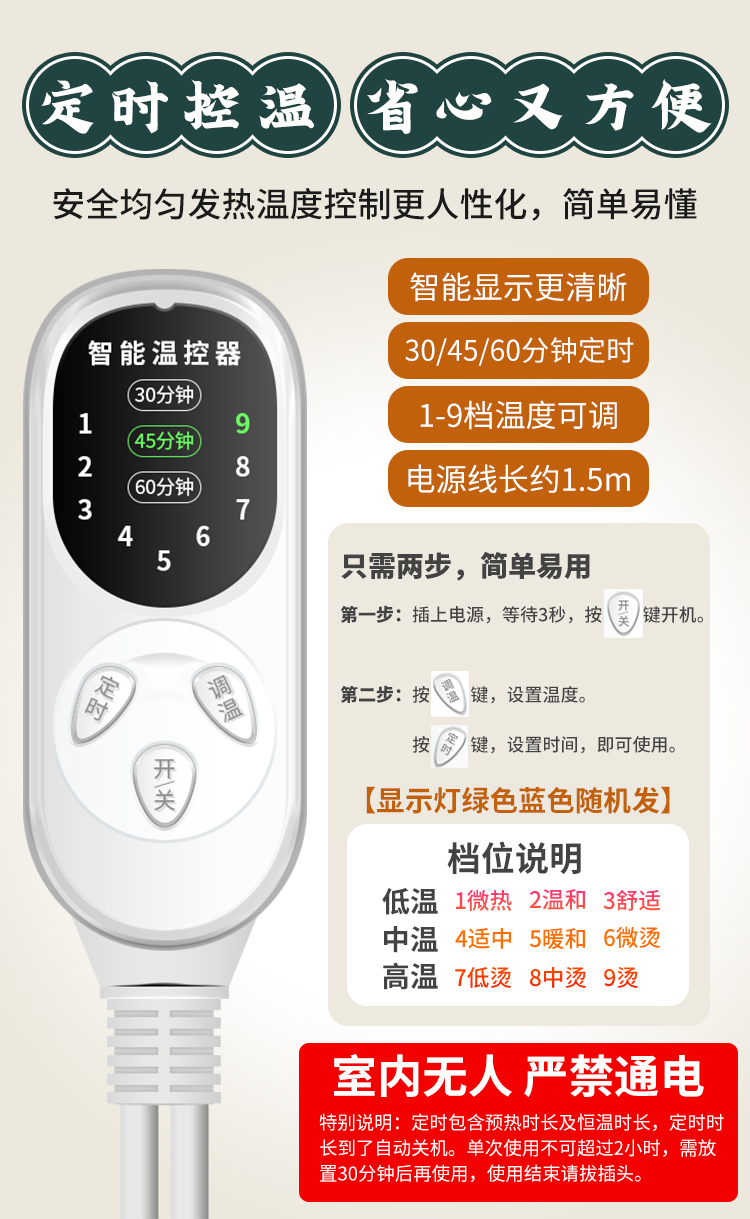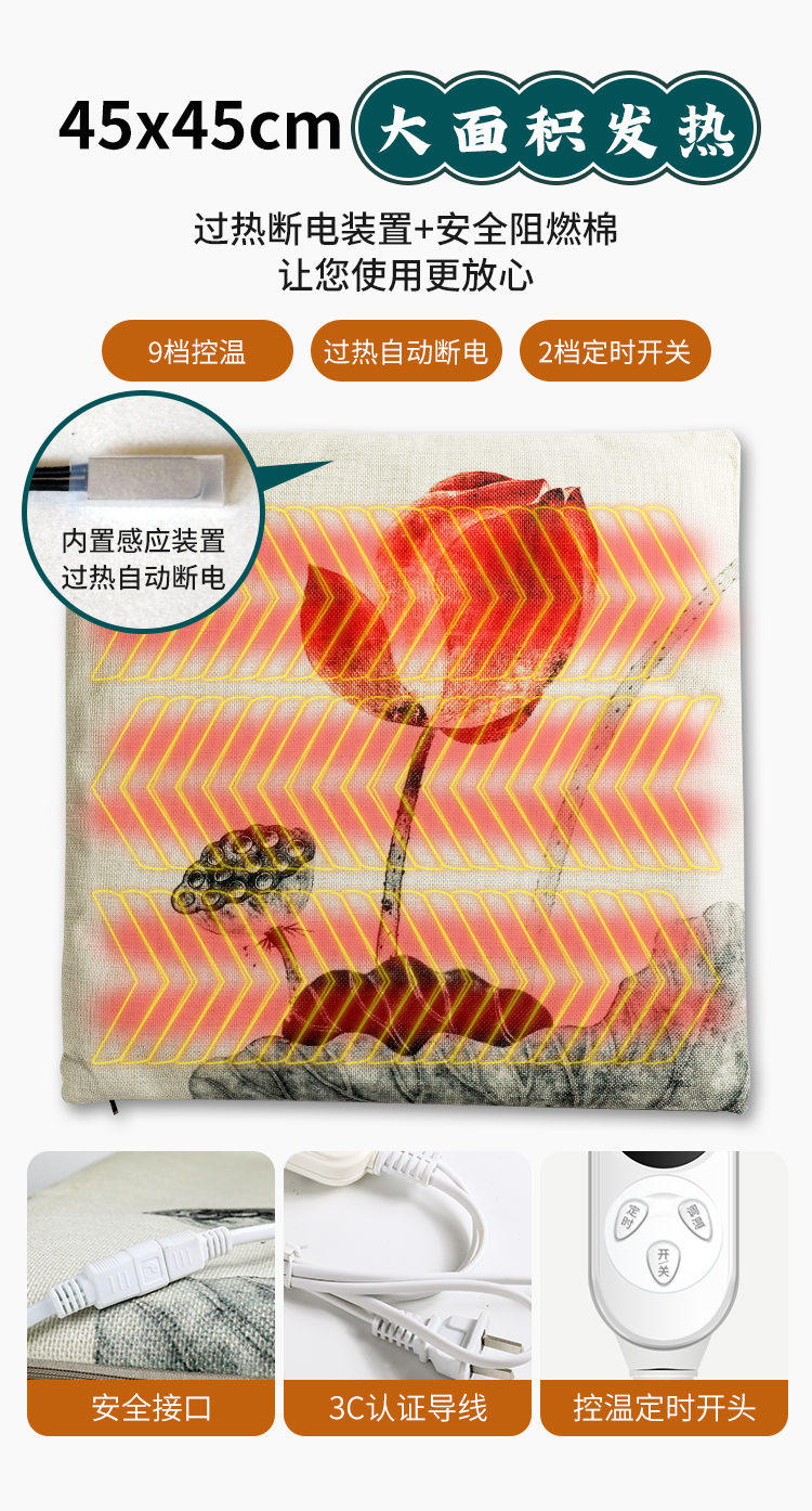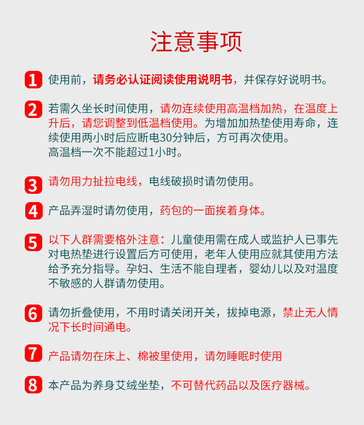 延长使用寿命:收纳座垫时,请先拉开拉链观察加热丝层,折叠时顺着加热丝折叠,加热丝不可折叠,否则可能折断报废。请存放于其他物品上方勿压。