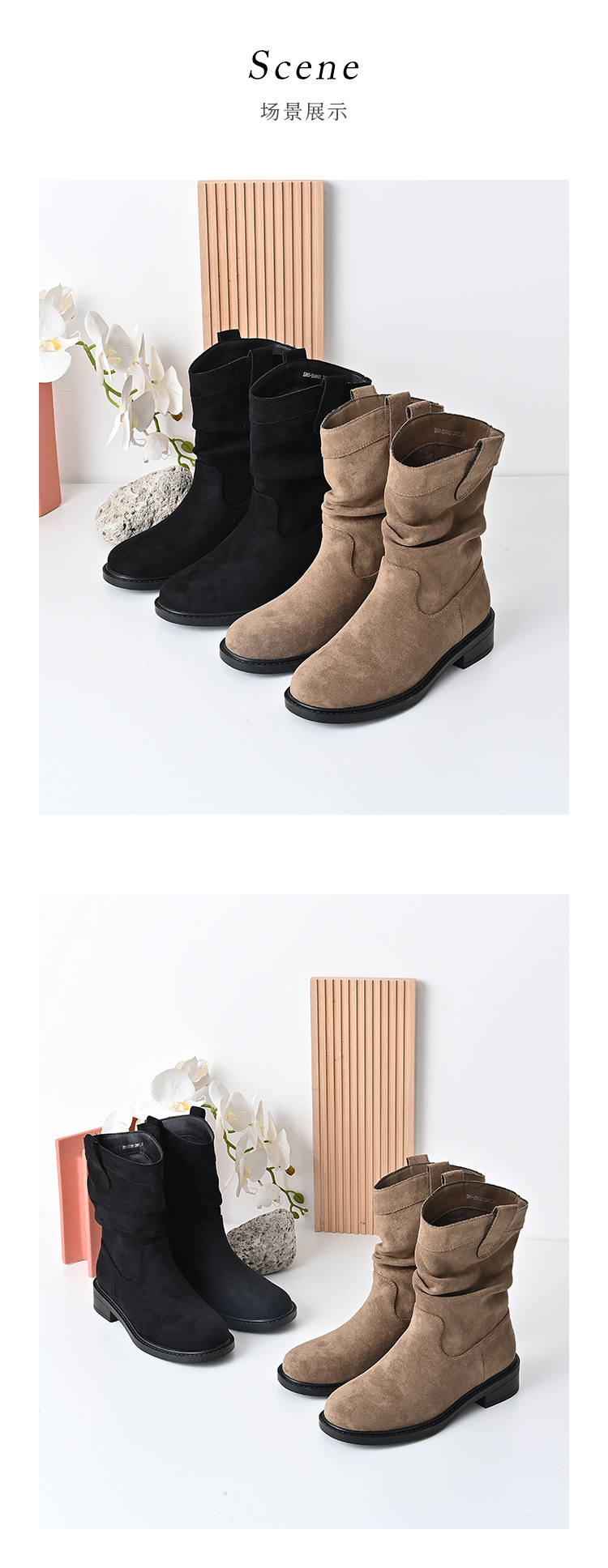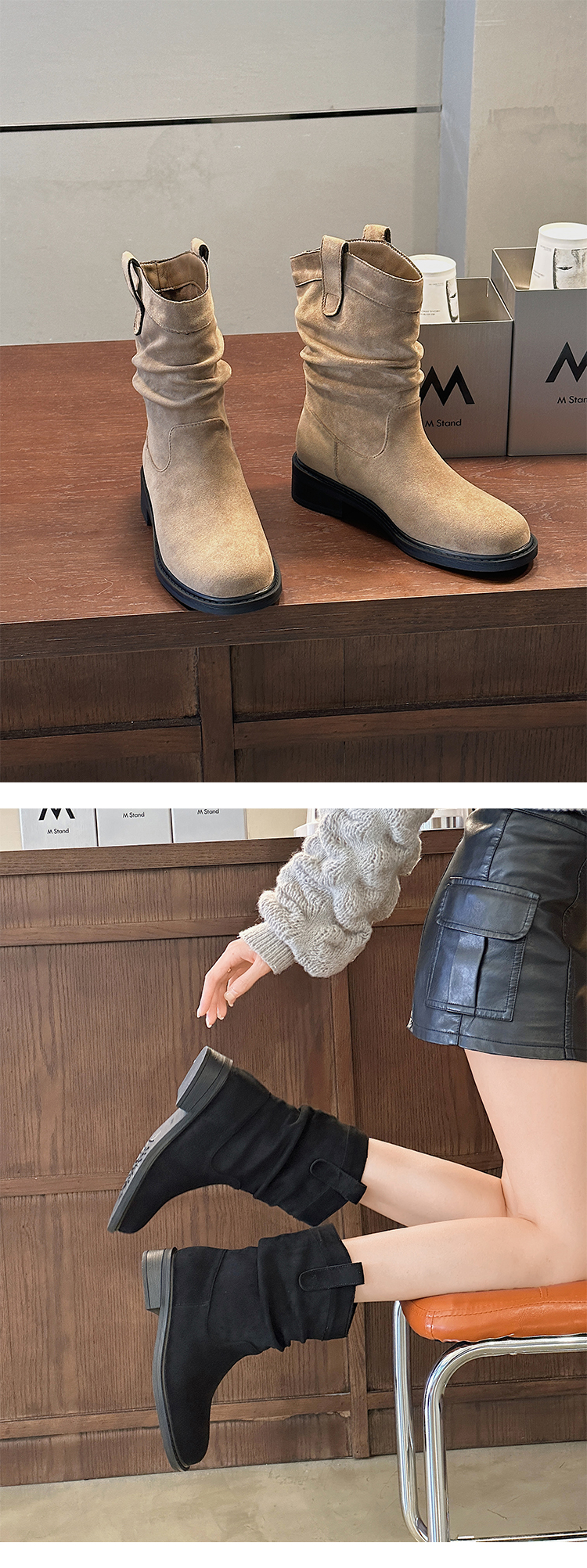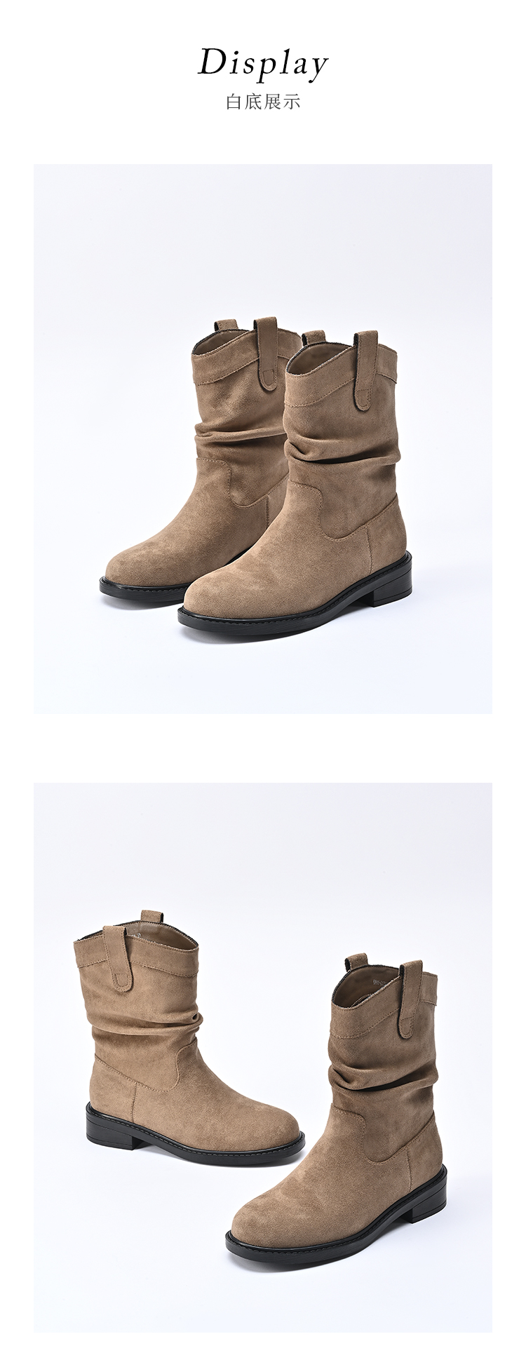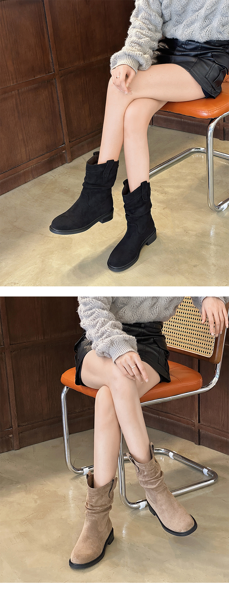 经典鲨2024年冬新款百搭时尚圆头潮流时尚中筒褶皱堆堆靴女KW65-D58181