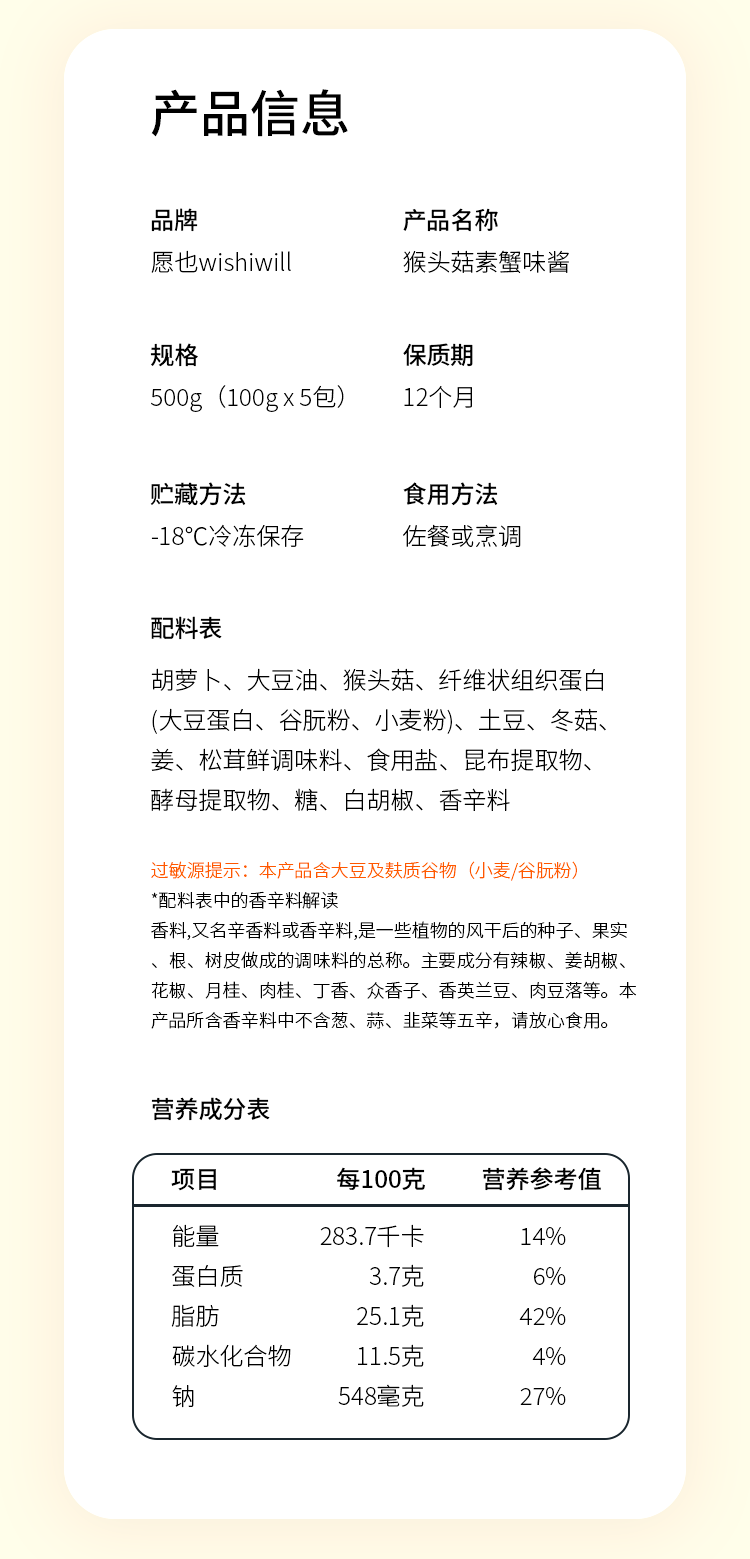 愿也 猴头菇素蟹味酱 500g/袋【100g*5包】