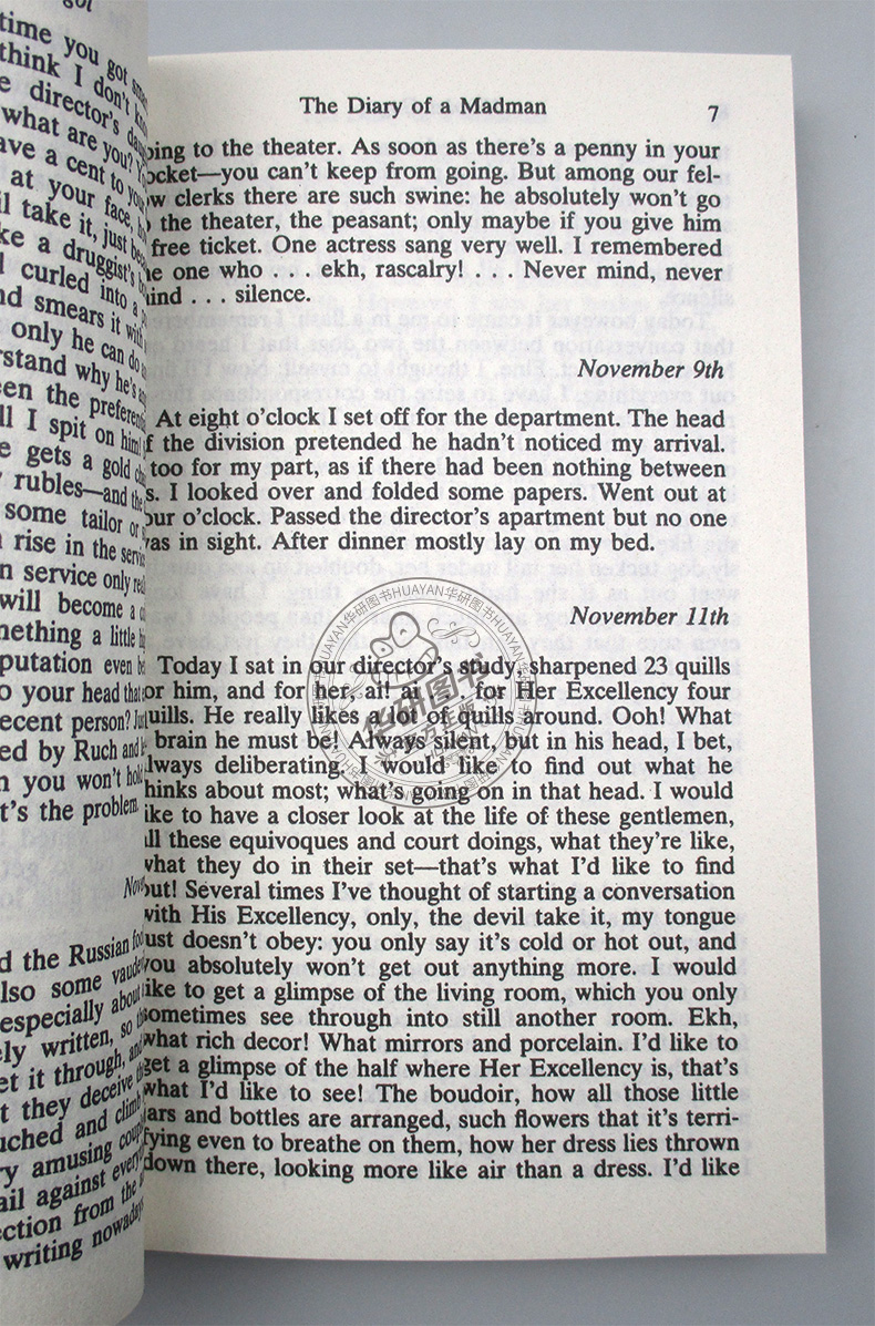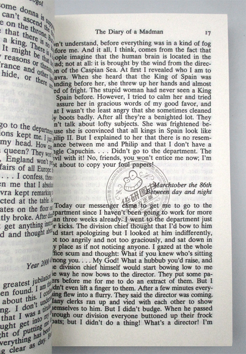果戈里的The Diary of a Madman《狂人日记》艺术构思独特,出现在读者面前的是狂人和狗的通讯、几篇日记,形式荒诞。小说主人公是一个微不足道、安分守己的小公务员,受阶级社会重重压迫,处处被人侮辱蹂躏,后来被逼发疯。