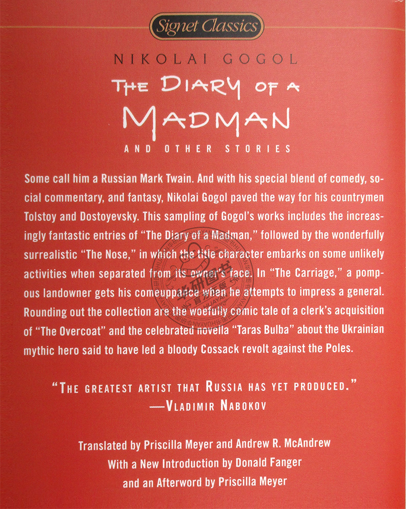 本书为Signet Classics推出的英文原版,包括The Nosen “The Carriage,” “The Overcoat” “Taras Bulba”等其他几个故事。由Regina Barreca作序,Gerald Charles Dickens后记,内容完整无删减,书本小巧便携。