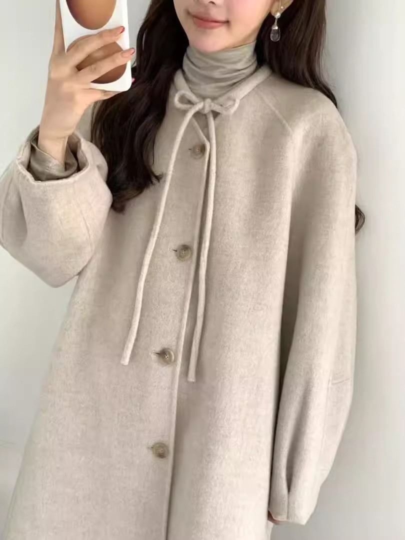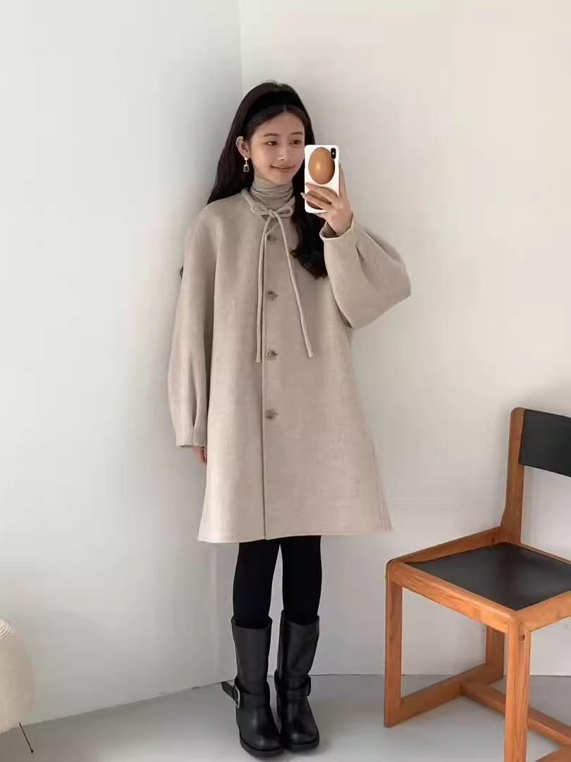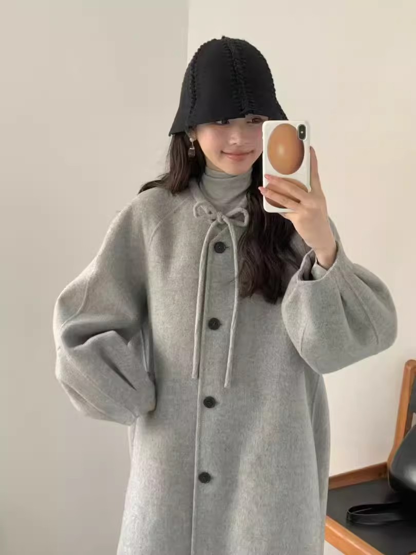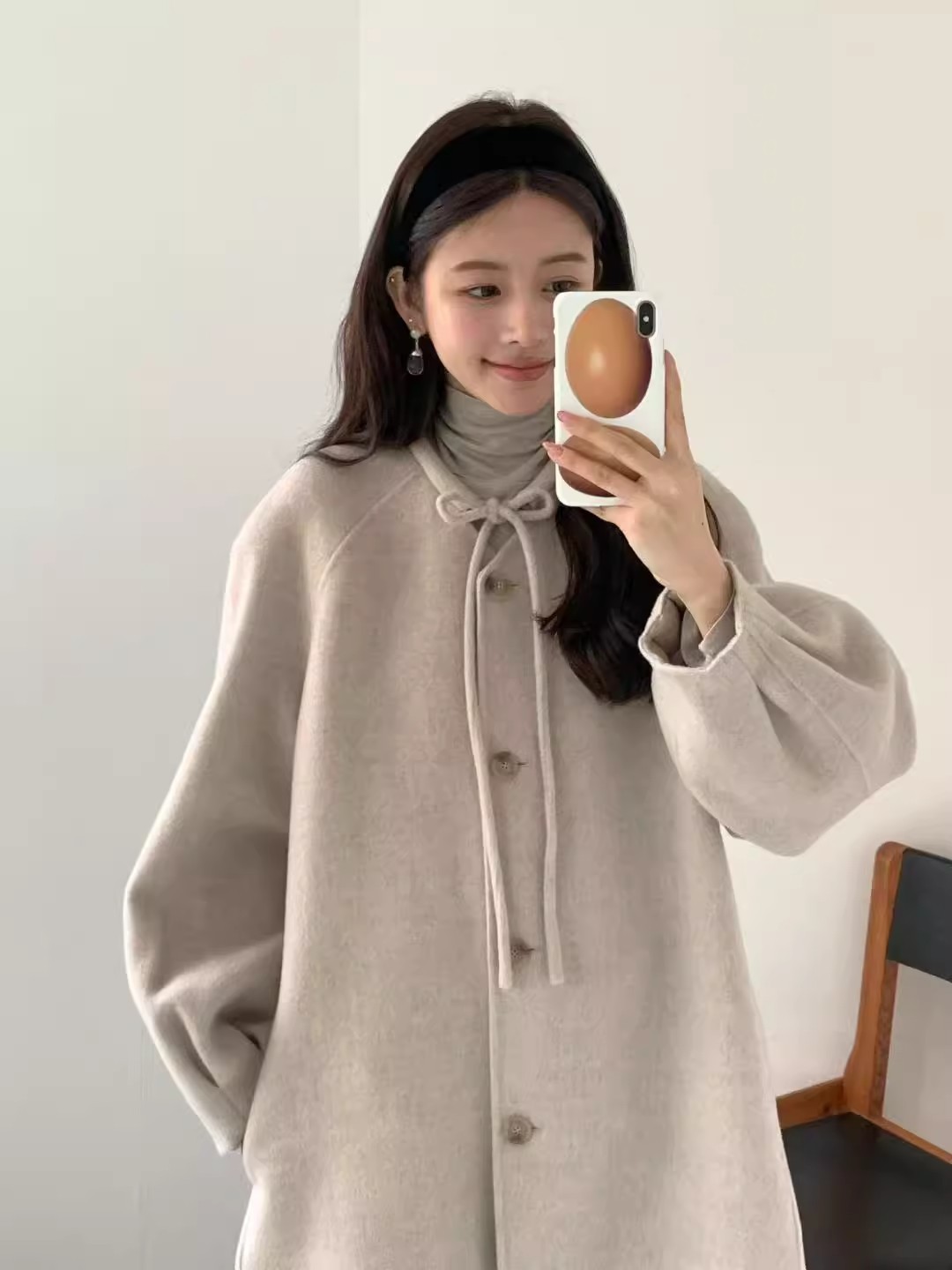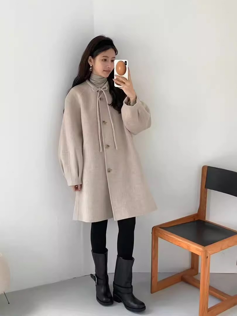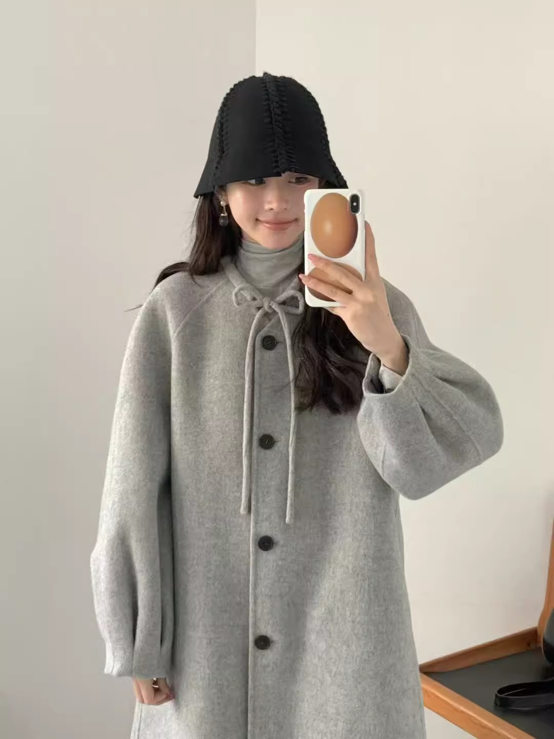 EGG韩国同款!2025冬季小香风圆领蝴蝶结毛呢大衣女双面羊绒外套!