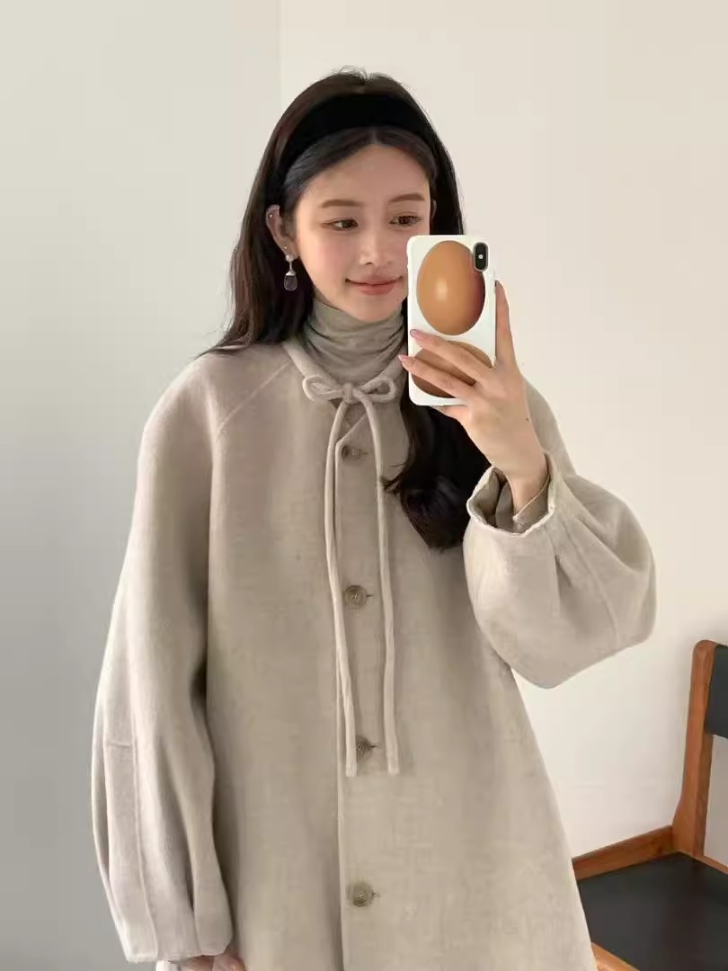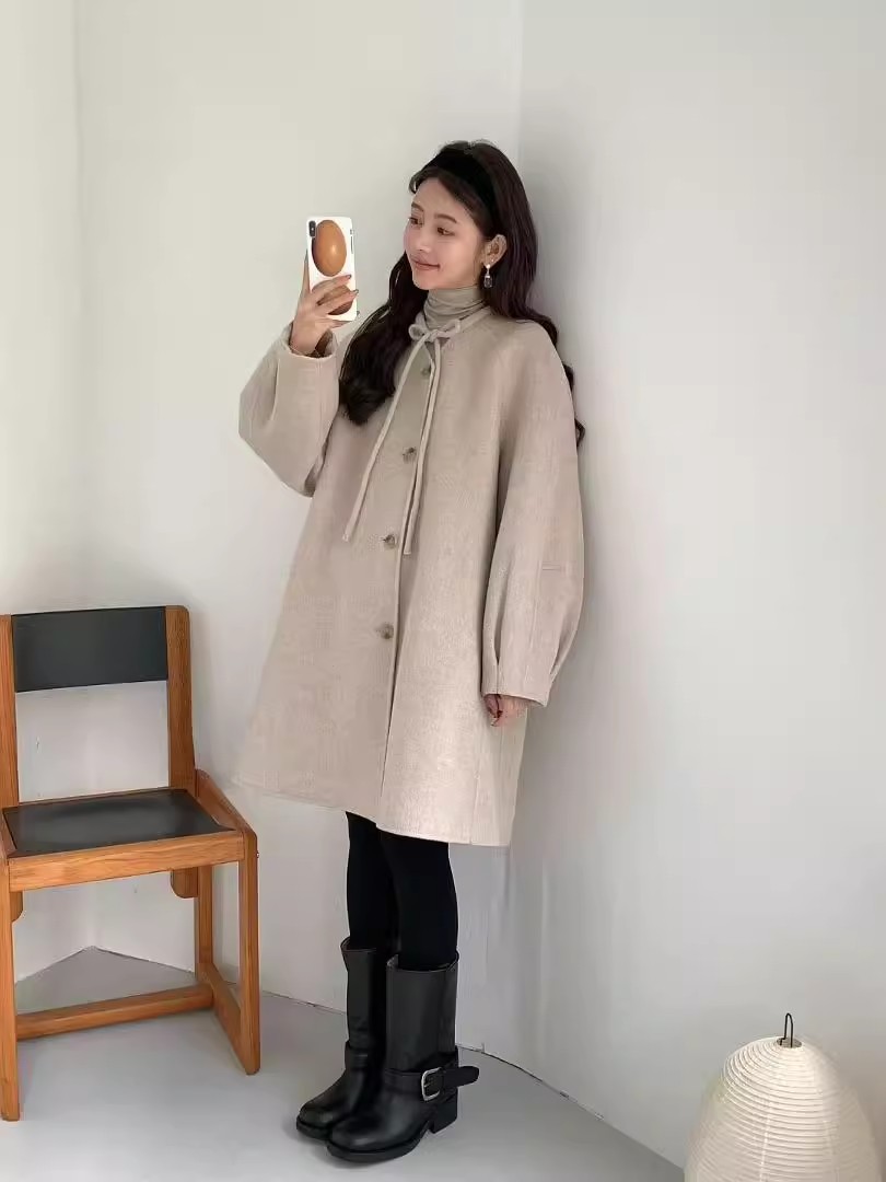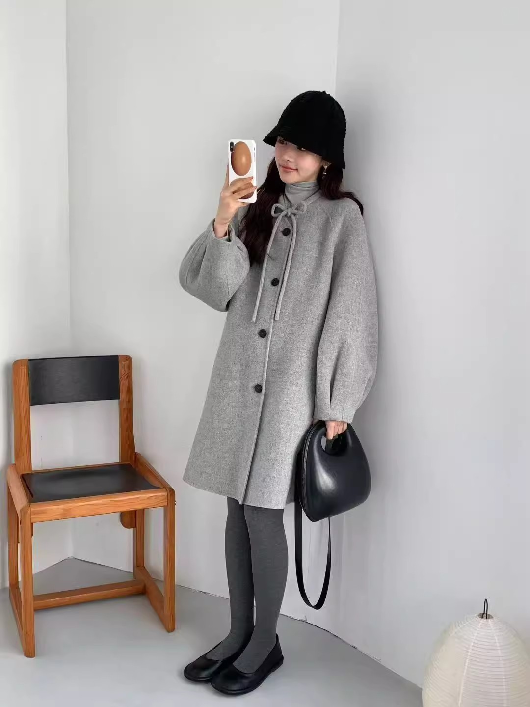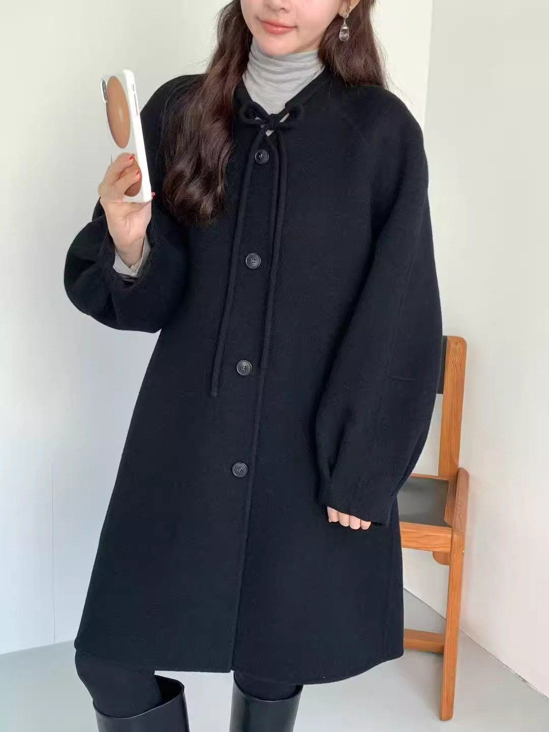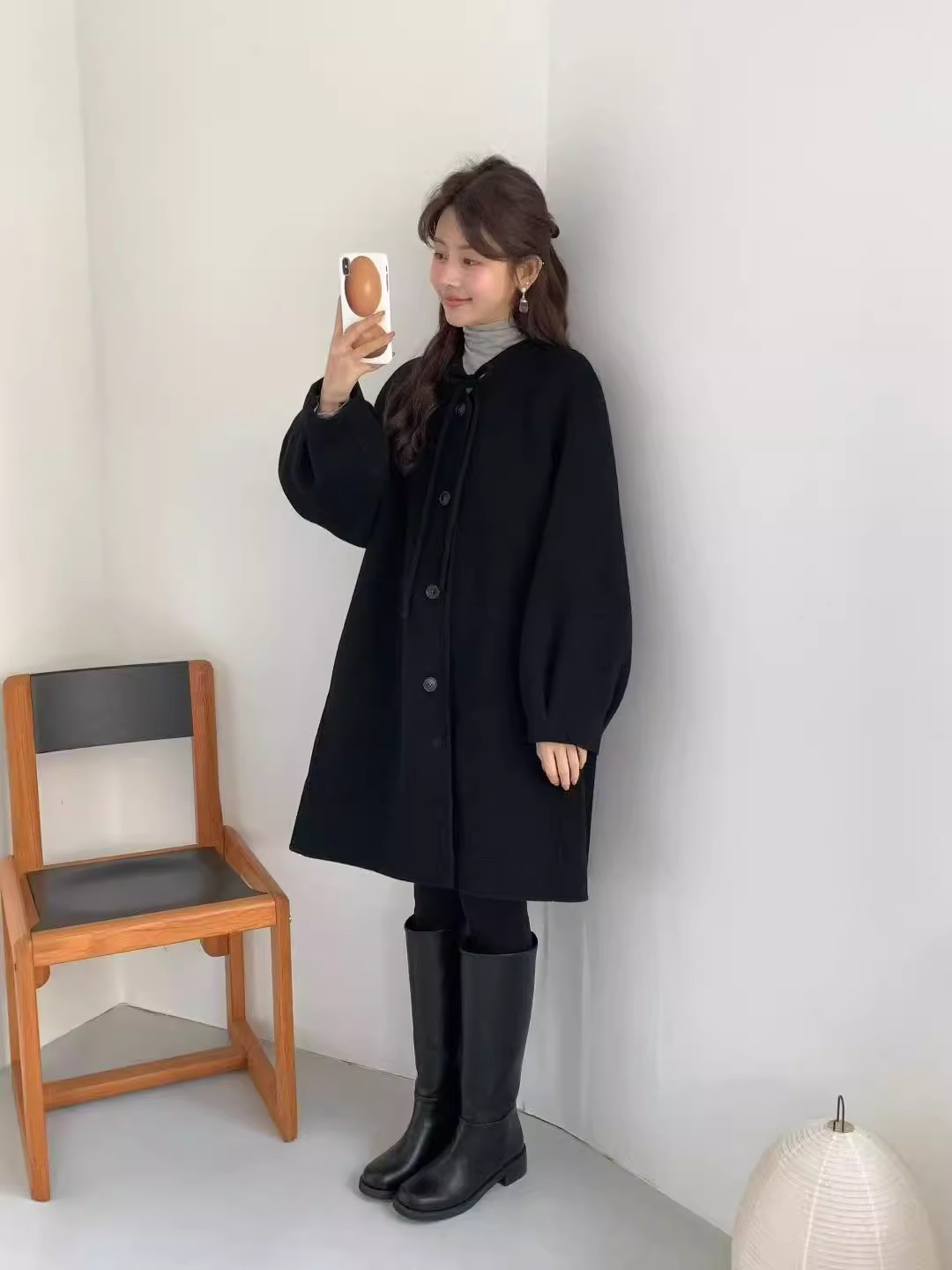EGG韩国同款!2025冬季小香风圆领蝴蝶结毛呢大衣女双面羊绒外套!