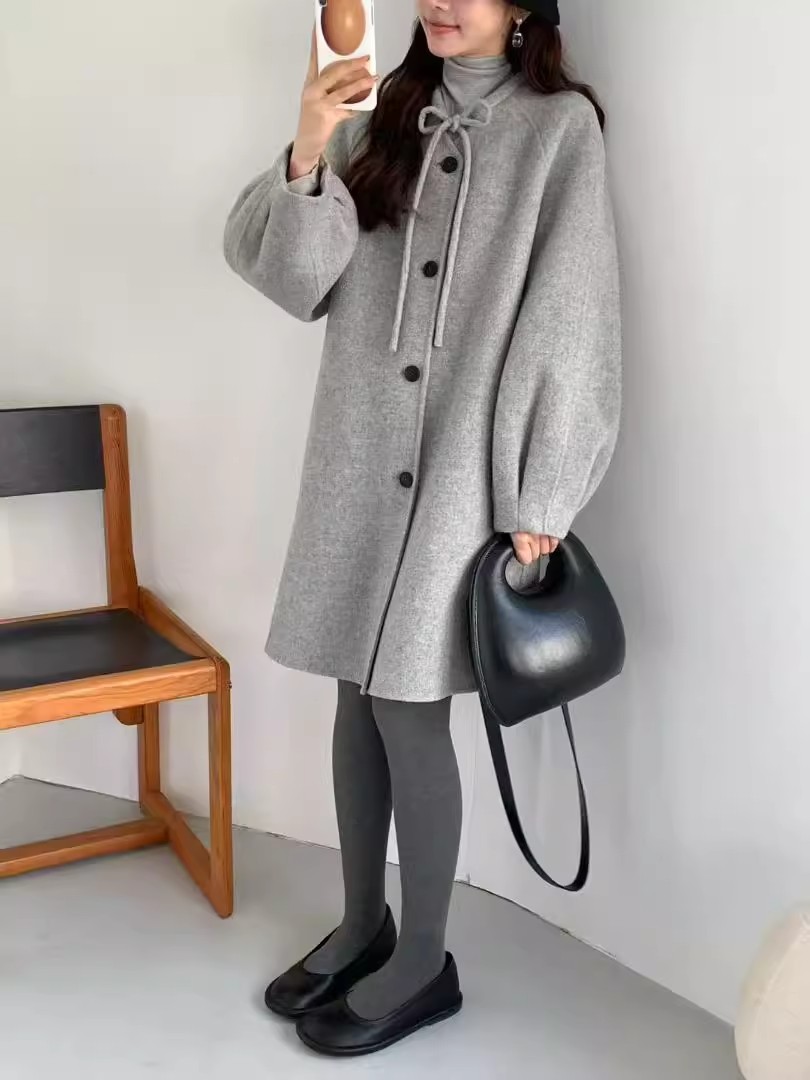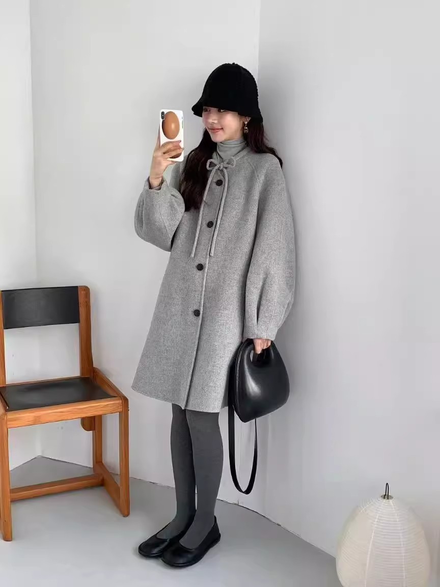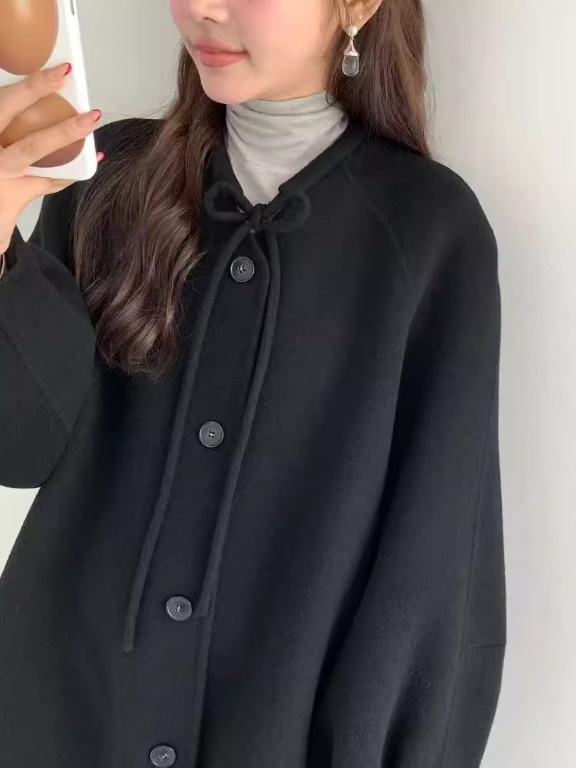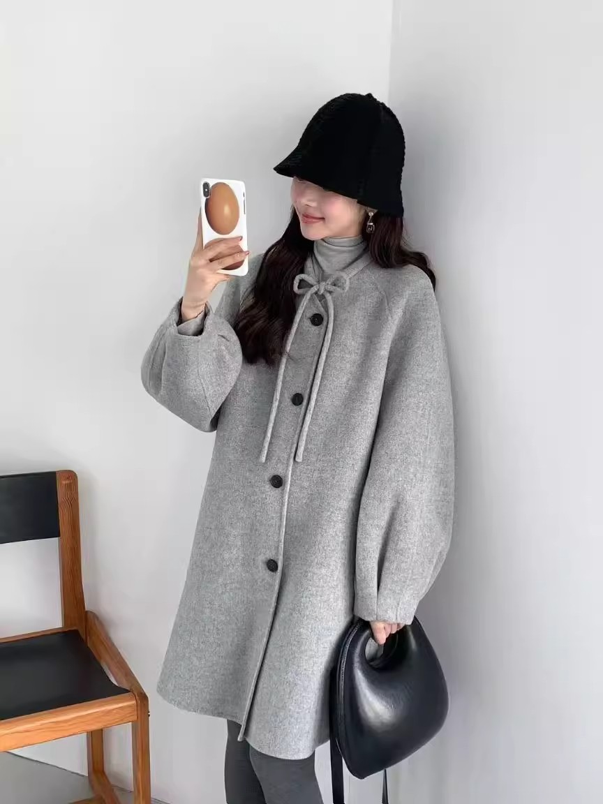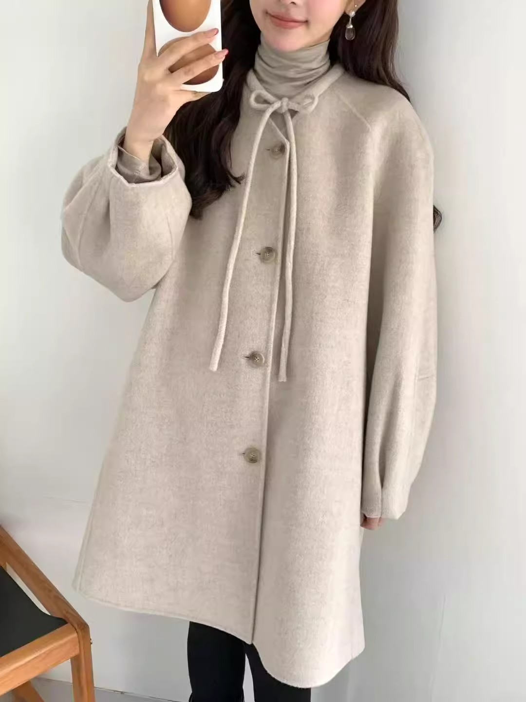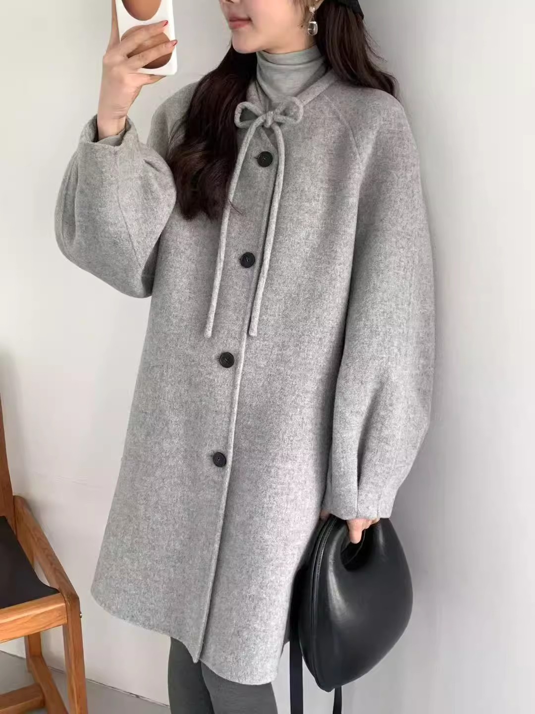 EGG韩国同款!2025冬季小香风圆领蝴蝶结毛呢大衣女双面羊绒外套!