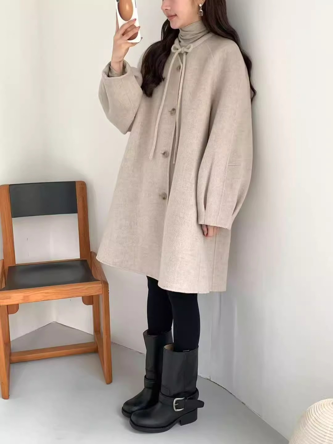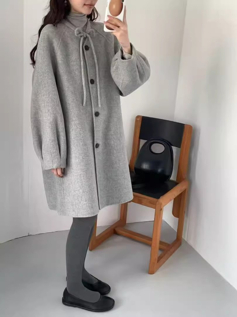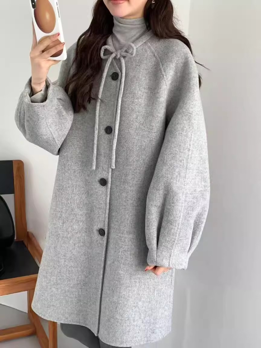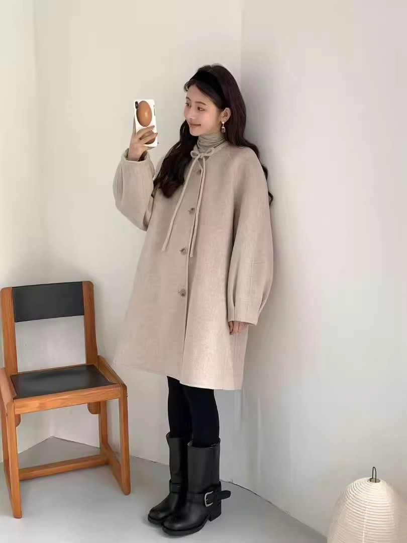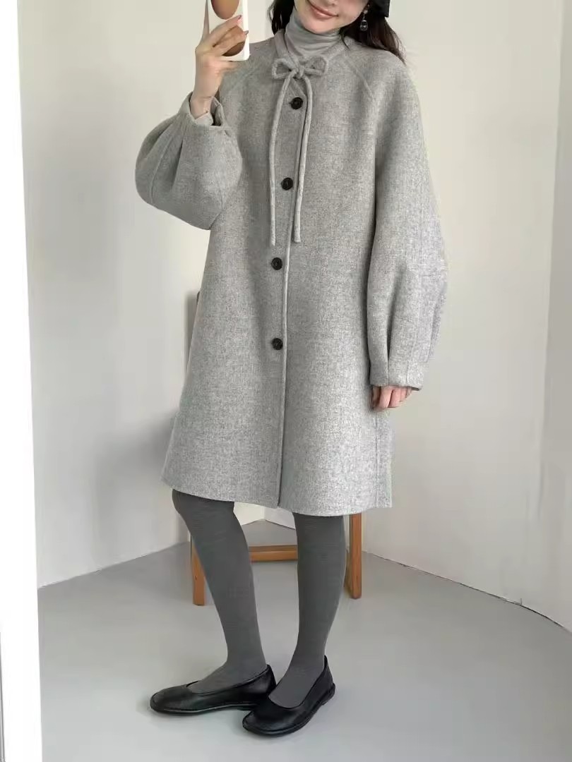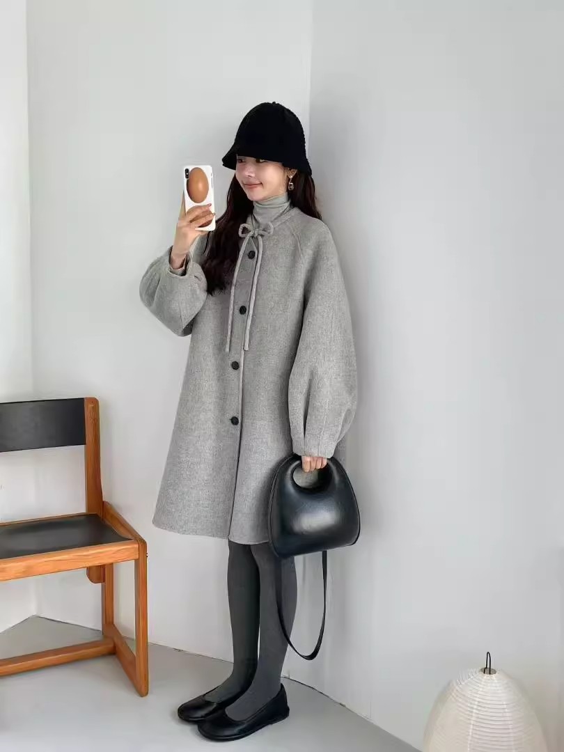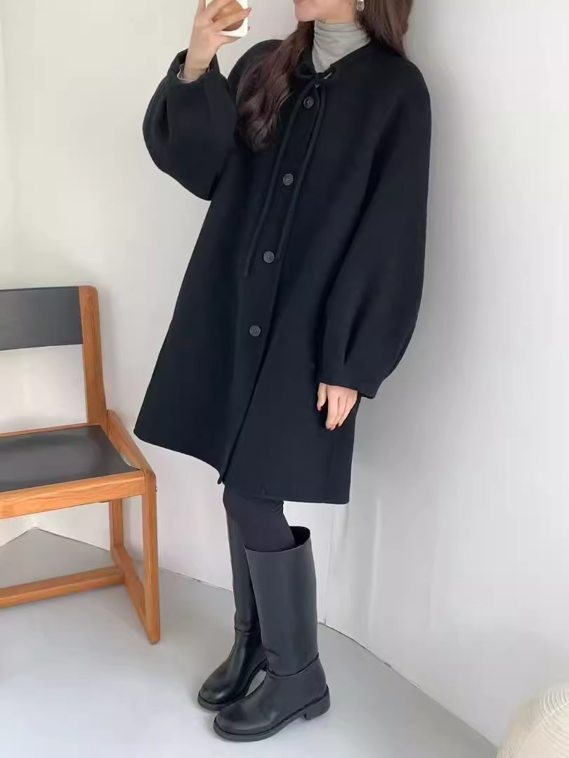EGG韩国同款!2025冬季小香风圆领蝴蝶结毛呢大衣女双面羊绒外套!