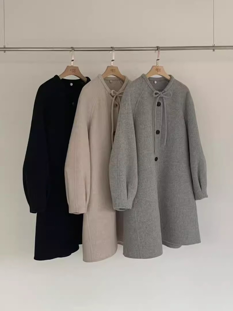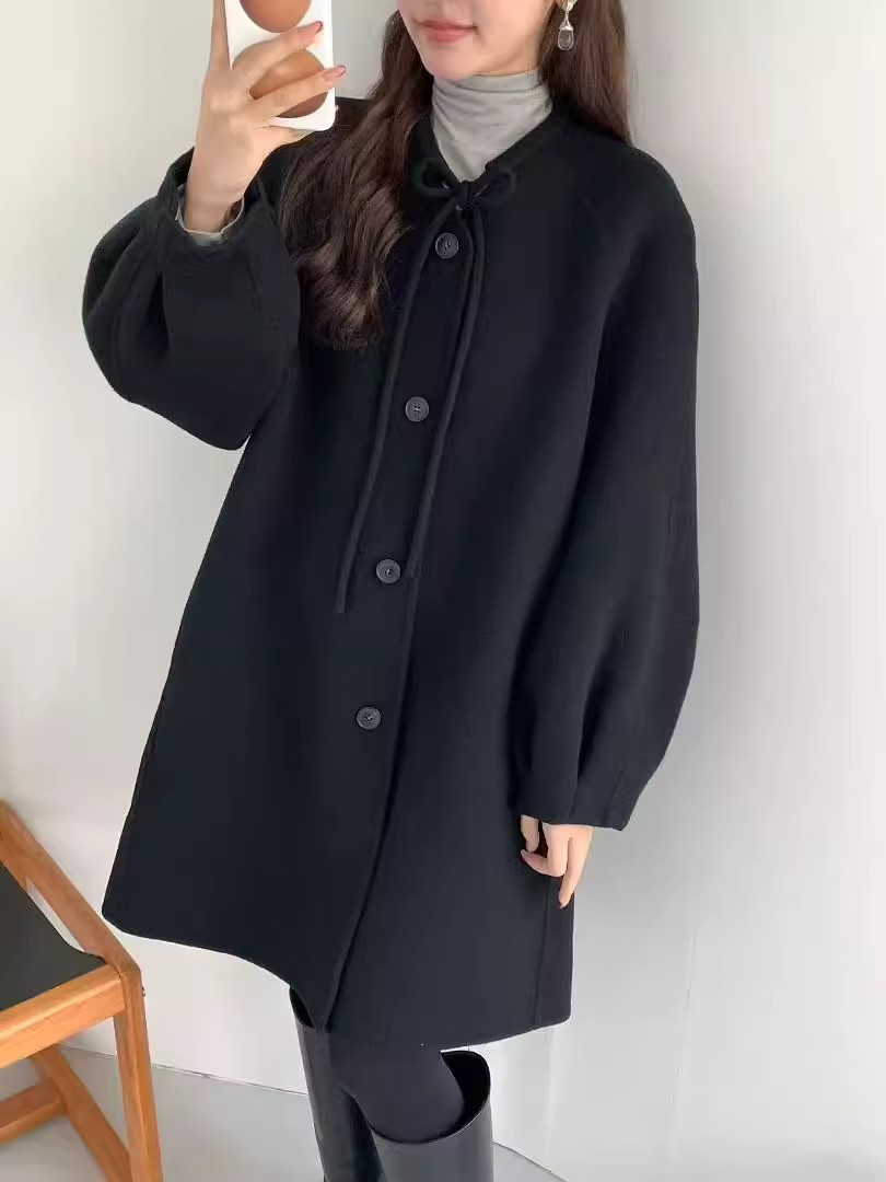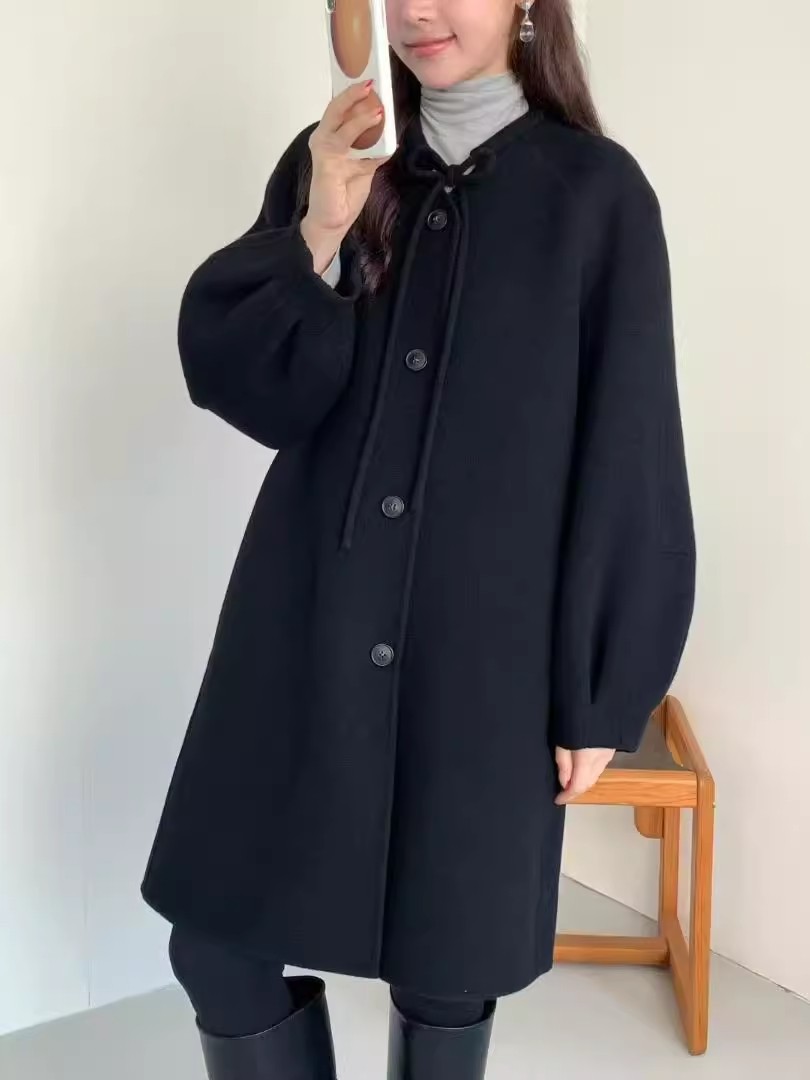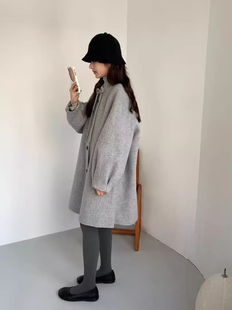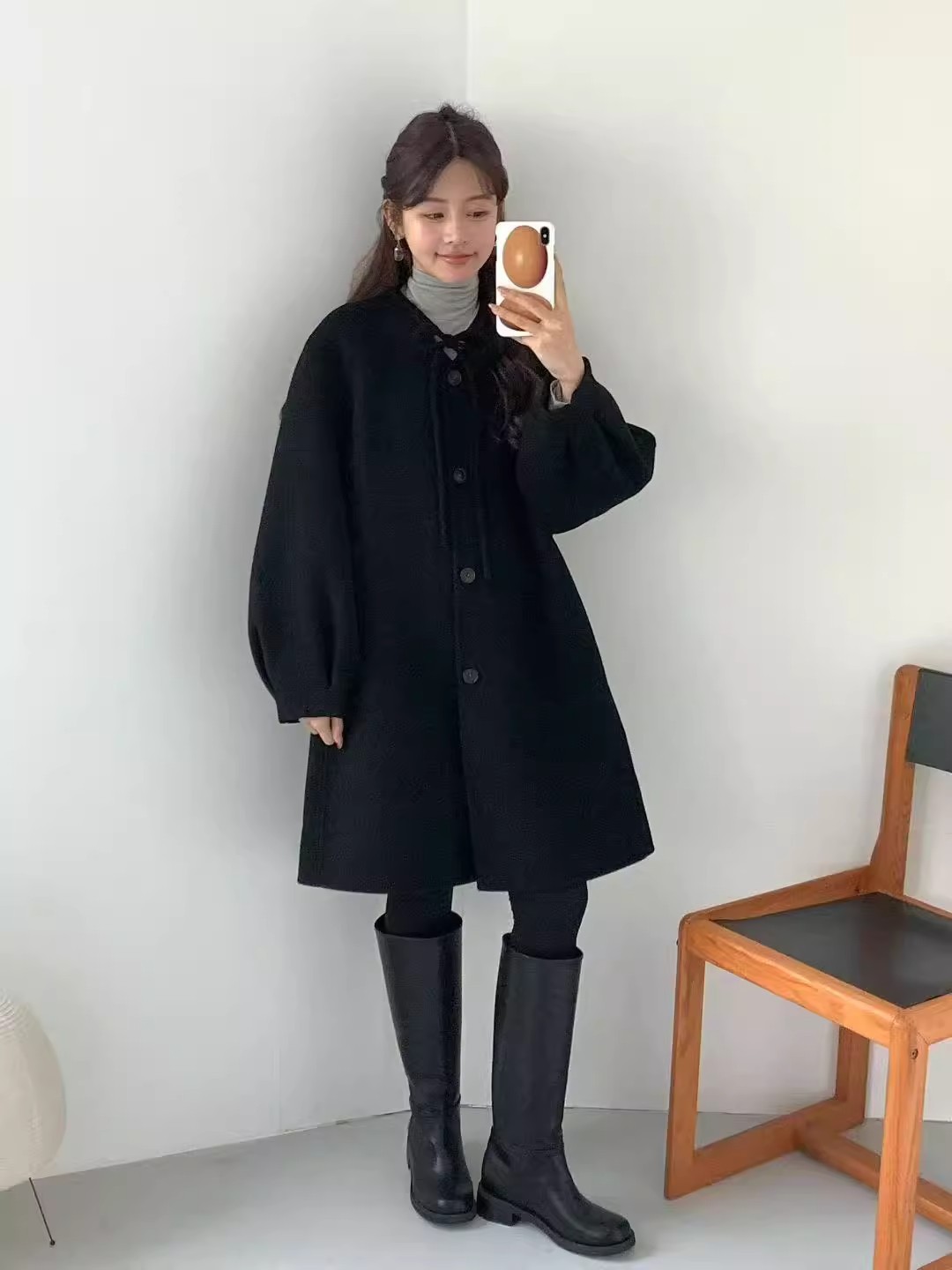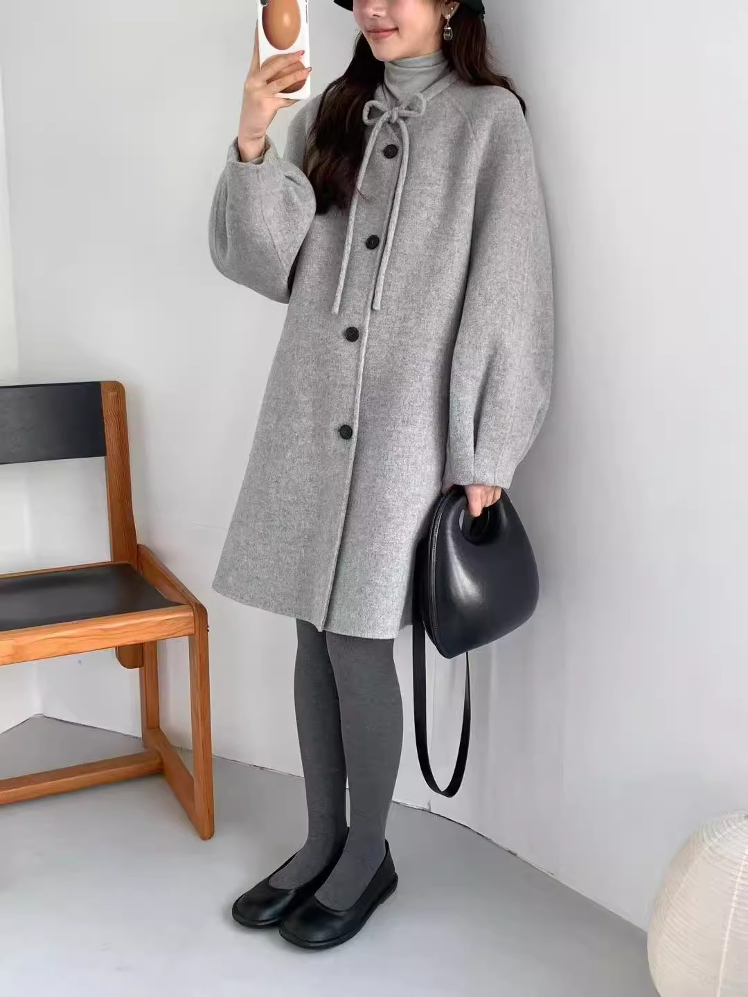 EGG韩国同款!2025冬季小香风圆领蝴蝶结毛呢大衣女双面羊绒外套!