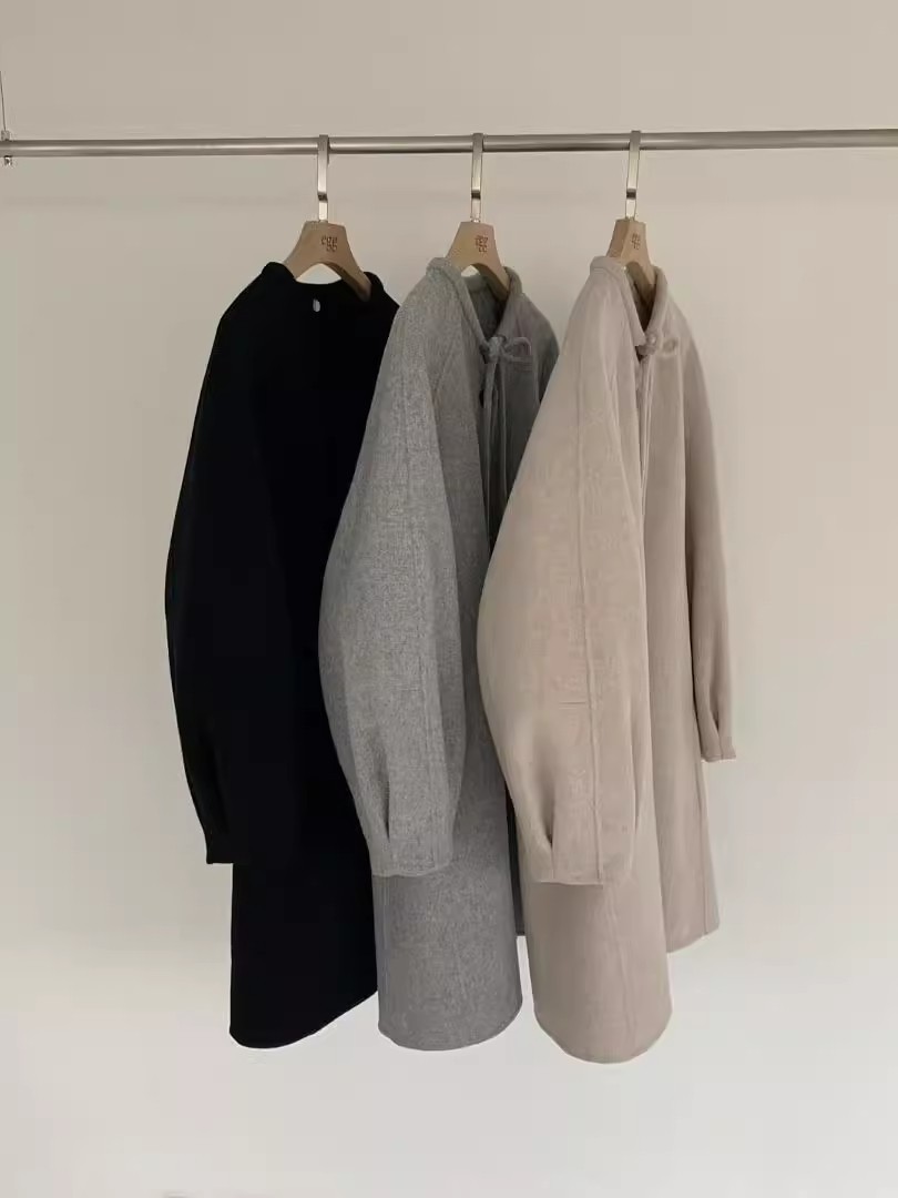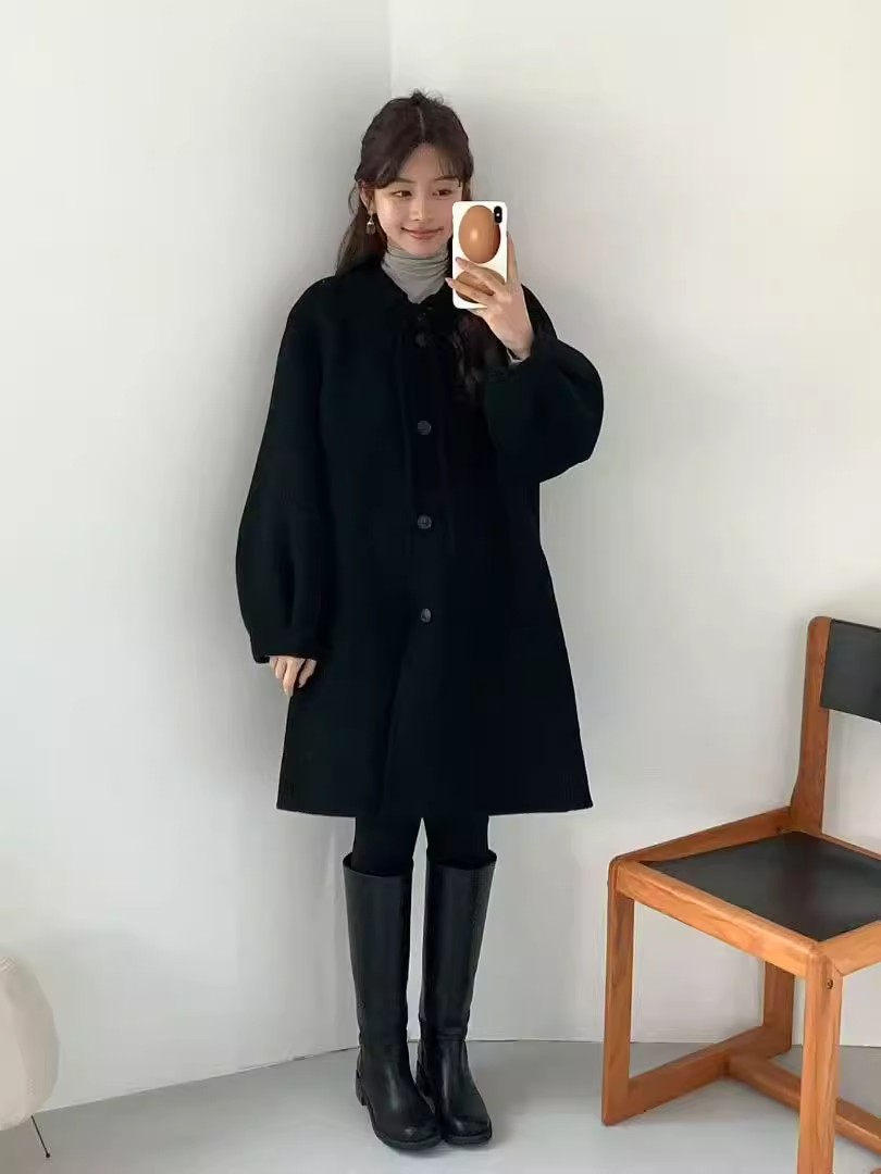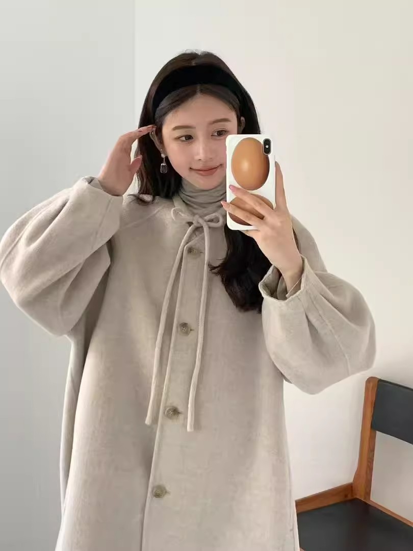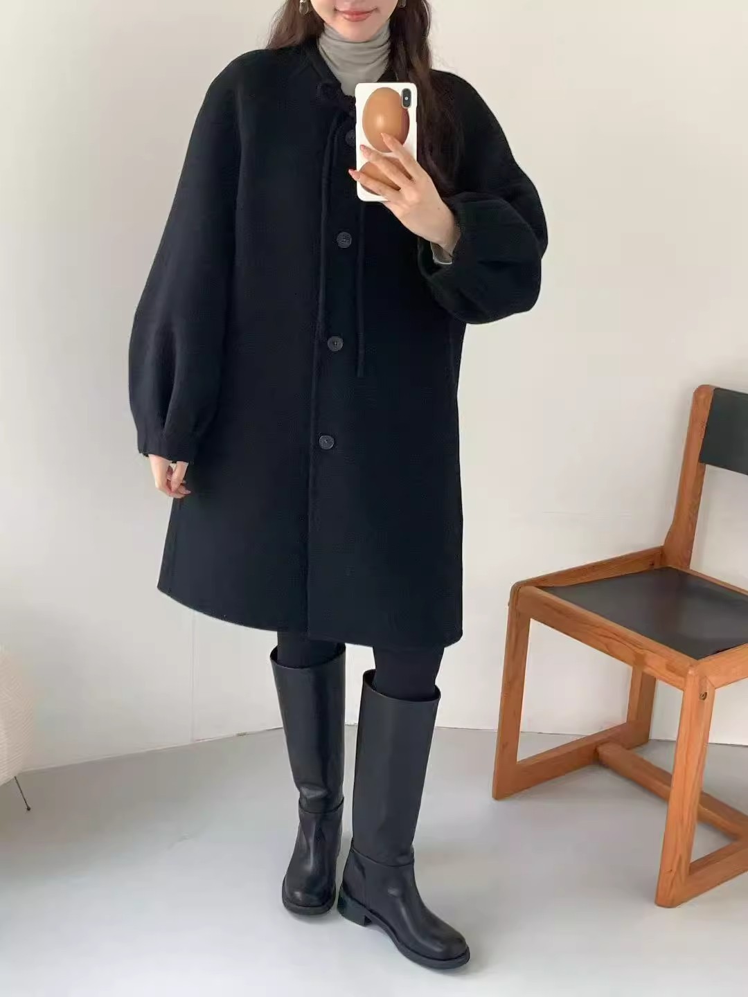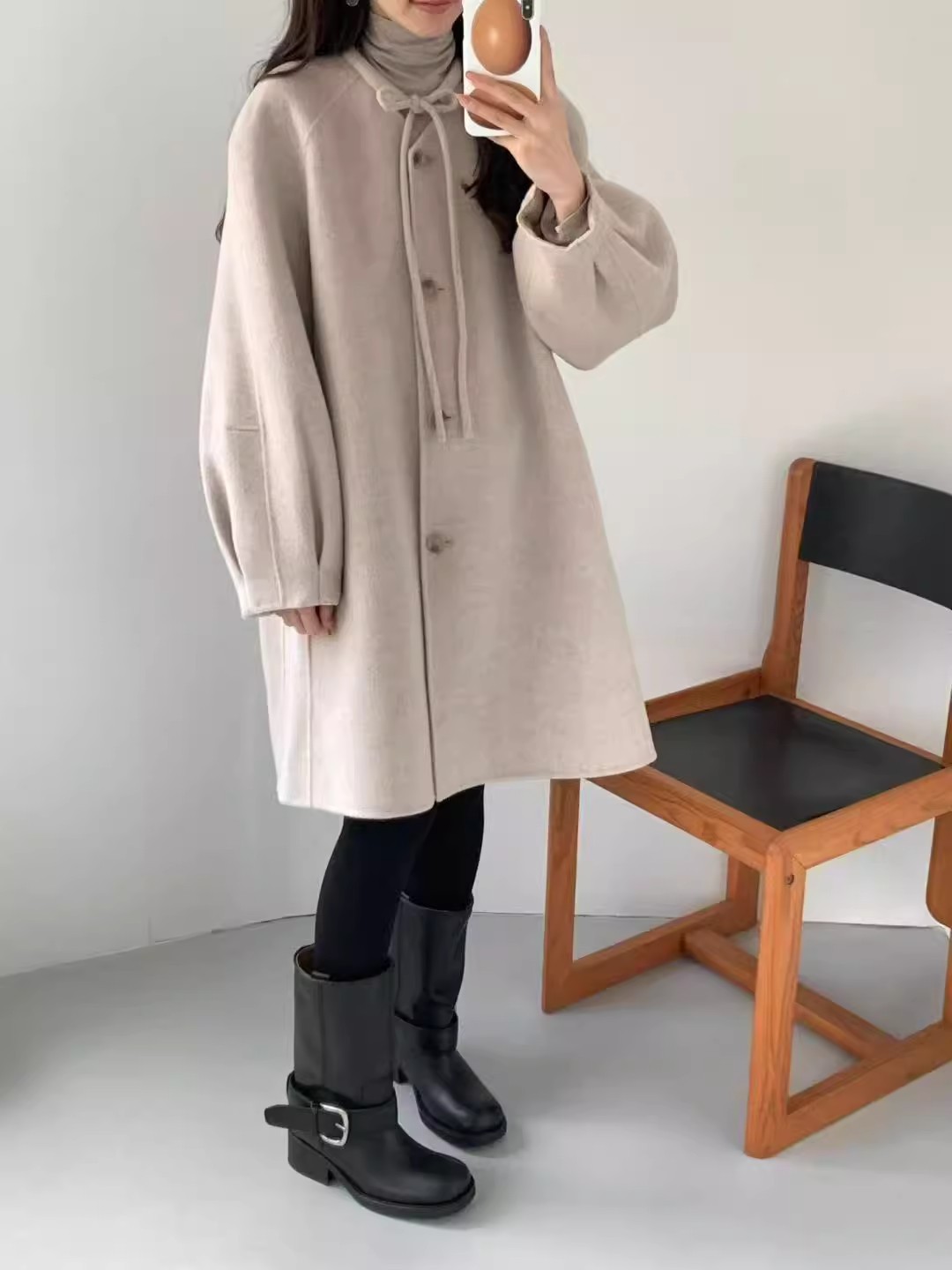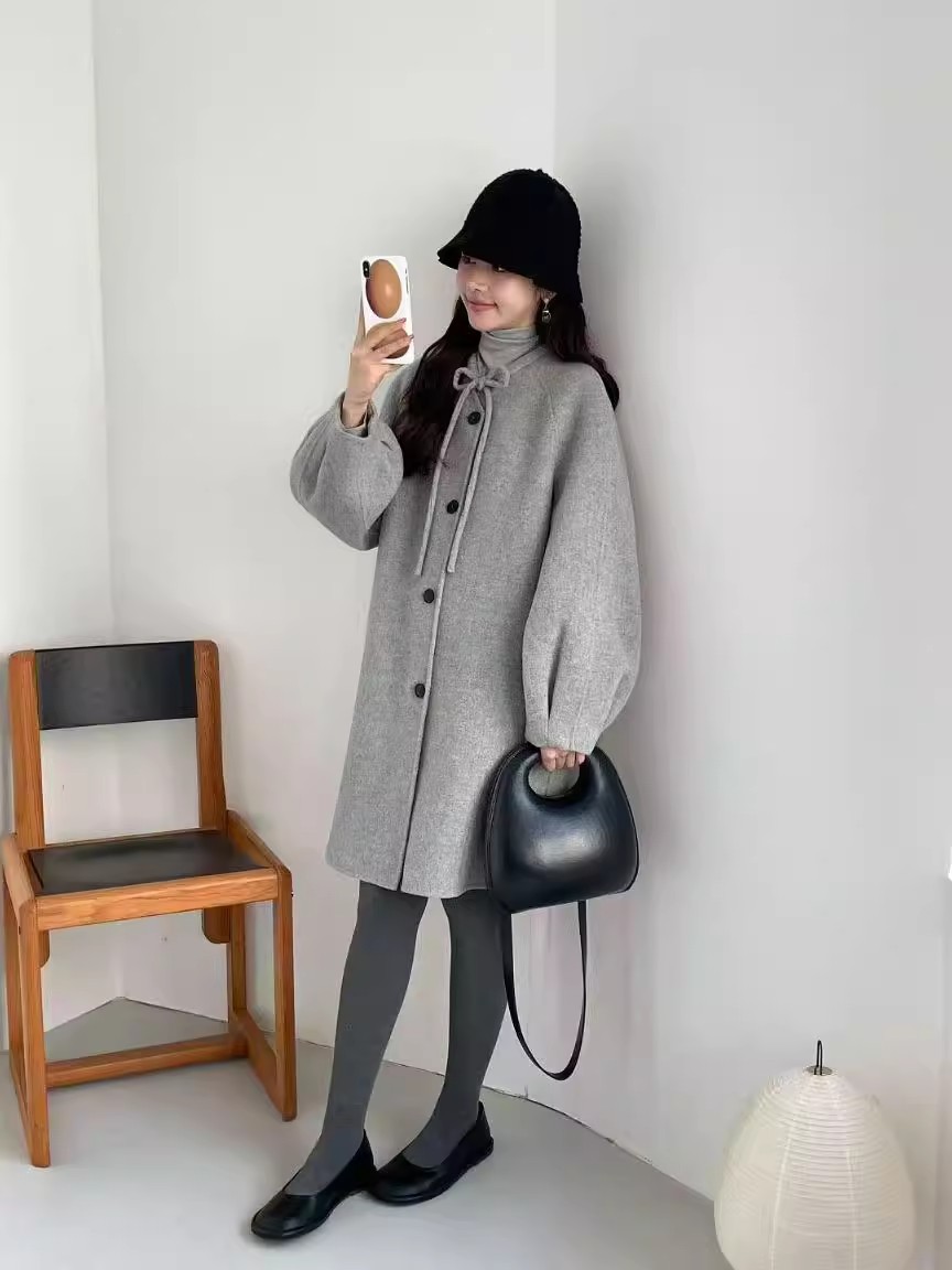 EGG韩国同款!2025冬季小香风圆领蝴蝶结毛呢大衣女双面羊绒外套!