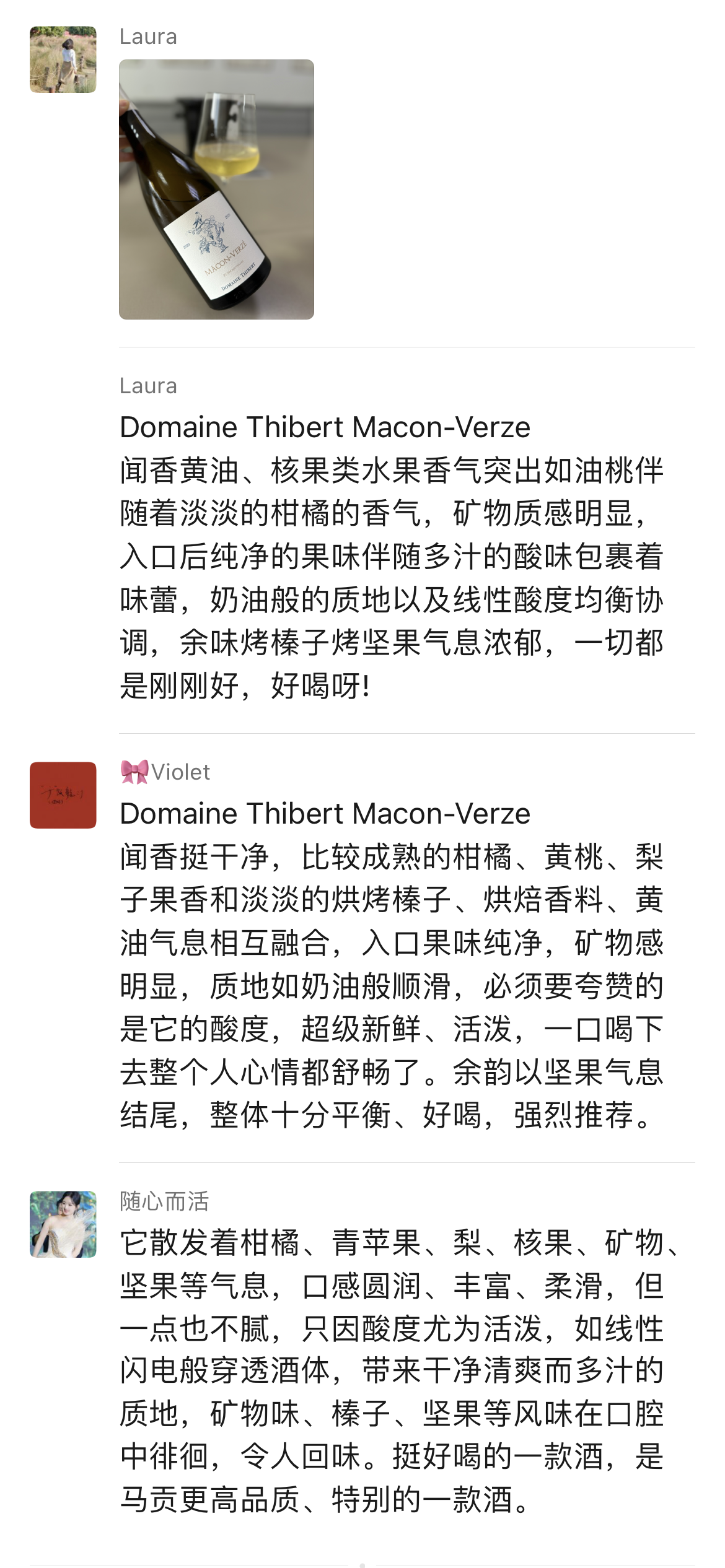 他们在诠释 Macon 的风格上让人非常惊喜,有点像蒙哈榭(Montrachet),入口没有想象中勃艮第南部的重酒精感,平衡感相当好,纯洁、优雅、舒适,你可以感受到力量背后的思考,也能感受到如清风拂过的温柔,所以有人称其为“马贡的蒙哈榭”、“马贡的风土调查员”,它很好地向世界展示了马贡的出彩风土和葡萄酒。现在,无论是随意走进一家法国的精品葡萄酒专卖店,亦或是米其林餐厅,我们通常很容易地找到 Thibert 的佳酿。