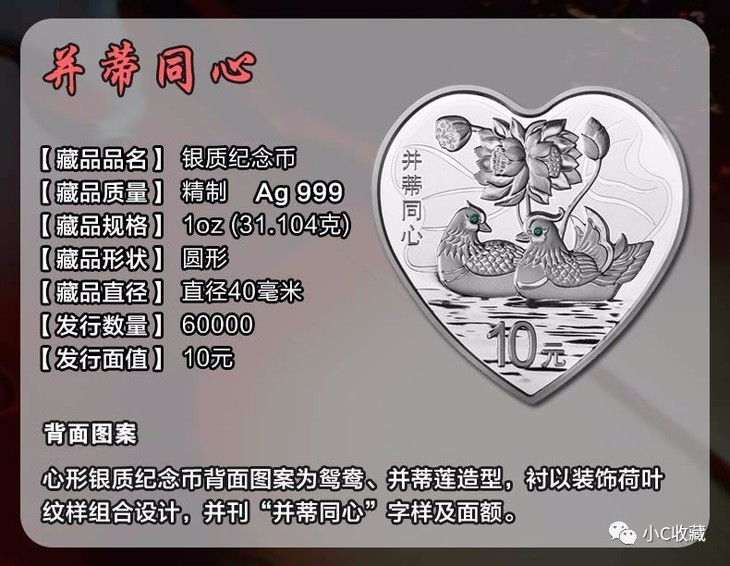 2015年“并蒂同心”纪念币,是我国首枚心形纪念币,我国的心形币可不多,一共才4套,仅占金银币总量的0.3%!