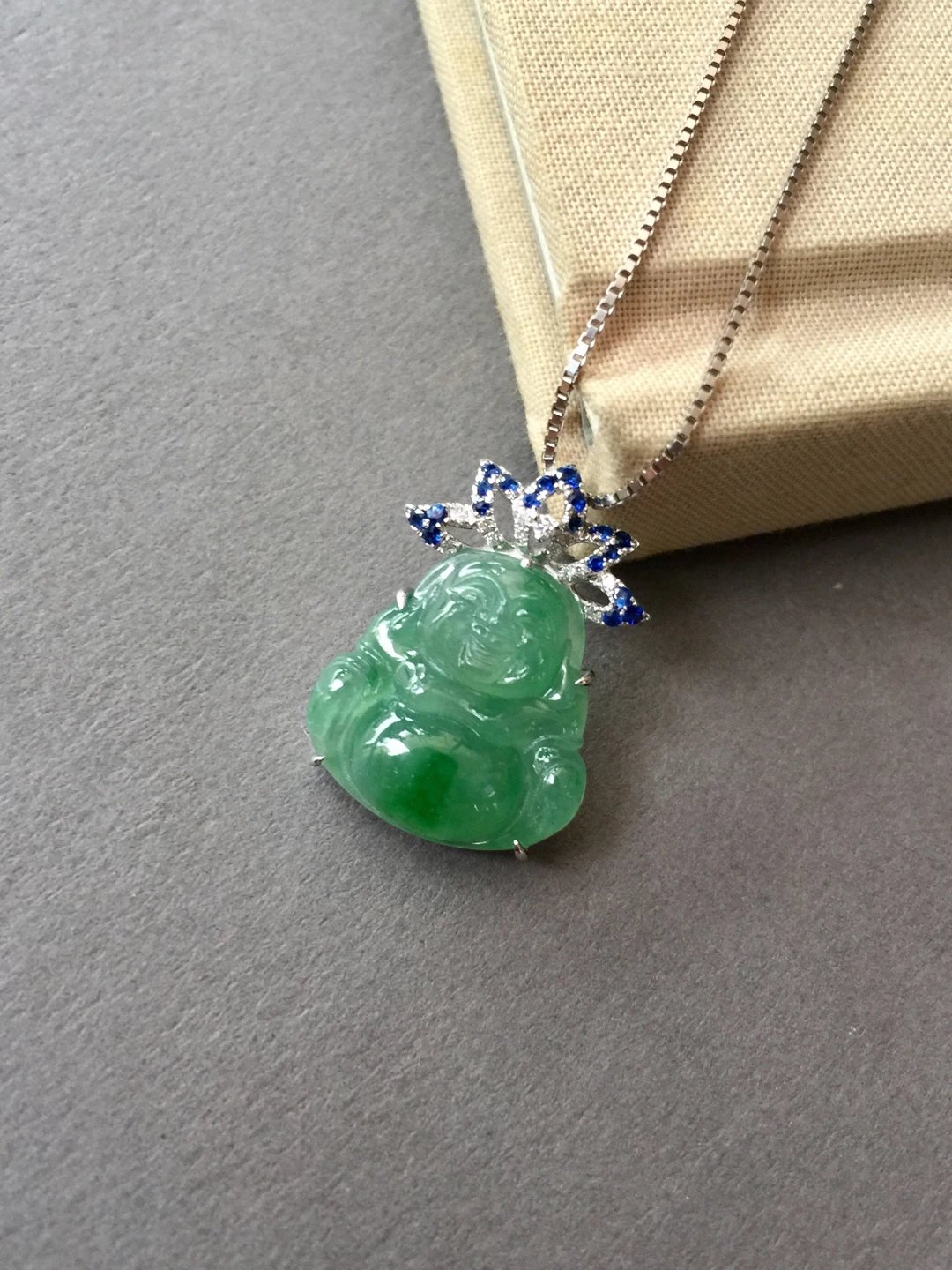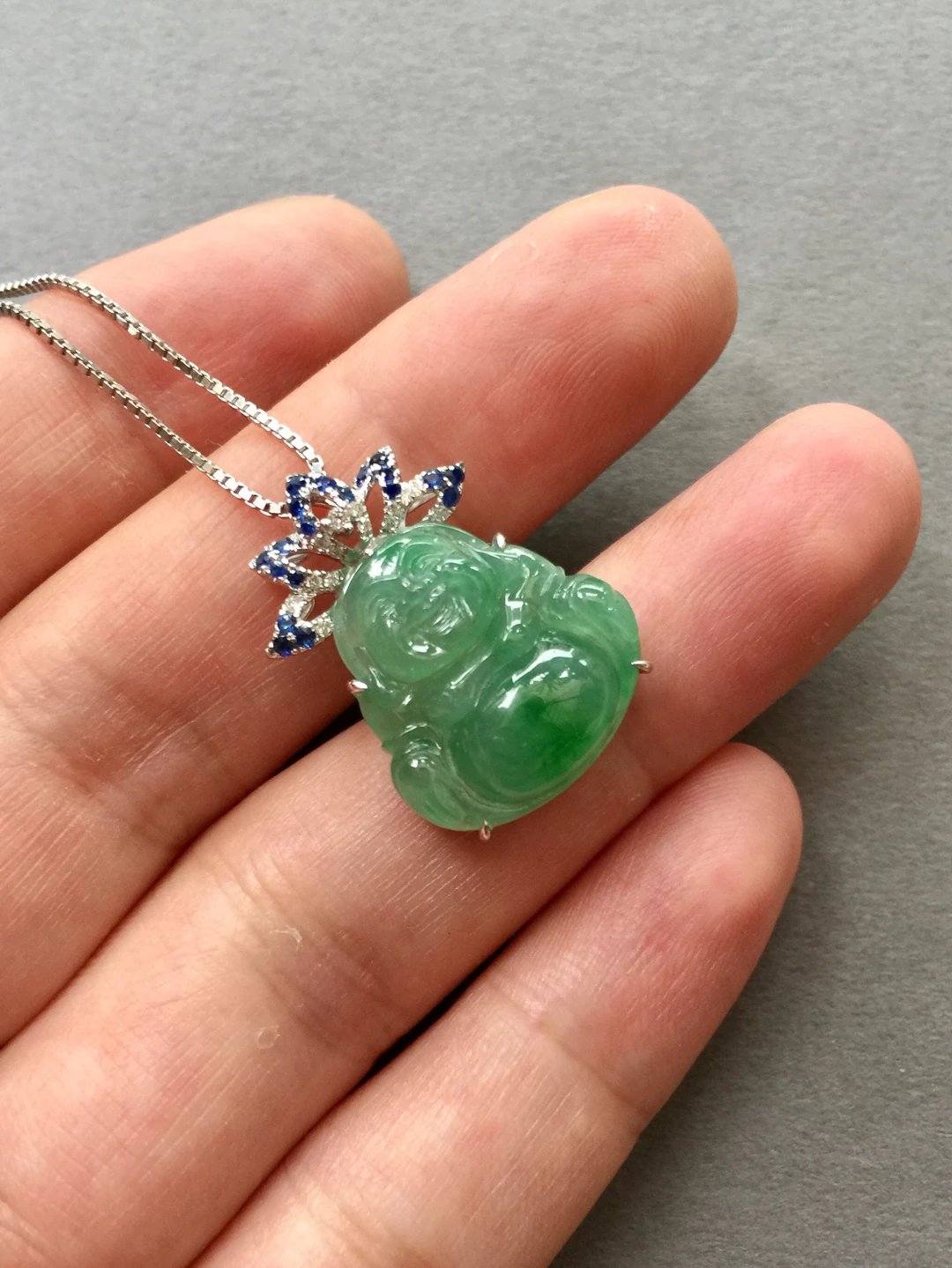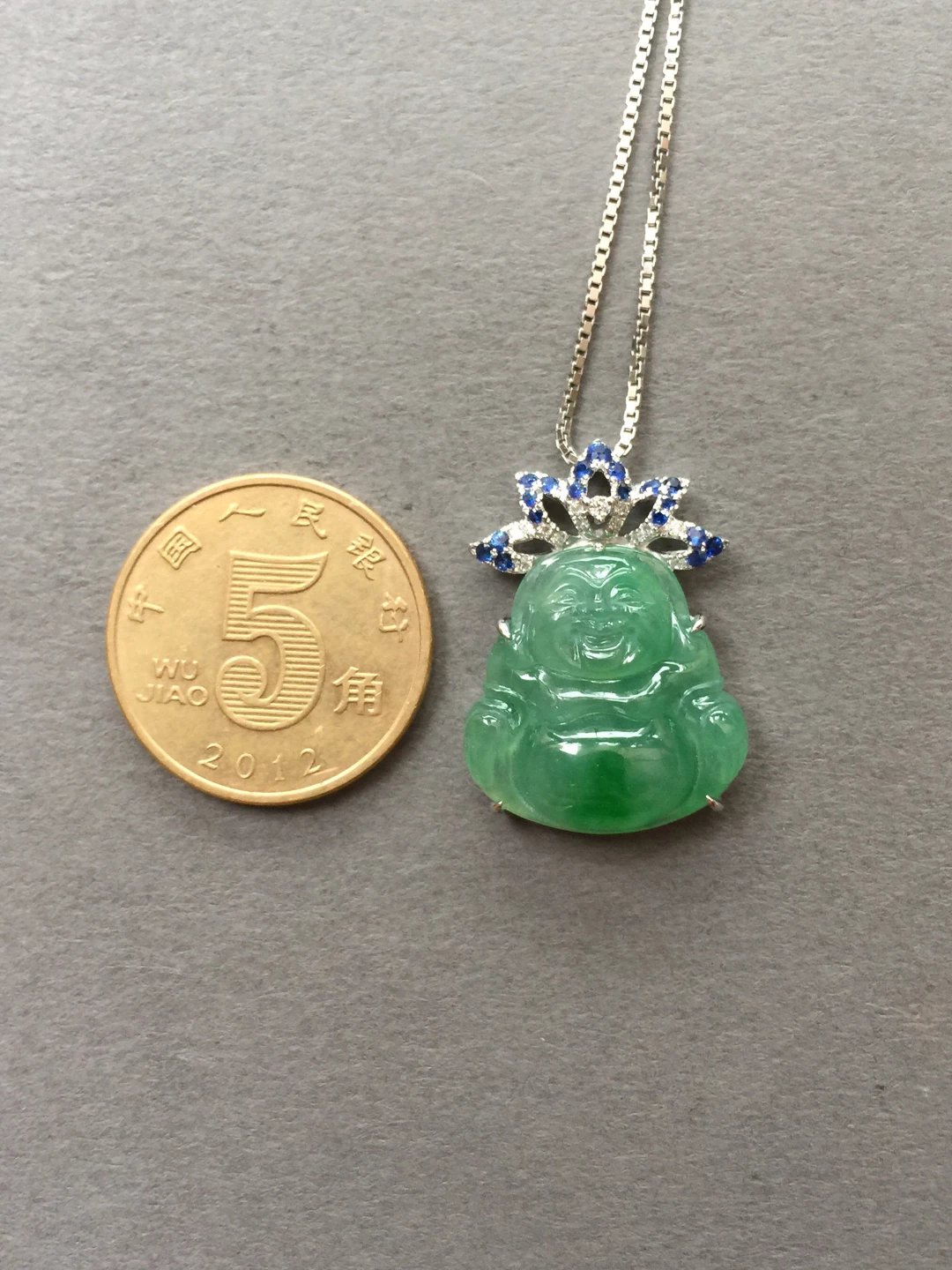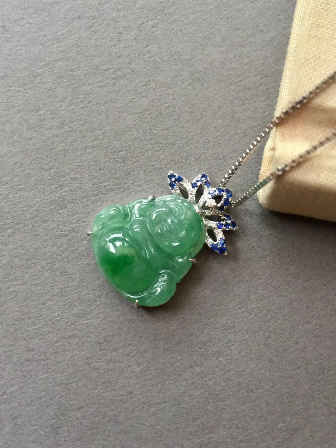 设计师款,花开见佛,翡翠冰种阳绿肚子俏色弥勒佛,17.3×16.9×5mm,镶嵌后23.5×16.9×6.9mm。18k白金钻石和蓝宝石镶嵌,时尚干练,璀璨夺目。种水晶莹剔透,绿色艳丽,一切就是那么与众不同