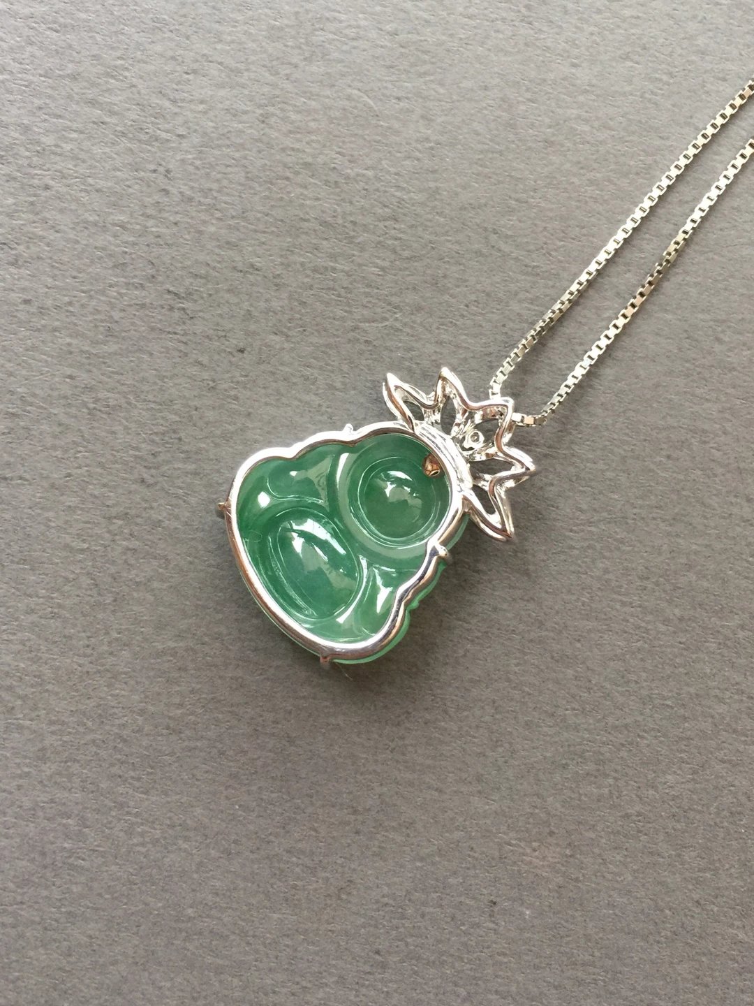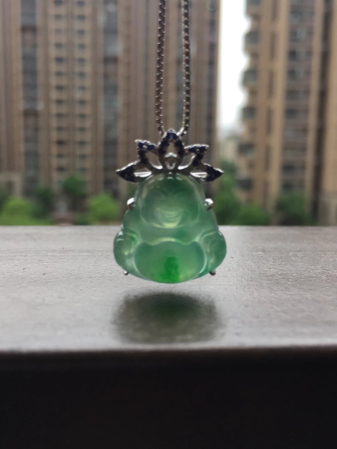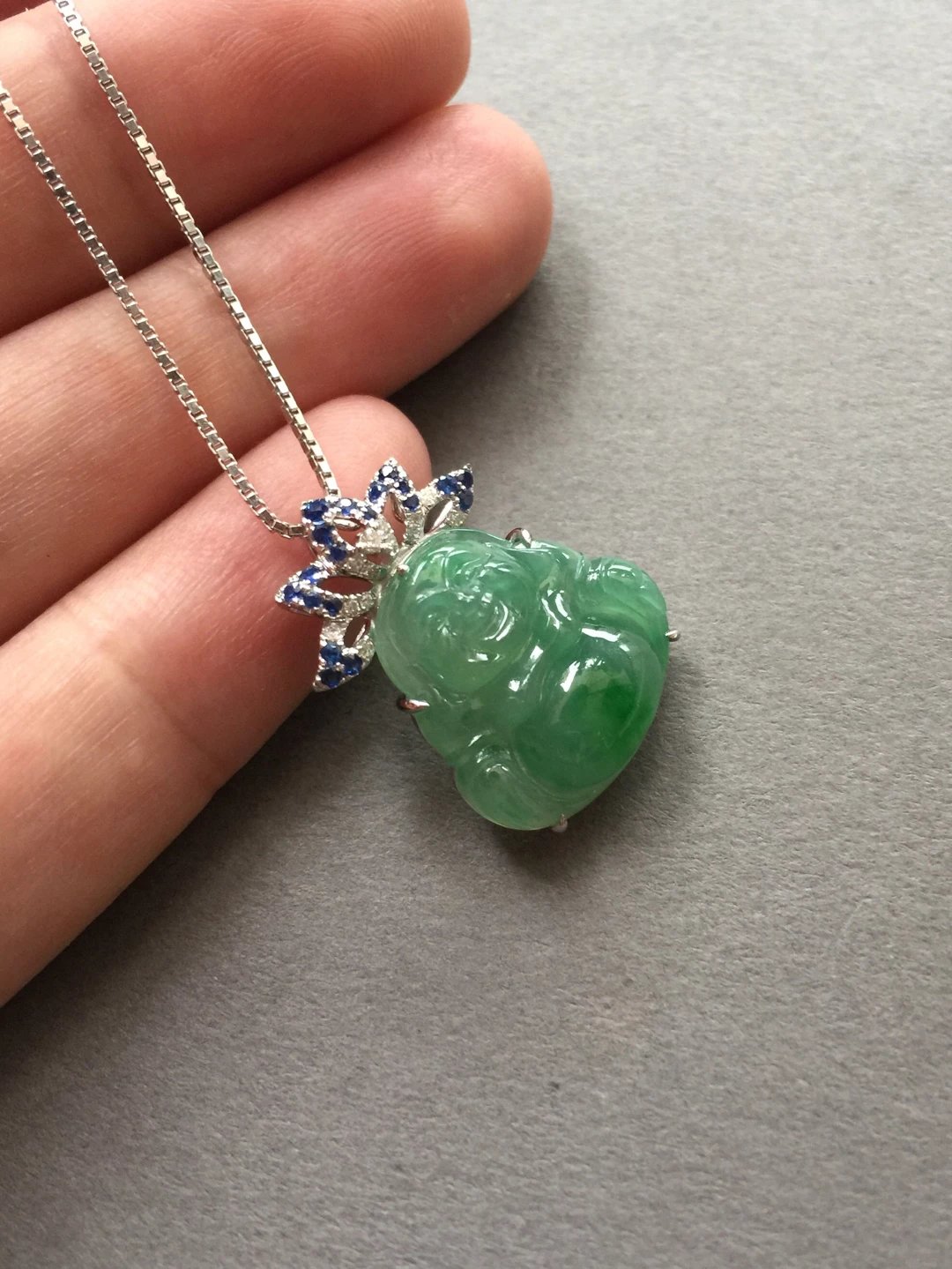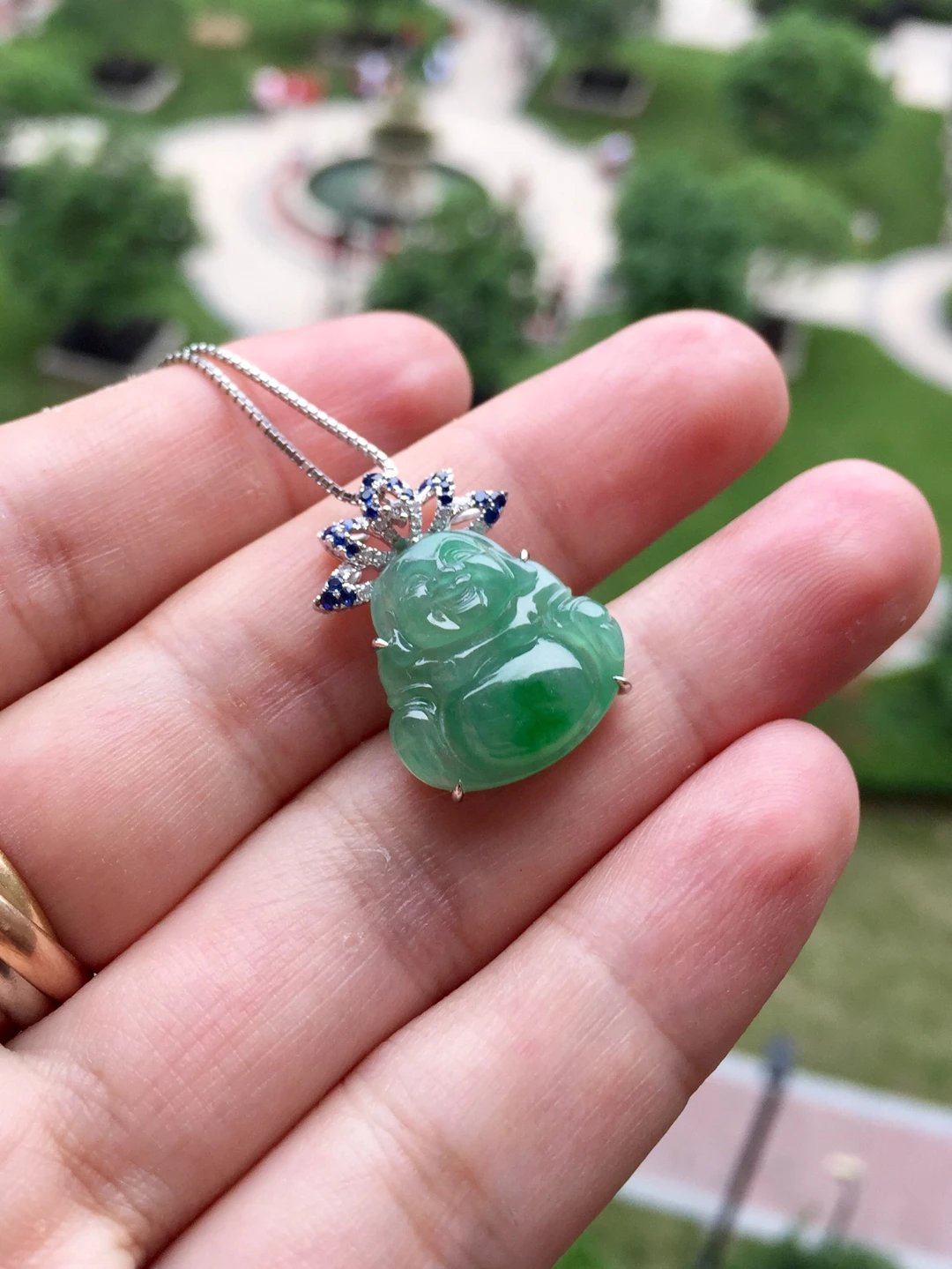 设计师款,花开见佛,翡翠冰种阳绿肚子俏色弥勒佛,17.3×16.9×5mm,镶嵌后23.5×16.9×6.9mm。18k白金钻石和蓝宝石镶嵌,时尚干练,璀璨夺目。种水晶莹剔透,绿色艳丽,一切就是那么与众不同