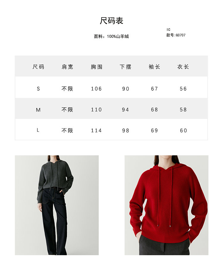 “软黄金”山羊绒织就,兼具品质感与舒适度,带来温暖的穿着体验,宽松廓形,包容多种身型,插肩袖型, 修饰肩颈线条,连帽抽绳,态度放松。
