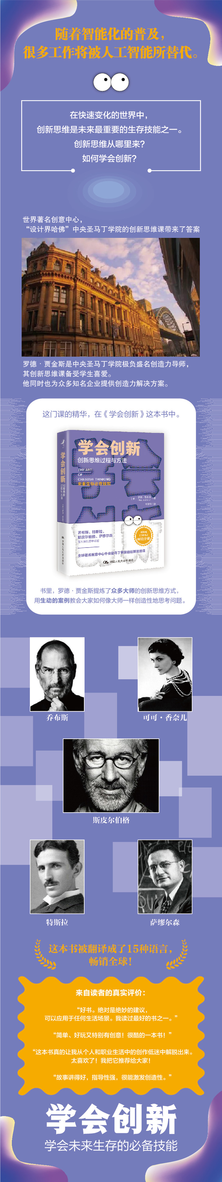 《学会创新》是训练和培养创新思维的**佳读物。全球**名创意中心中央圣马丁学院**名的创造力导师罗德•贾金斯,在本书中研究了乔布斯、特斯拉、斯皮尔伯格、萨缪尔森、香奈儿、费曼等创造力大师是如何思考的。他将他们的思考方式提炼出来,并用很多案例,来帮助读者掌握创新思维的方法和技巧。