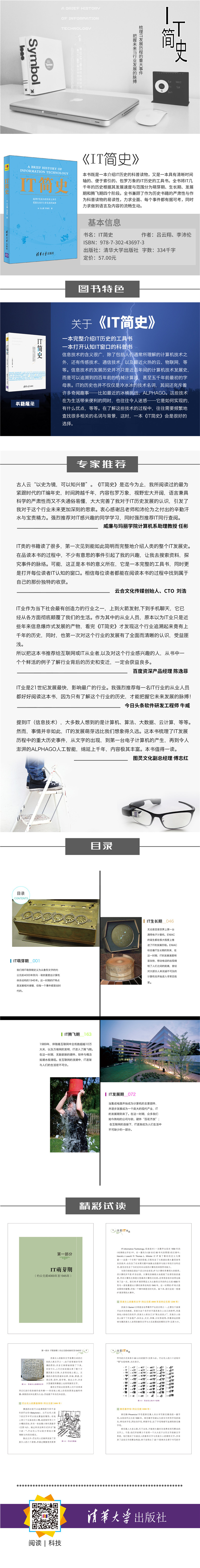 古人云“以史为镜,可以知兴替”。这是迄今为止,我所阅读过的最为紧跟时代的IT编年史,时间跨越千年,内容包罗万象,视野宏大开阔,语言兼具科学的严肃性而又不失通俗易懂,大大地完善了我对于IT历史发展的认识,引发了我对于这个行业未来更加深刻的思索。衷心感谢吕老师和沛伦为之付出的辛勤的汗水与宝贵的精力。强烈推荐对IT感兴趣的同学学习,同时强烈推荐IT同行查阅。 威廉与玛丽学院计算机系助理教授 任彬 IT类的书籍读了很多,第一次见到能如此简明而完整地介绍人类的整个IT发展史。本书是了解IT史的引子。在品读本书的过程中,不少有意思的事件引起了我的兴趣,让我去搜索资料,探究事件的脉络。可能,这正是本书的意义所在,它是一本完整的工具书,同时更是打开每位读者IT认知的窗口。相信每位读者都能在阅读本书的过程中找到属于自己的那份独特的收获。 云合文化传媒创始人、CTO 刘浩 IT业作为当下社会最有创造力的行业之一,上到火箭发射、下到手机聊天,它已经从各方面彻底颠覆了我们的生活。作为其中的从业人员,原本以为IT业只是近些年来信息爆炸式发展的产物,看完《IT简史》才发现这个行业追溯起来竟有上千年的历史,同时,也第一次对这个行业的发展有了全面而清晰地认识,受益匪浅。 所以把这本书推荐给互联网或IT从业者、以及对这个行业感兴趣的人,从书中一个个鲜活的例子,了解行业背后的历史和变迁,一定会获益良多。 百度资深产品经理 陈逸菲 IT业是21世纪发现最快,影响最广的行业。我强烈推荐每一名IT行业的从业人员都好好阅读这本书,因为只有了解这个行业的历史,才能把握它未来发展的脉搏! 今日头条软件研发工程师 牛威 提到IT(信息技术),大多数人想到的是计算机、算法、大数据、云计算,等等。然而,事情并非如此,IT的发展萌芽远比我们想象得久远。这本书梳理了IT发展历程中的重大历史事件,从文字的出现,到第一台电子计算机的产生,再到令人澎湃的AlphaGo人工智能,绵延上千年,内容极其丰富。本书值得一读。 图灵文化副总经理 傅志红 |