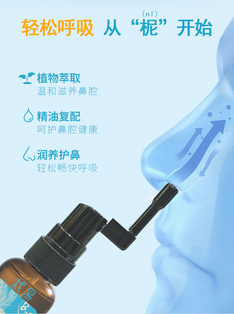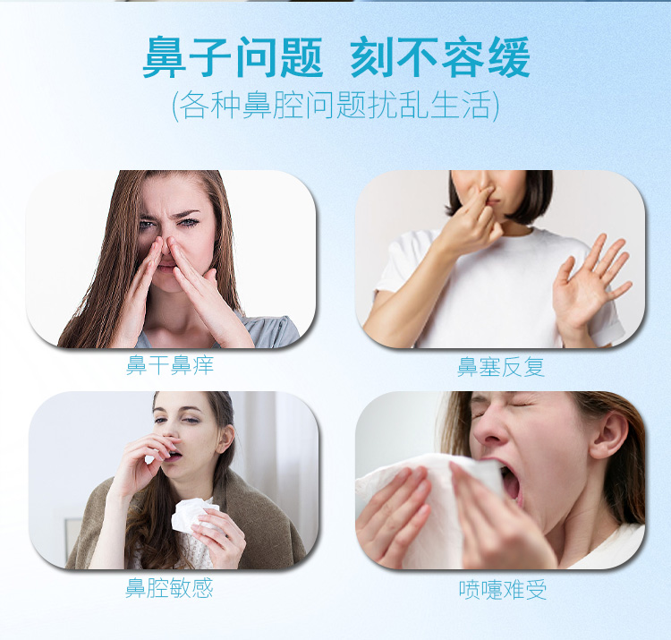 ①针对性缓解,改善鼻腔状态缓解鼻塞、鼻干、鼻痒:通过天然成分的滋养与渗透,帮助湿润鼻腔黏膜,软化鼻垢,缓解因干燥、过敏引发的鼻塞、鼻痒症状;