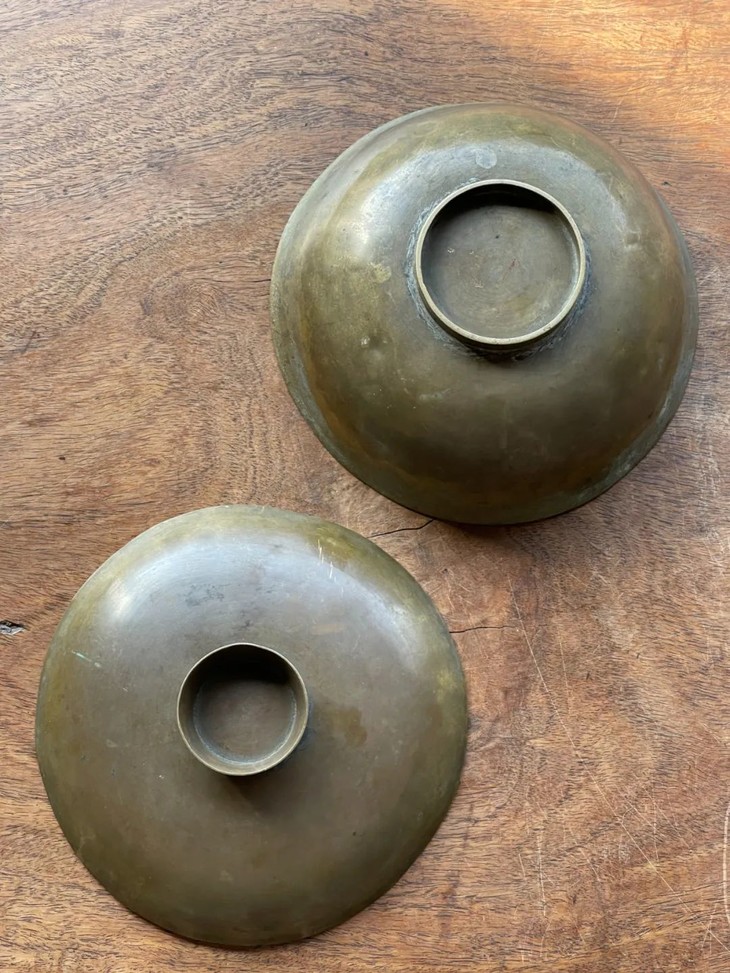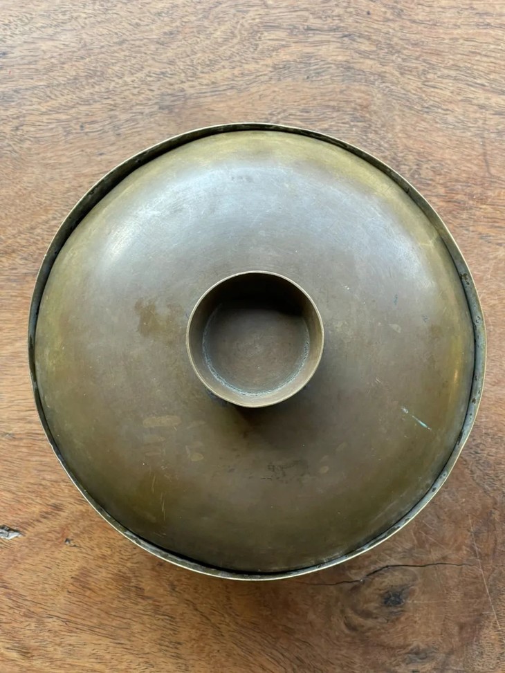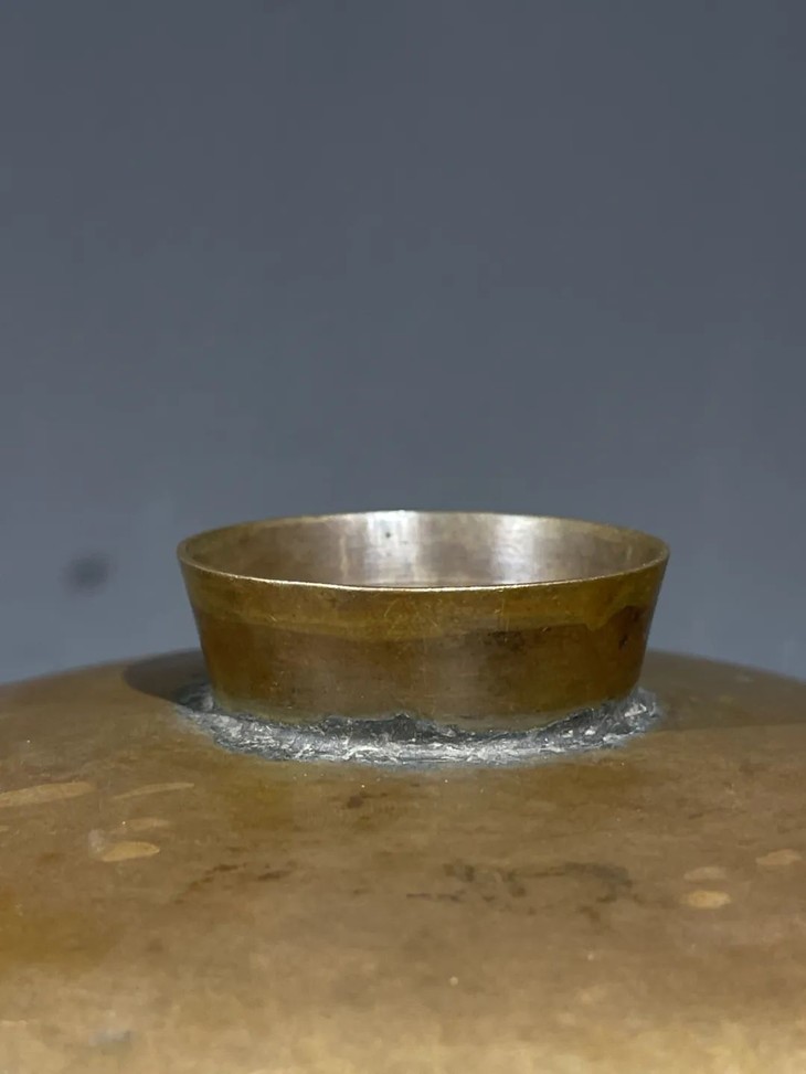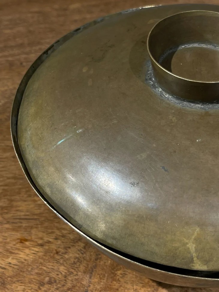 这是一只造型简单制作严谨的薄胎青铜鎏锡茶席盖碗,比重高、材质坚硬的精炼铜精心捶打、精细琢磨成优雅的成薄胎圆腹深碗与碗盖,内壁鎏锡以防沏茶有铜金属味,精良铜质,薄胎造形优雅大方,敲击发出悦耳响声,依铜质与造型判断,应是用于沏盖碗茶的大公道碗。