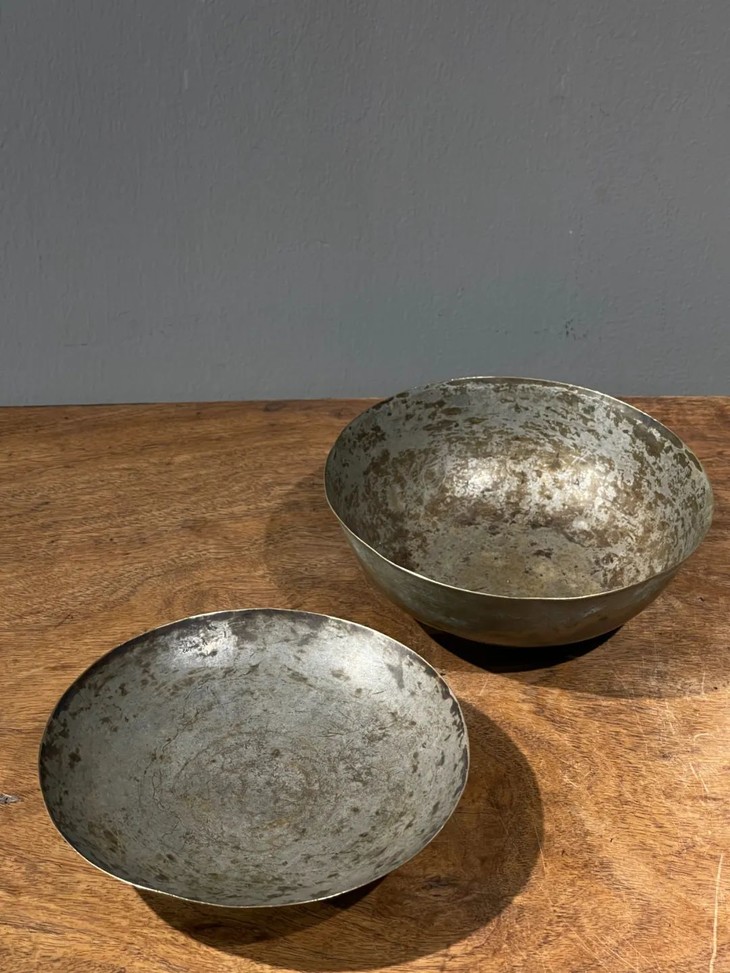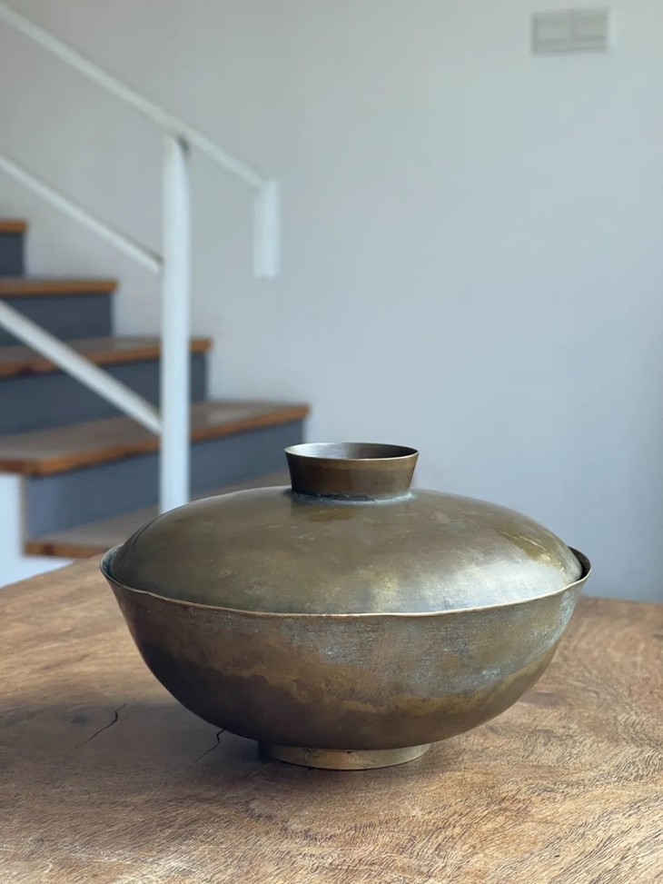 此薄胎青铜鎏锡茶席盖碗,胎体清薄飘逸、造型圆满优美,青铜与鎏锡表面斑驳包浆皮壳细腻油润,尽显“少即是多”以及器物“用之美”的审美情趣。