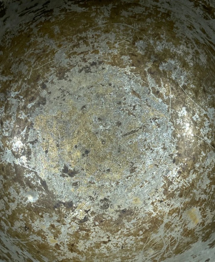 此薄胎青铜鎏锡茶席盖碗,如图所示,除稍有碰撞歪斜,以及表面细微斑驳磨痕与刮痕外,整体基本保存完好无损。是一件年代久远的实用茶具,流传数百年后,仍然坚固耐用,殊属难能可贵。