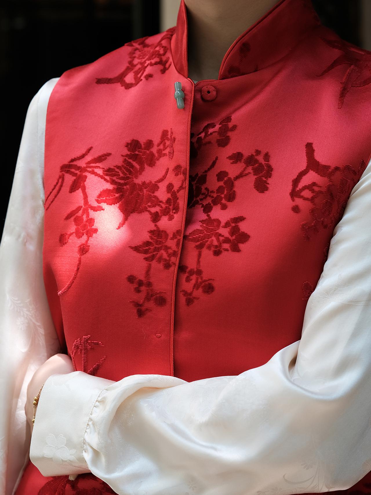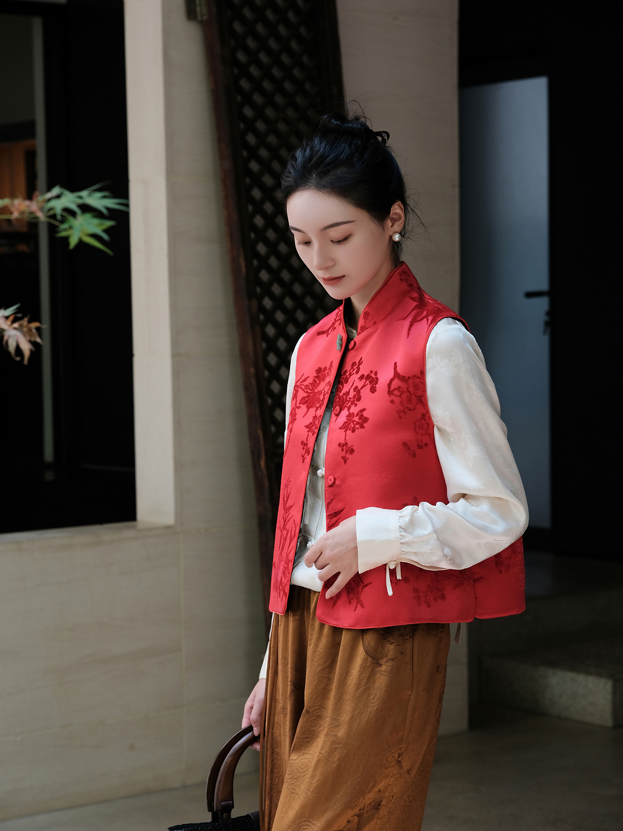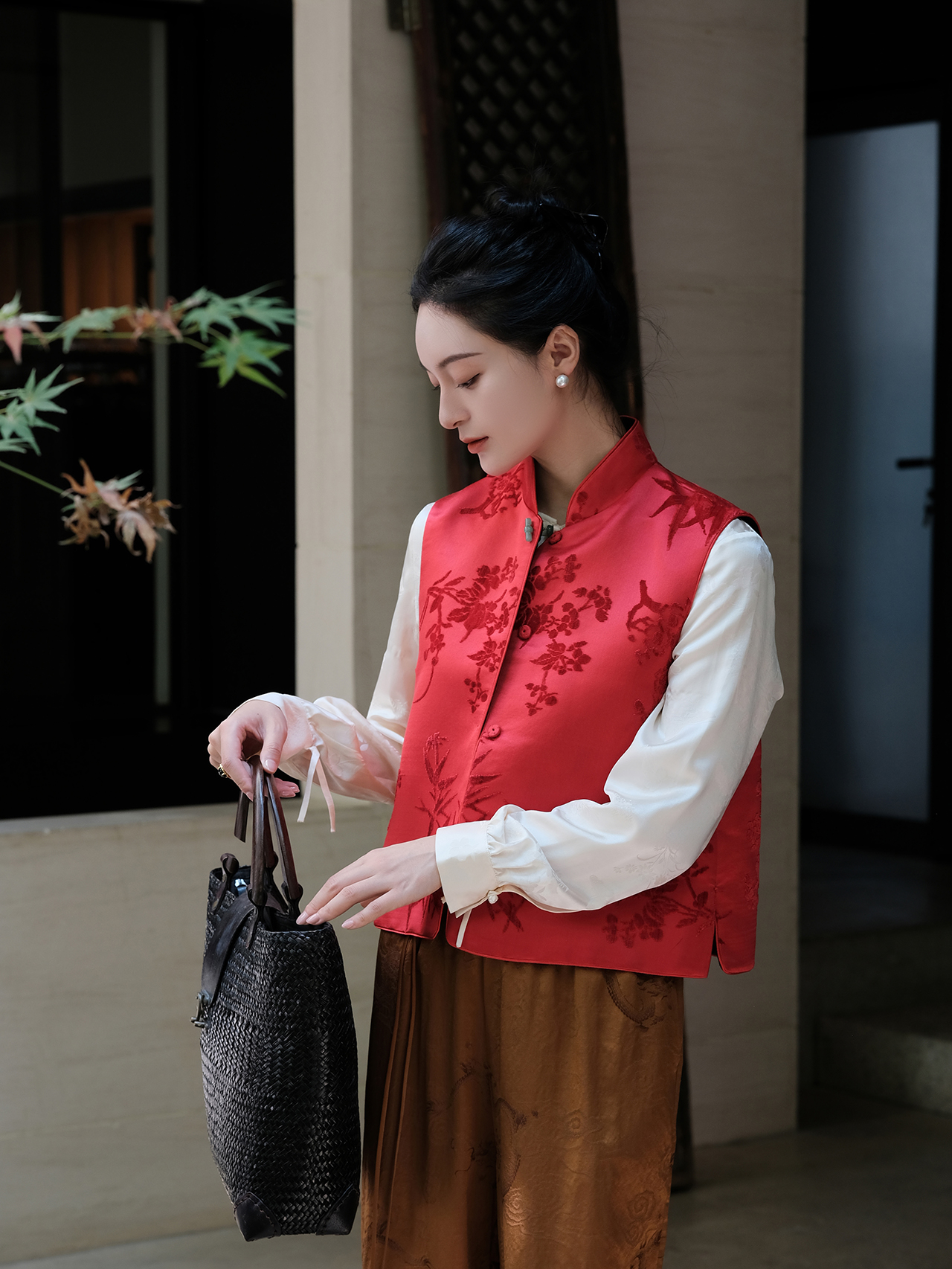盛唐牡丹| 丹罽红梅兰竹菊漳缎马甲 (里素缎)