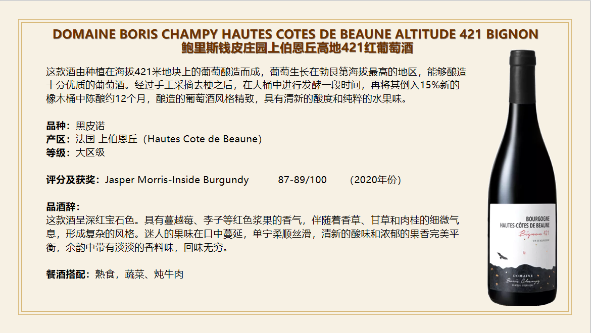【生物动力法!高海拔风土!黑皮诺矿感!】Domaine Boris Champy Hautes Cotes De Beaune Altitude 421 Bignon 2020 750Ml