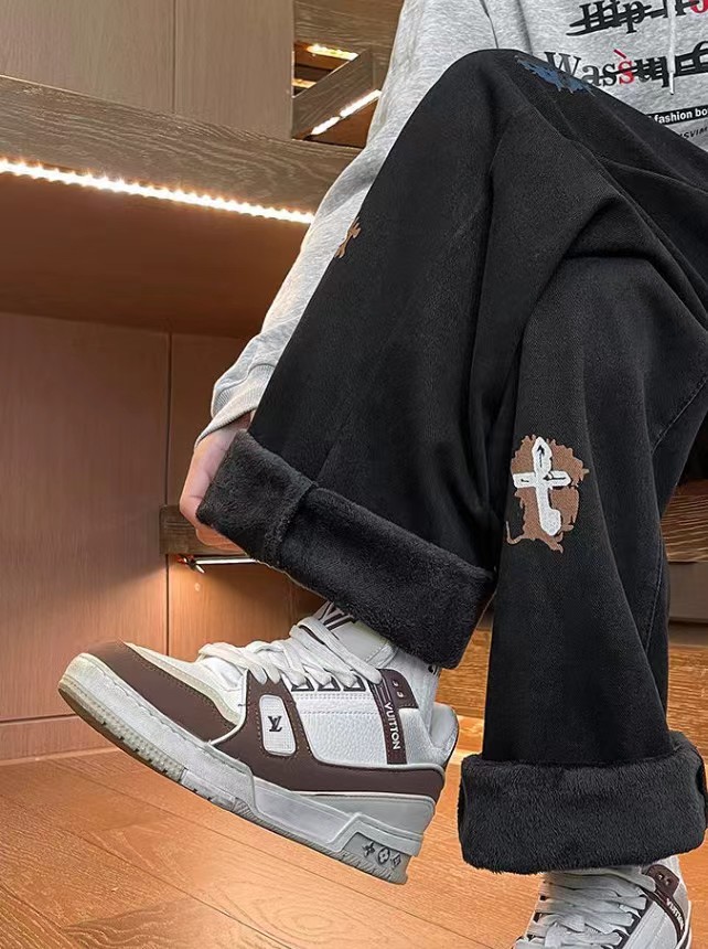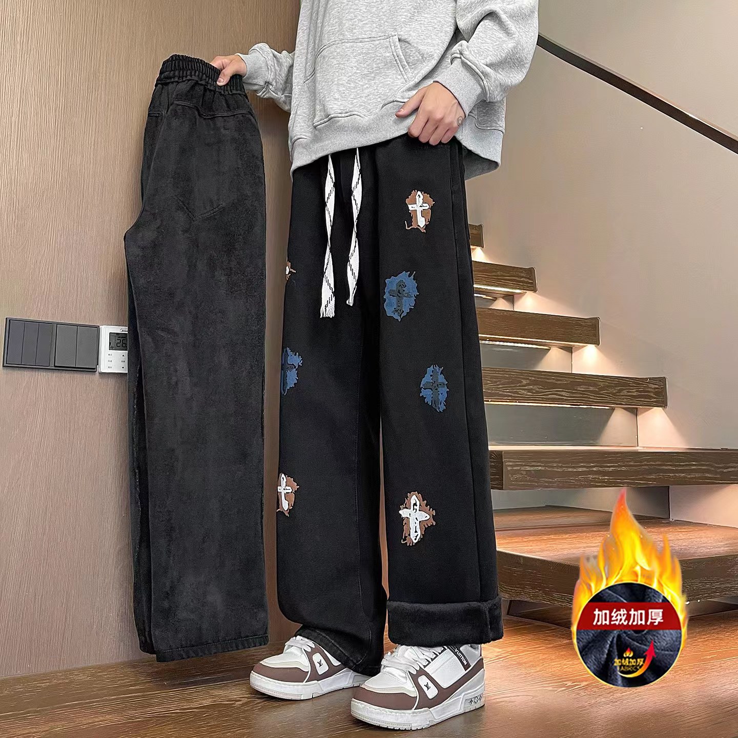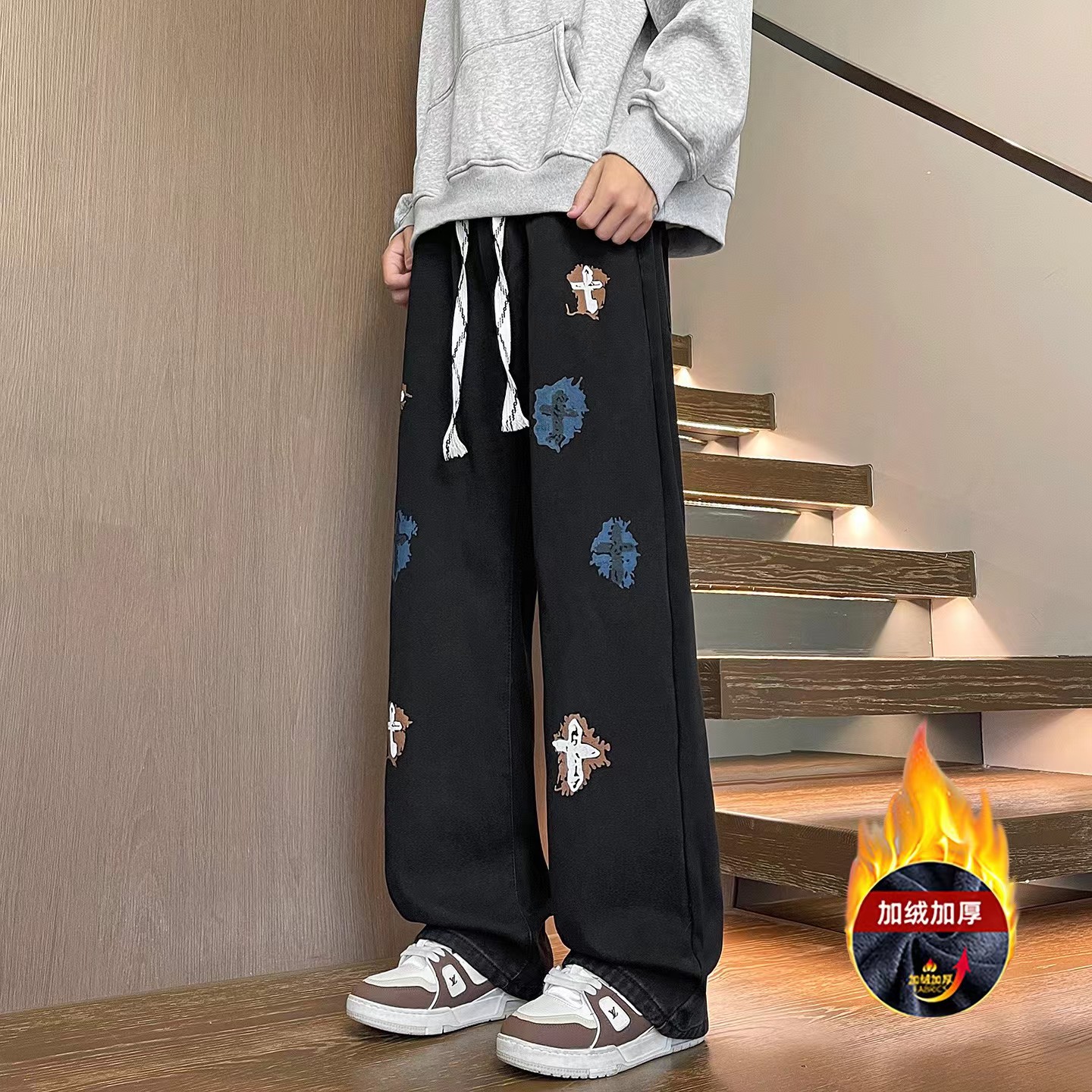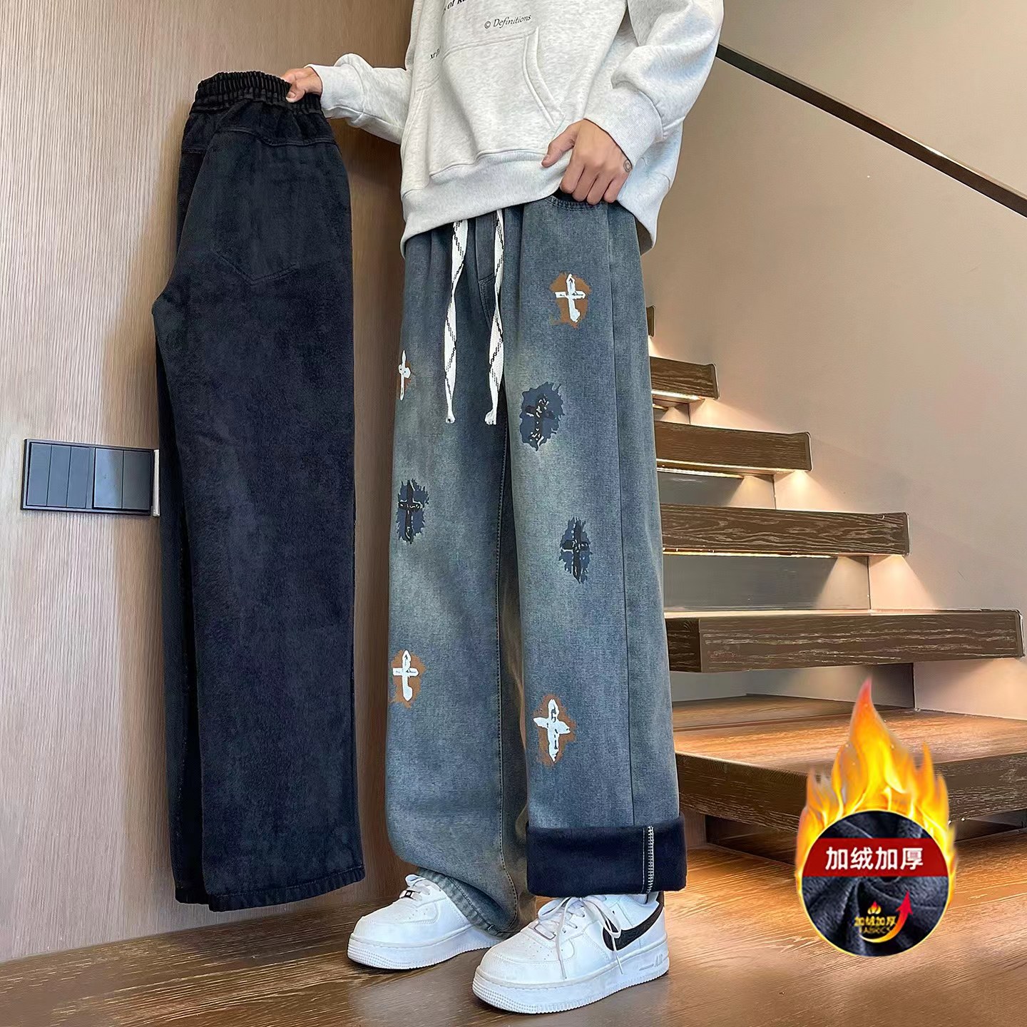 加绒加厚冬季美式高街侧边十字架抽绳卫裤休闲牛仔裤,男女同款。