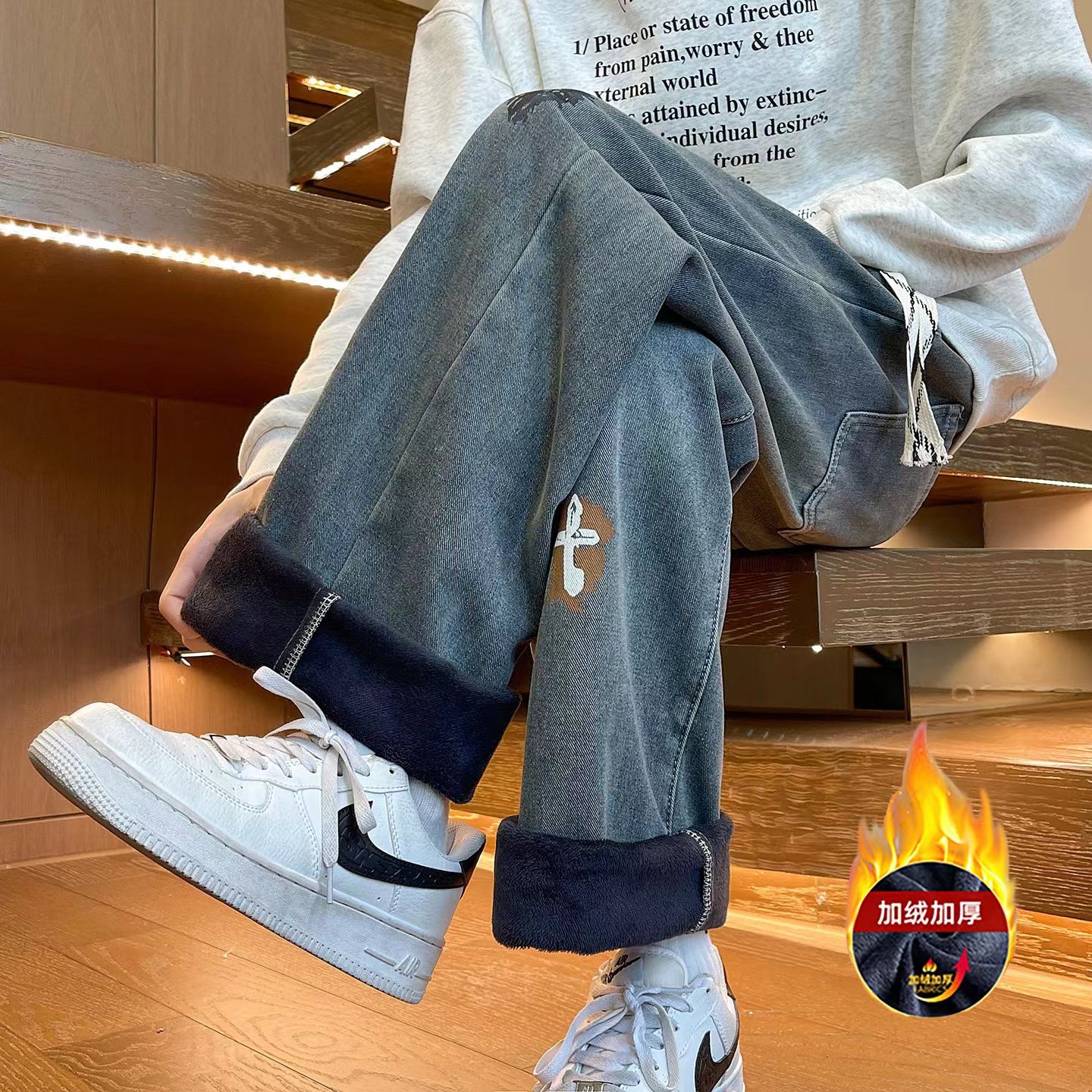 搭配个性渐变水洗工艺,简约又不简单,内里加绒加厚附绒设计,保暖性强。中性宽松百搭版型,不挑人不挑身材,男生女生都可以穿,也可搭配情侣,冬季潮人必备神裤。