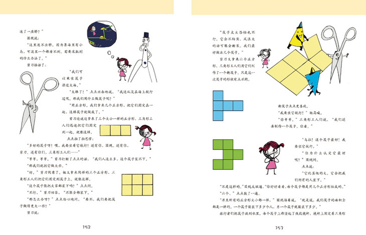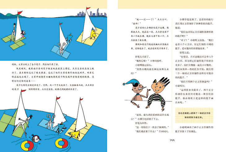 149 点点历险记(如何渡过没有岛屿的大海/乘坐筏子航行/用正方形可以造出什么样的筏子);快乐的小人儿们也用正方形制造筏子(相互对称/轴对称图形)。